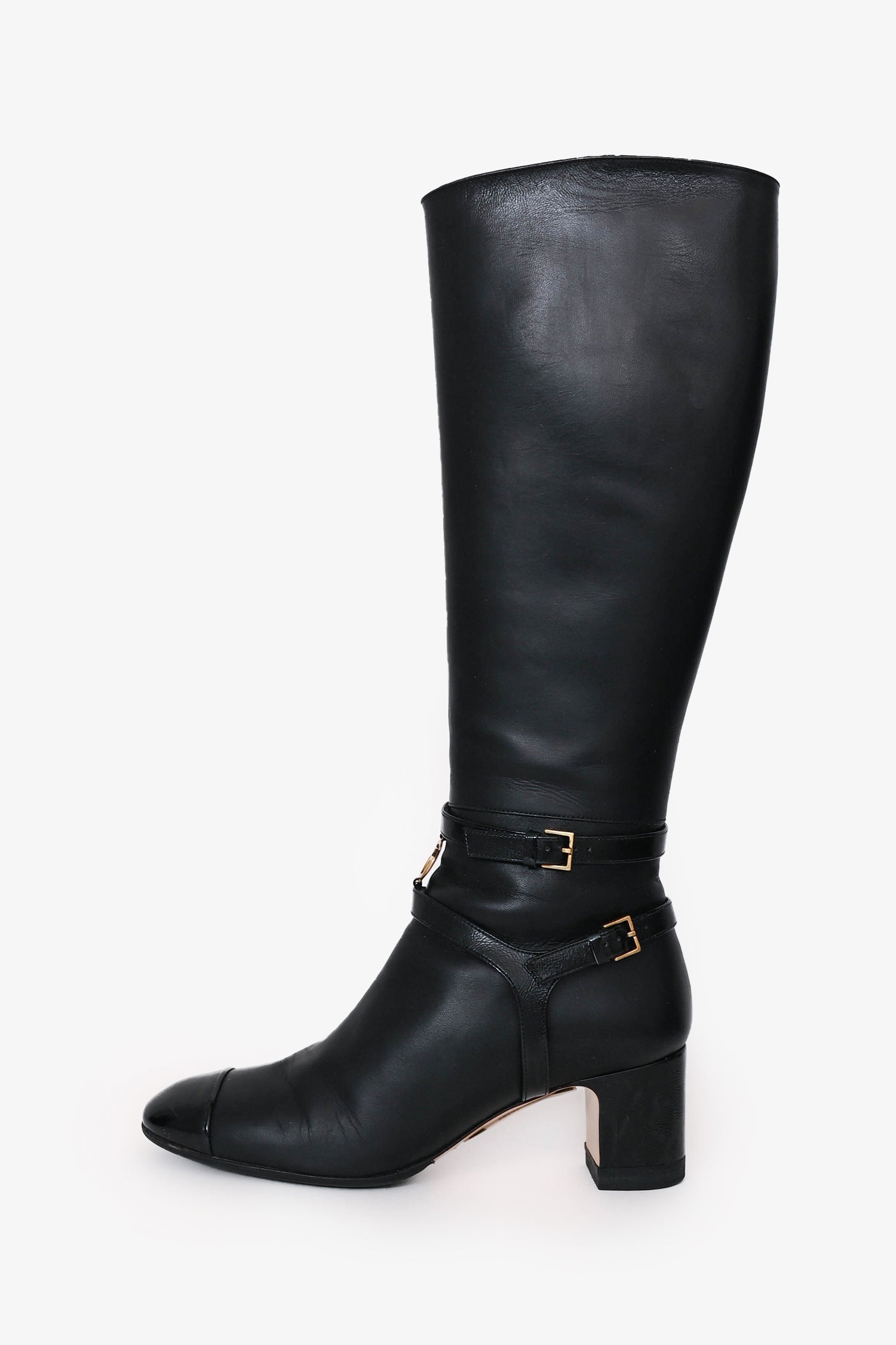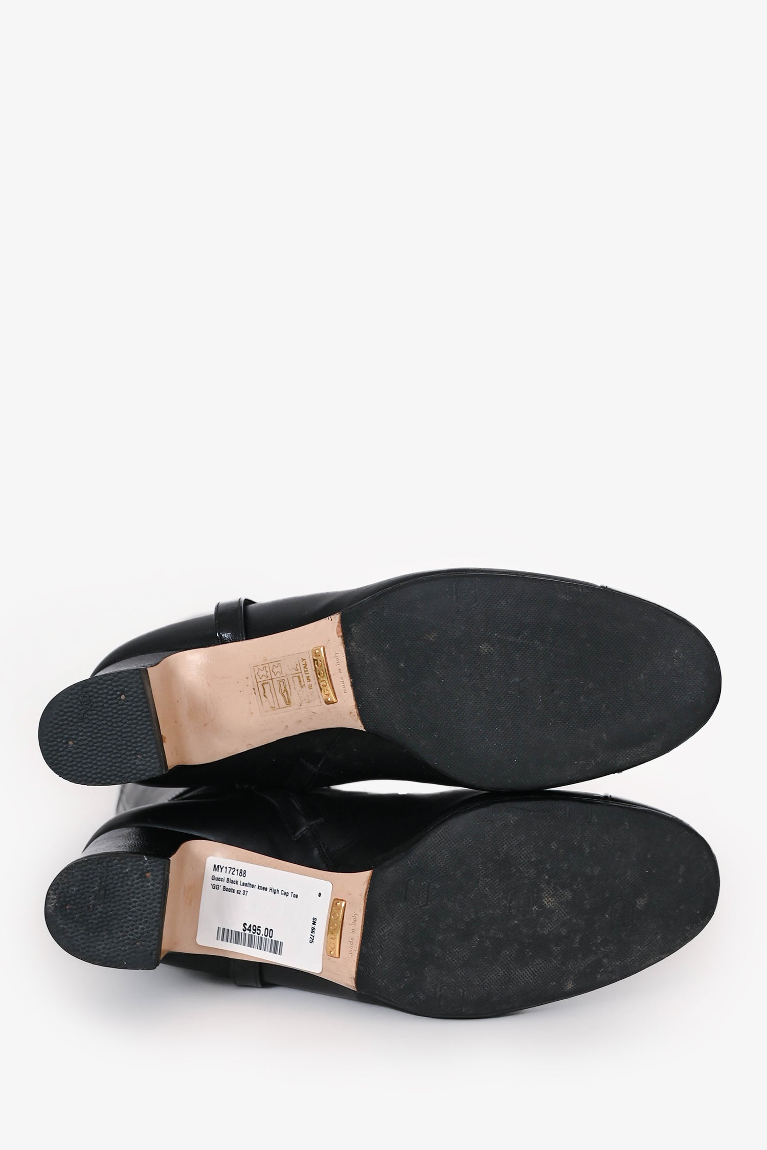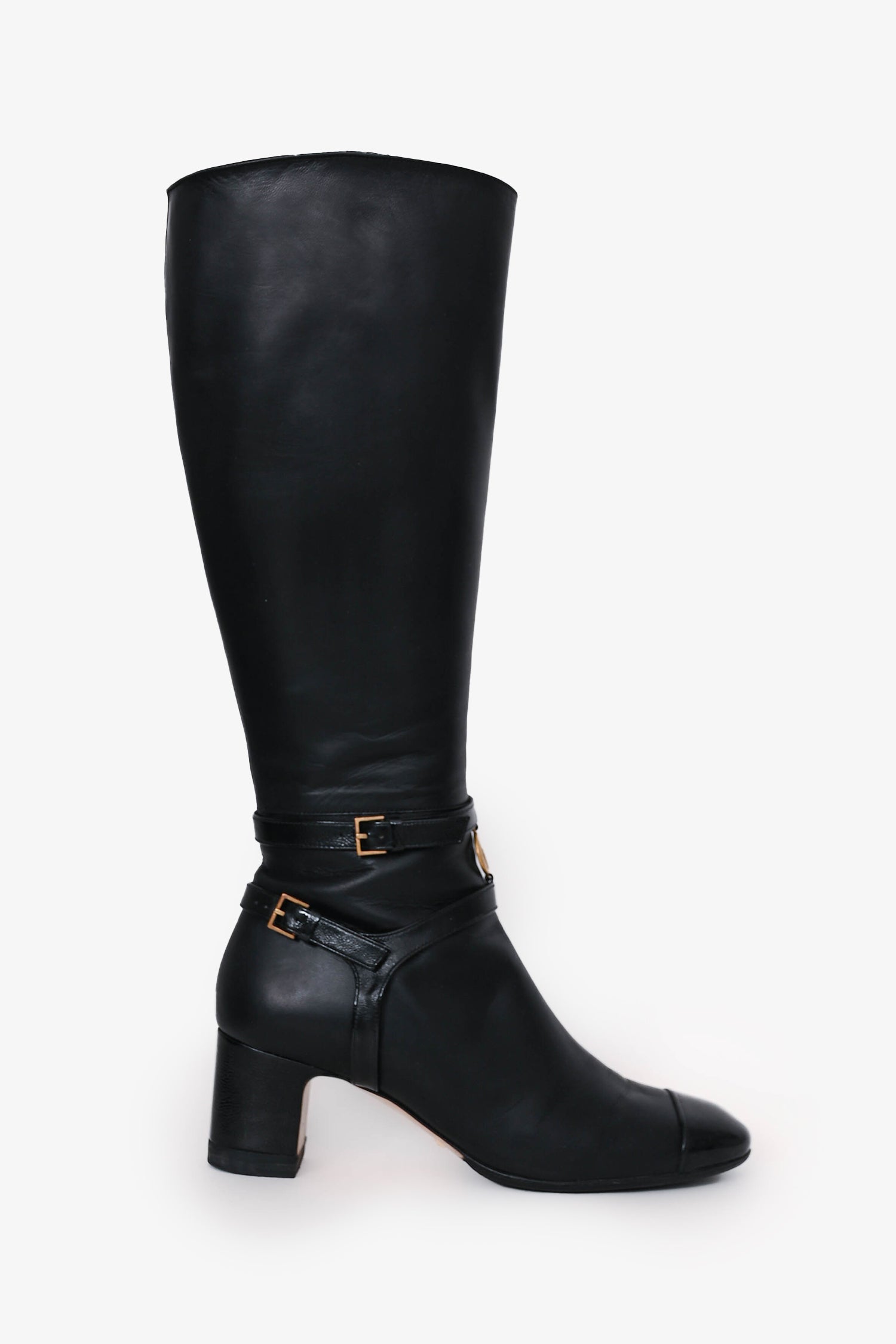 Refresh availabilityGucci Black Leather Knee-High Cap Toe 'GG' Boots. Pull-on. Round toe. Side zip closure. Decorative ankle strap with buckle closure. Leather lining and insole. Gold-tone hardware. Tonal stitching.