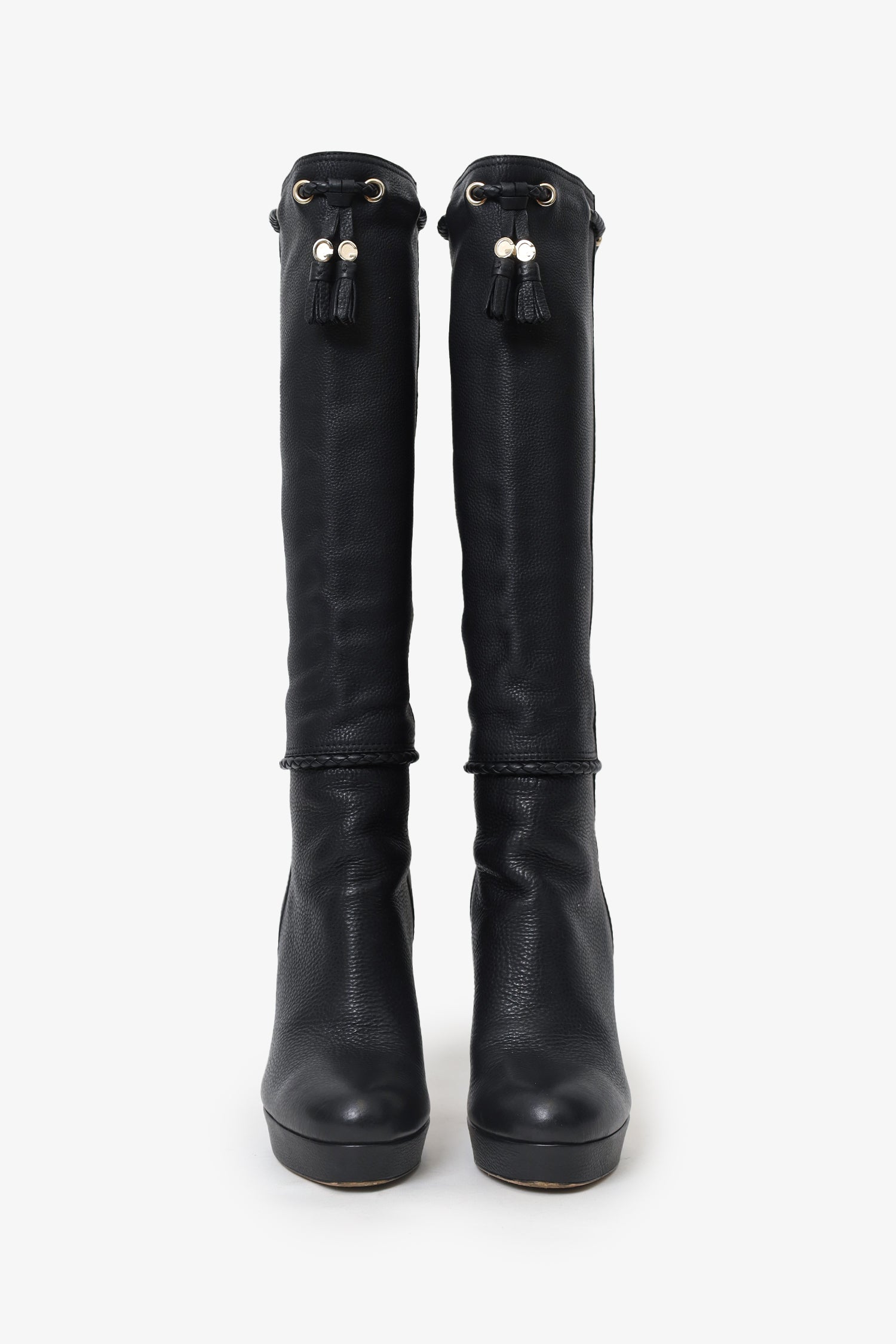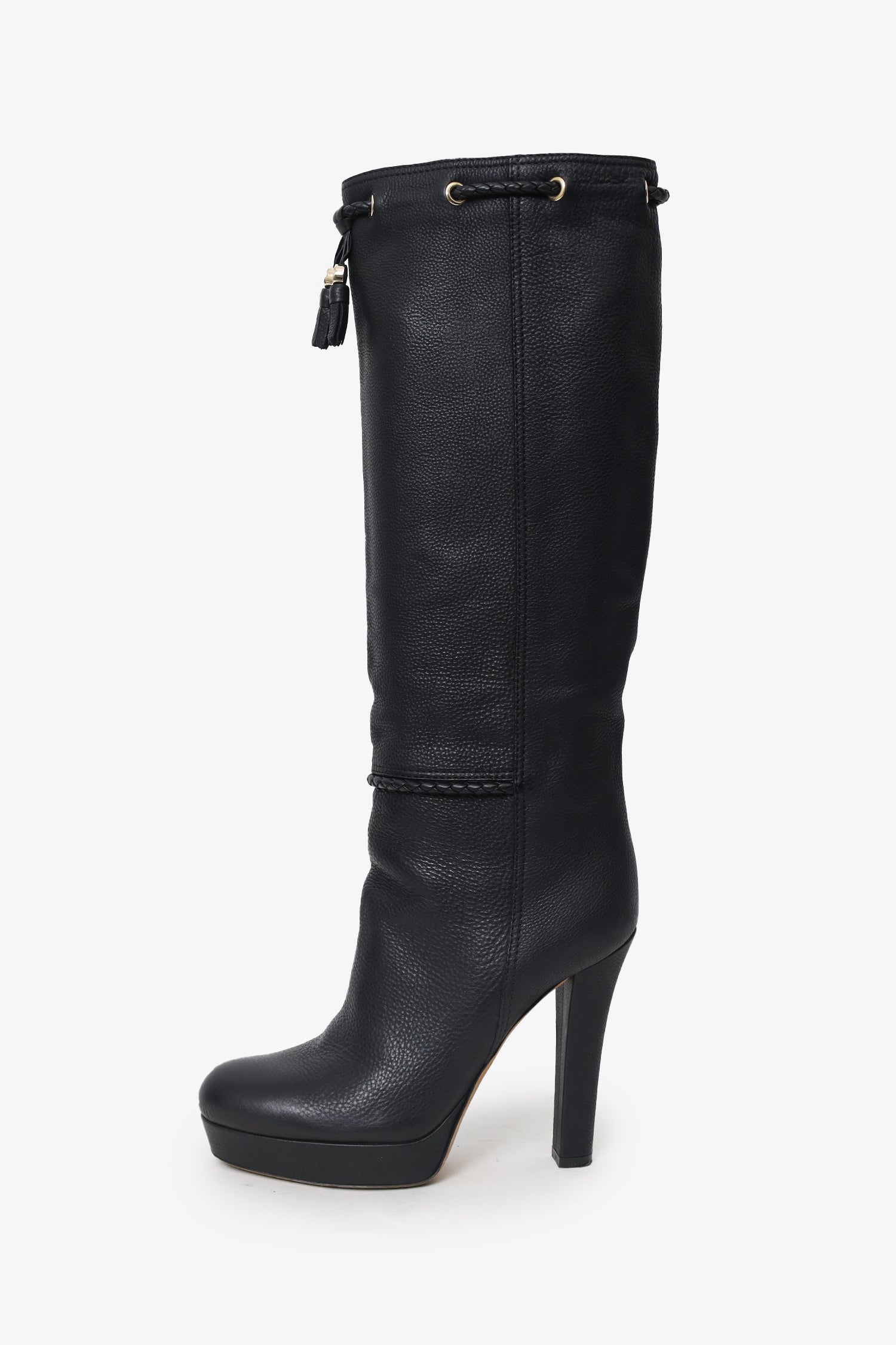 Refresh availabilityGucci Black Leather Knee High Tassel Detail Boots. Pull-on. Round toe. Lined interior. Gold-tone hardware. Tonal stitching.