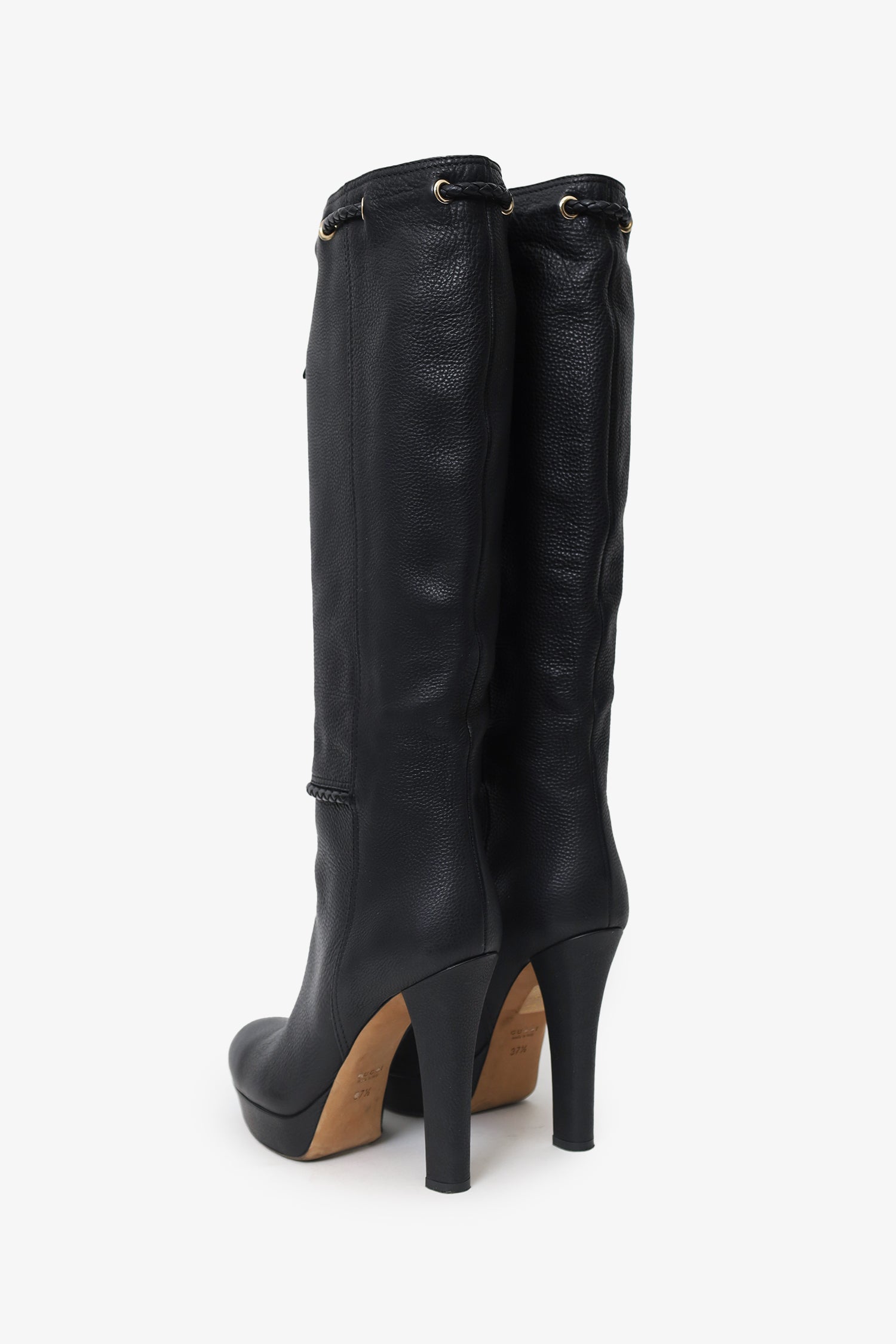 Gucci Black Leather Knee High Tassel Detail Boots Size 37.5