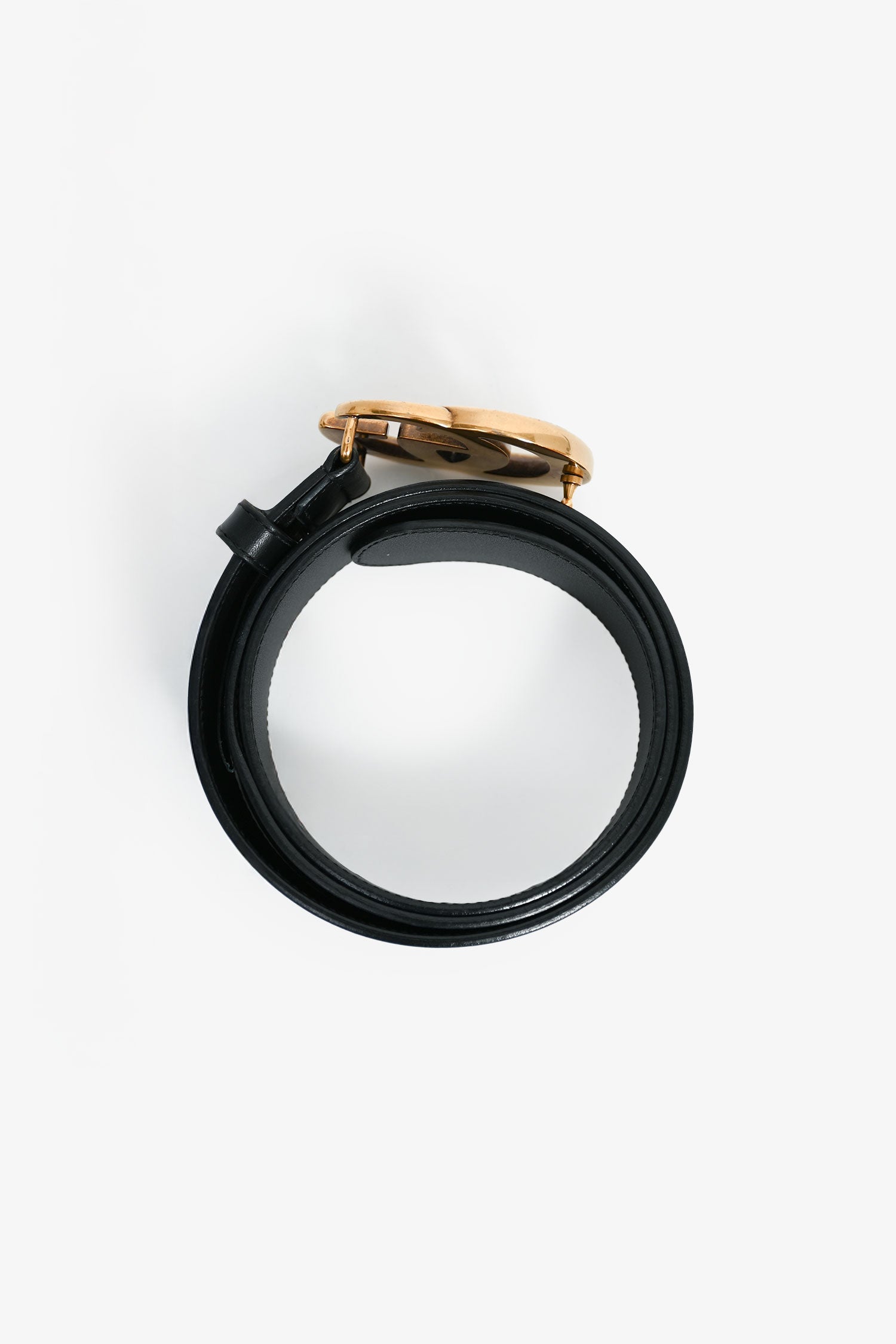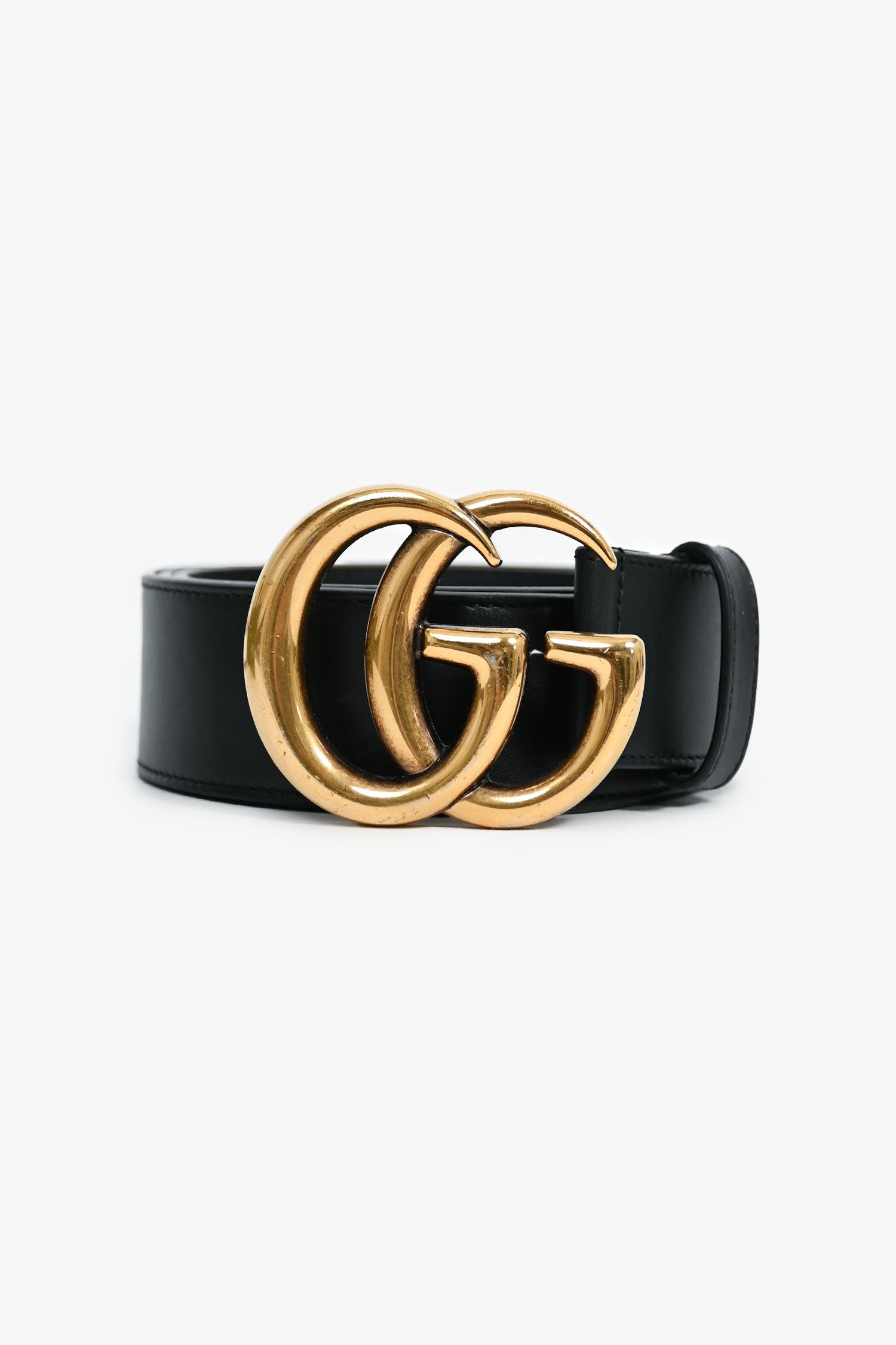 Refresh availabilityGucci Black Leather Marmont GG Belt. Gold-tone hardware. Adjustable pull-through buckle closure. Tonal stitching.