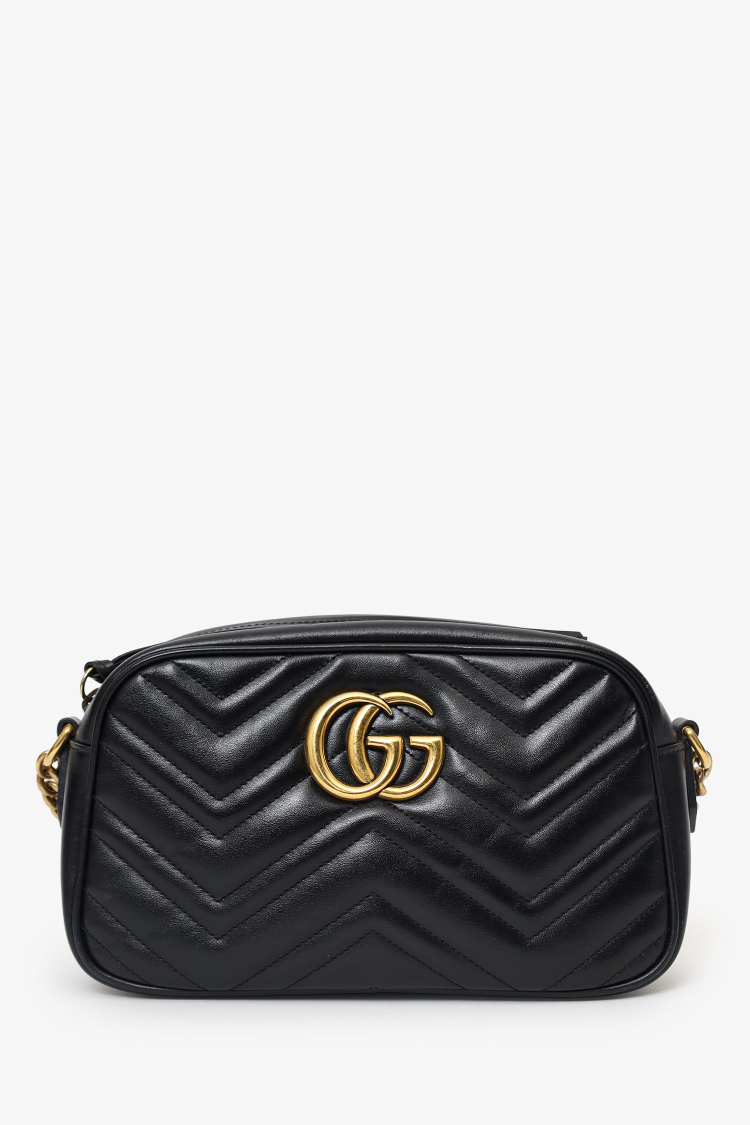 Refresh availabilityGucci Black Leather Marmont Matelasse Camera Bag. Top zip closure. Adjustable crossbody strap. Lined interior with single rear slip pocket. Gold-tone hardware. Tonal stitching.