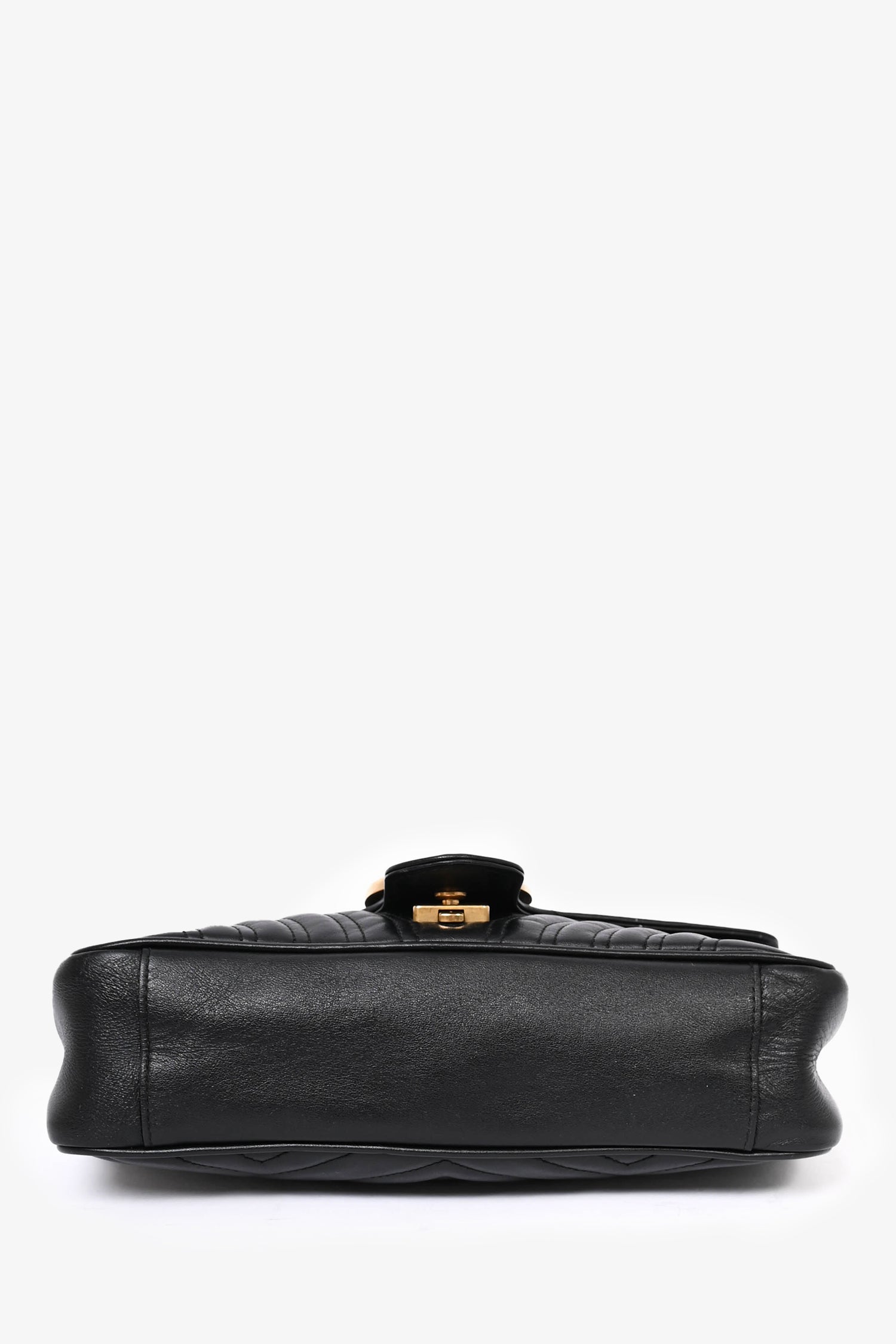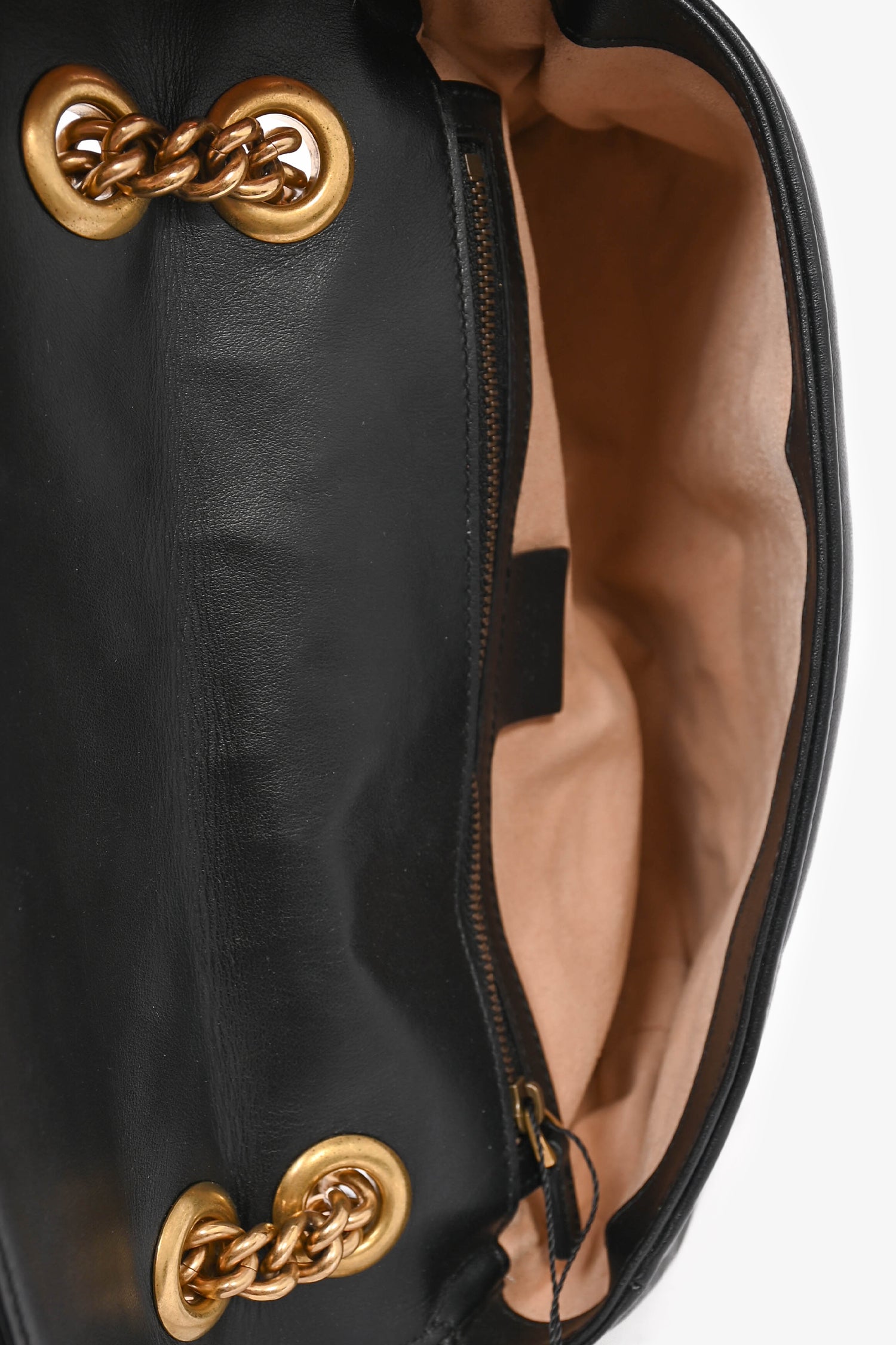 Refresh availabilityGucci Black Leather 'Marmont' Small Shoulder Bag. Tonal stitching. Antiqued hardware. Push-open closure. Chain-link shoulder strap with leather accents. Zipped interior. Suede lined interior.