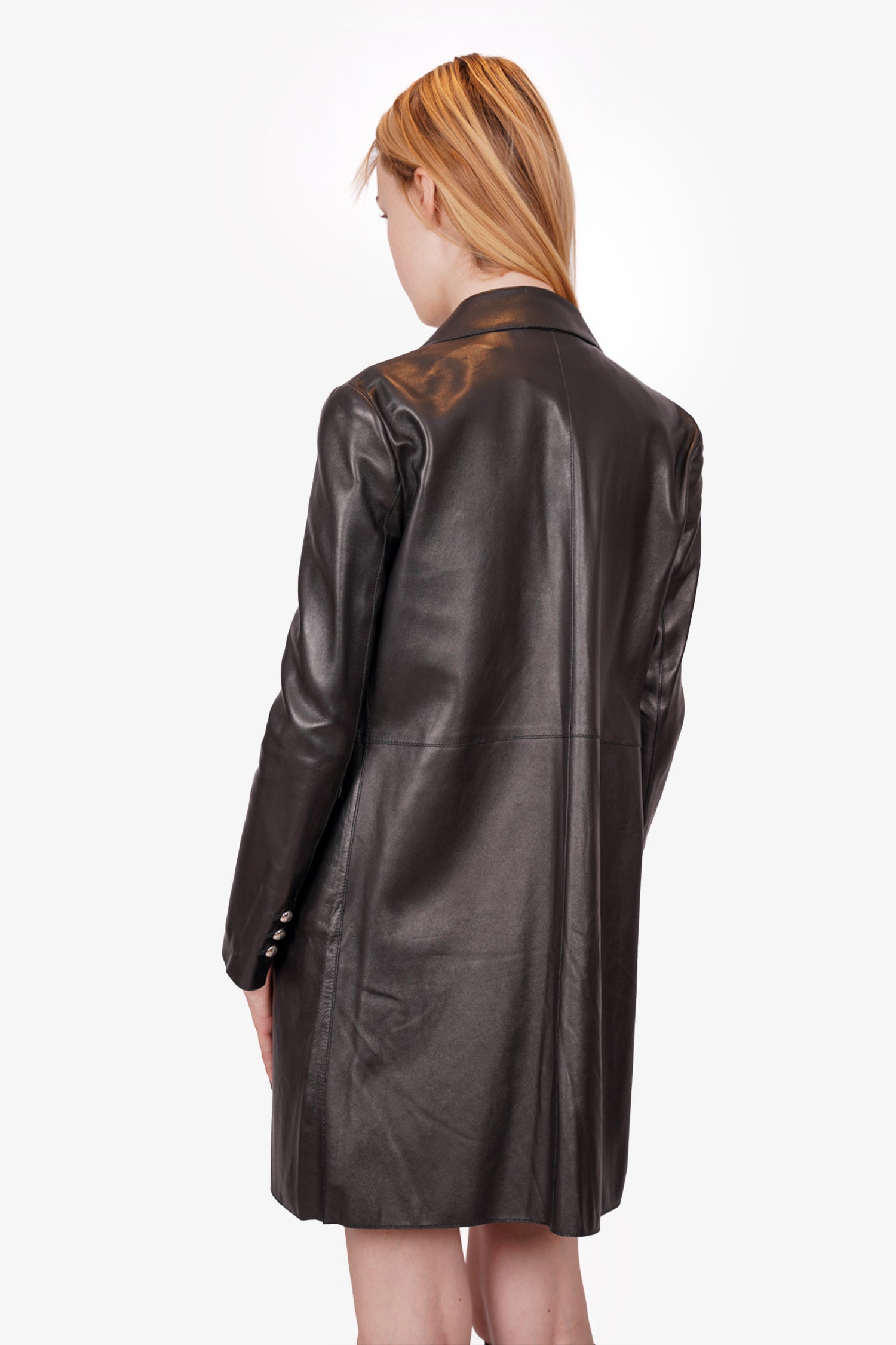 Gucci Black Leather Mid Length Coat. Front button-up closure. Front pockets. Silver-tone hardware. Unlined. Tonal stitching.
