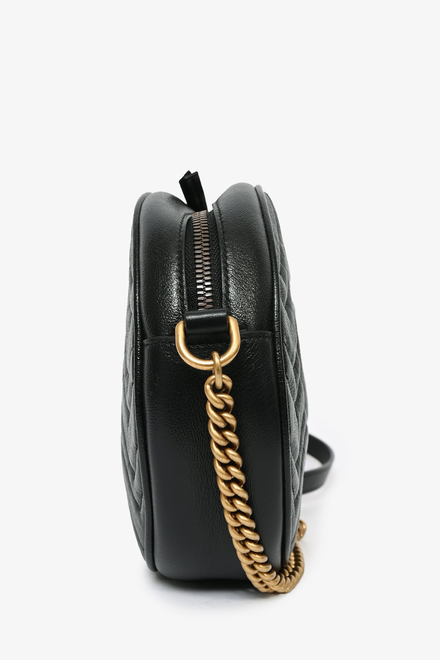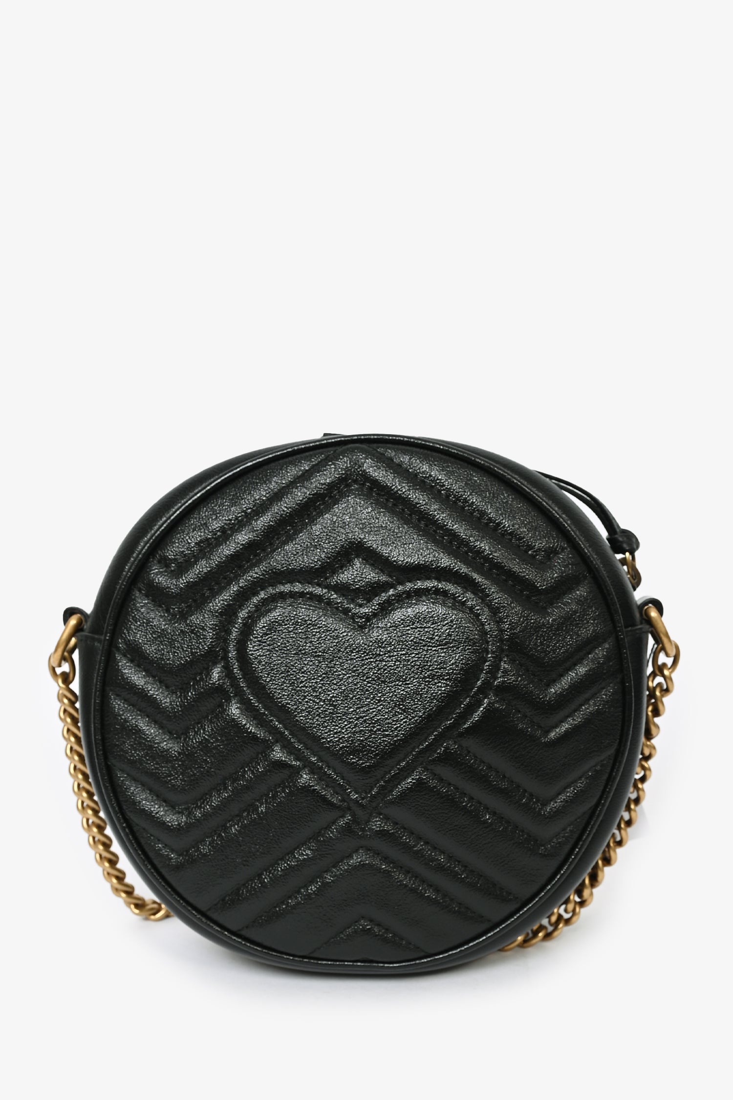 Refresh availabilityGucci Black Leather Mini Marmont Round Matelasse Crossbody Bag. Gold-toned hardware. Chain-link shoulder strap. Tonal stitching. Suede interior. Zipper at top.