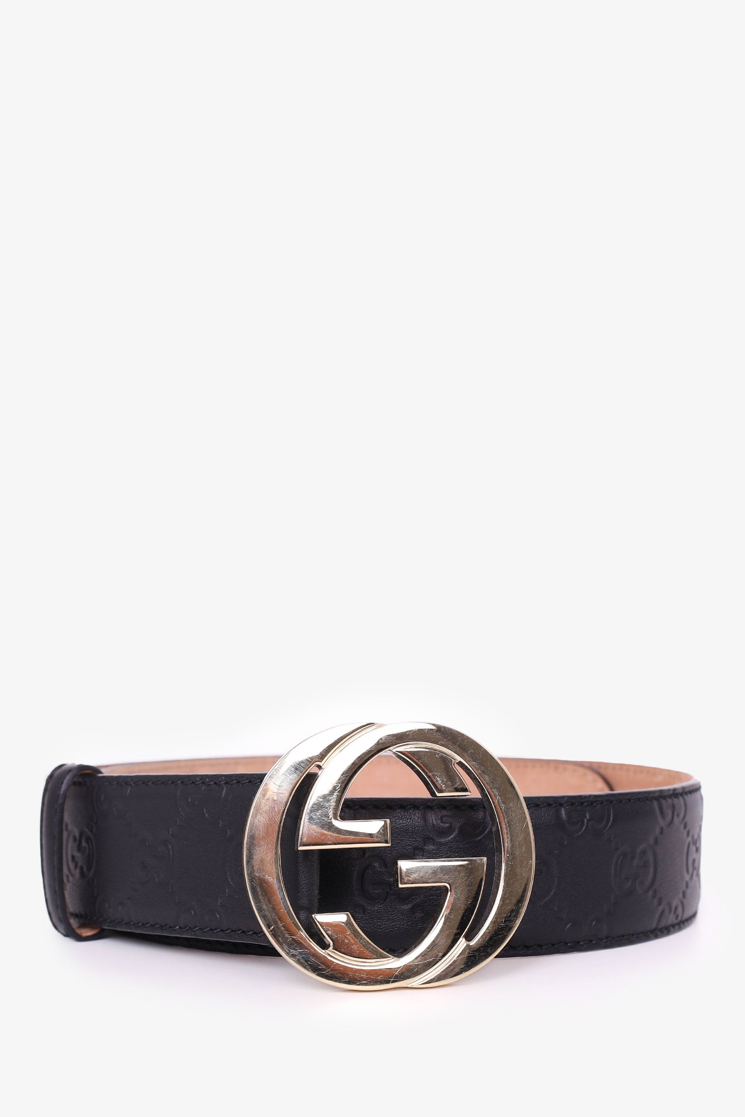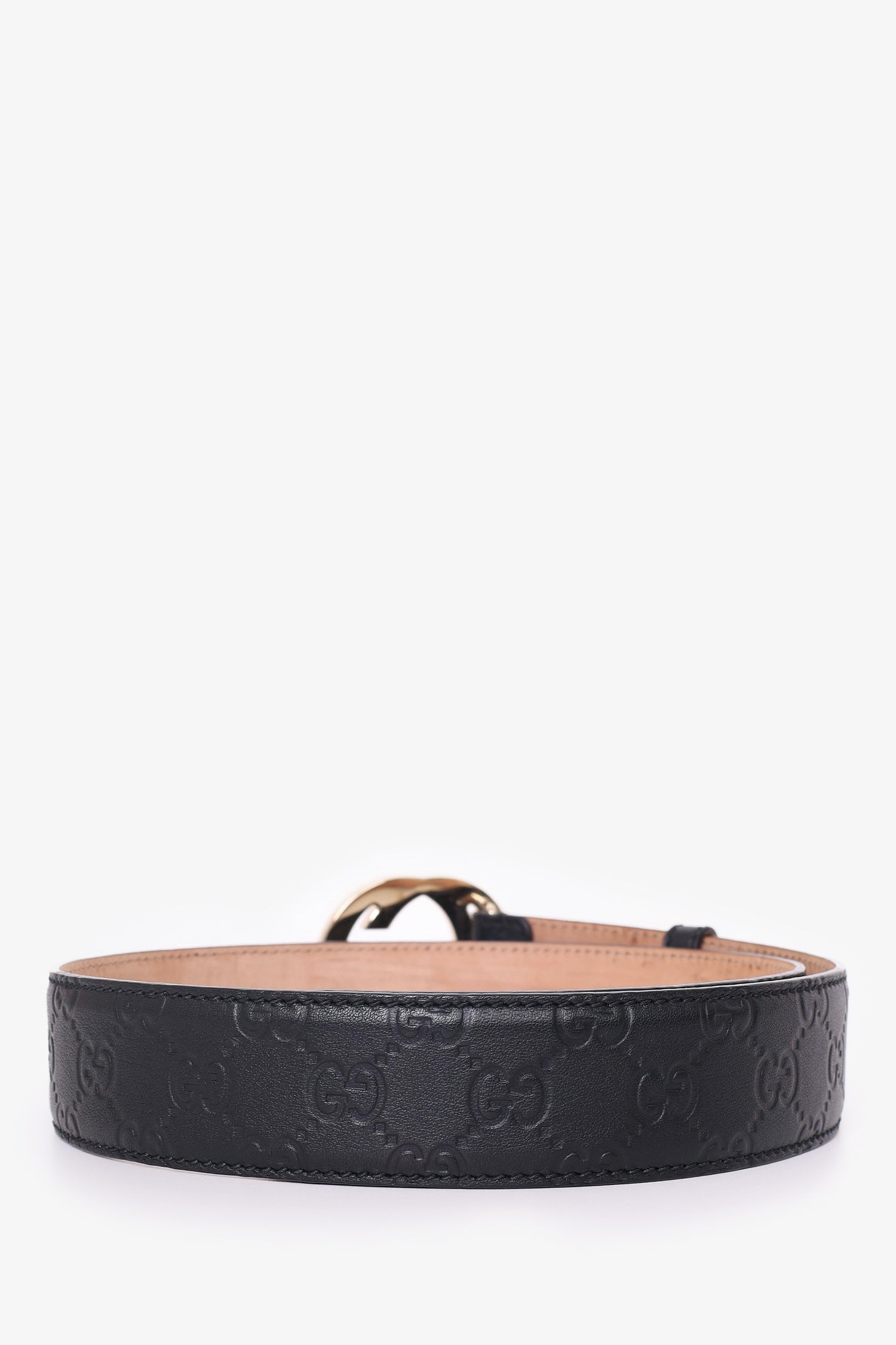 Refresh availabilityGucci Black Leather Monogram Belt. Adjustable pull-through buckle closure. Tonal stitching. Light gold-tone hardware.