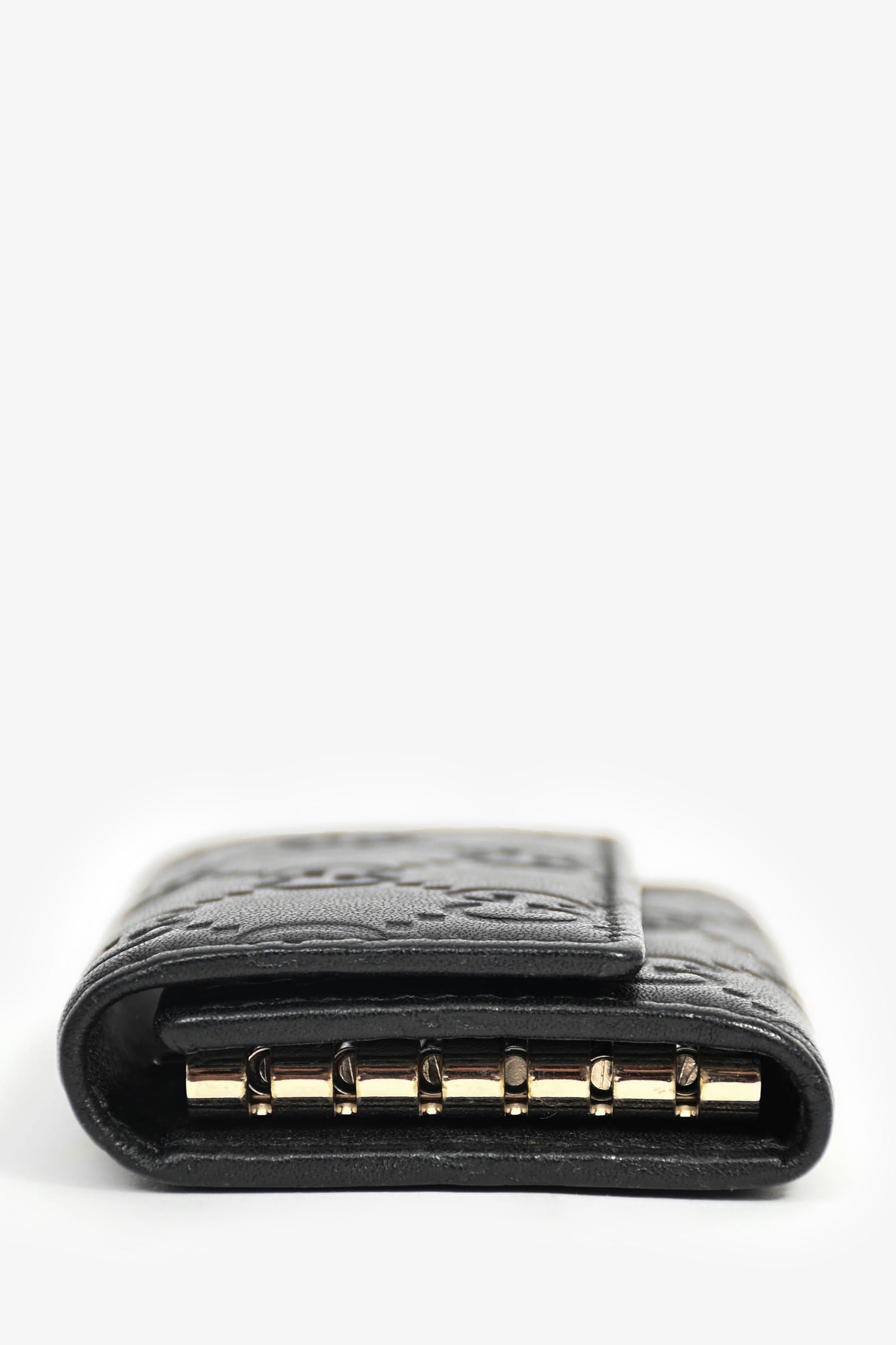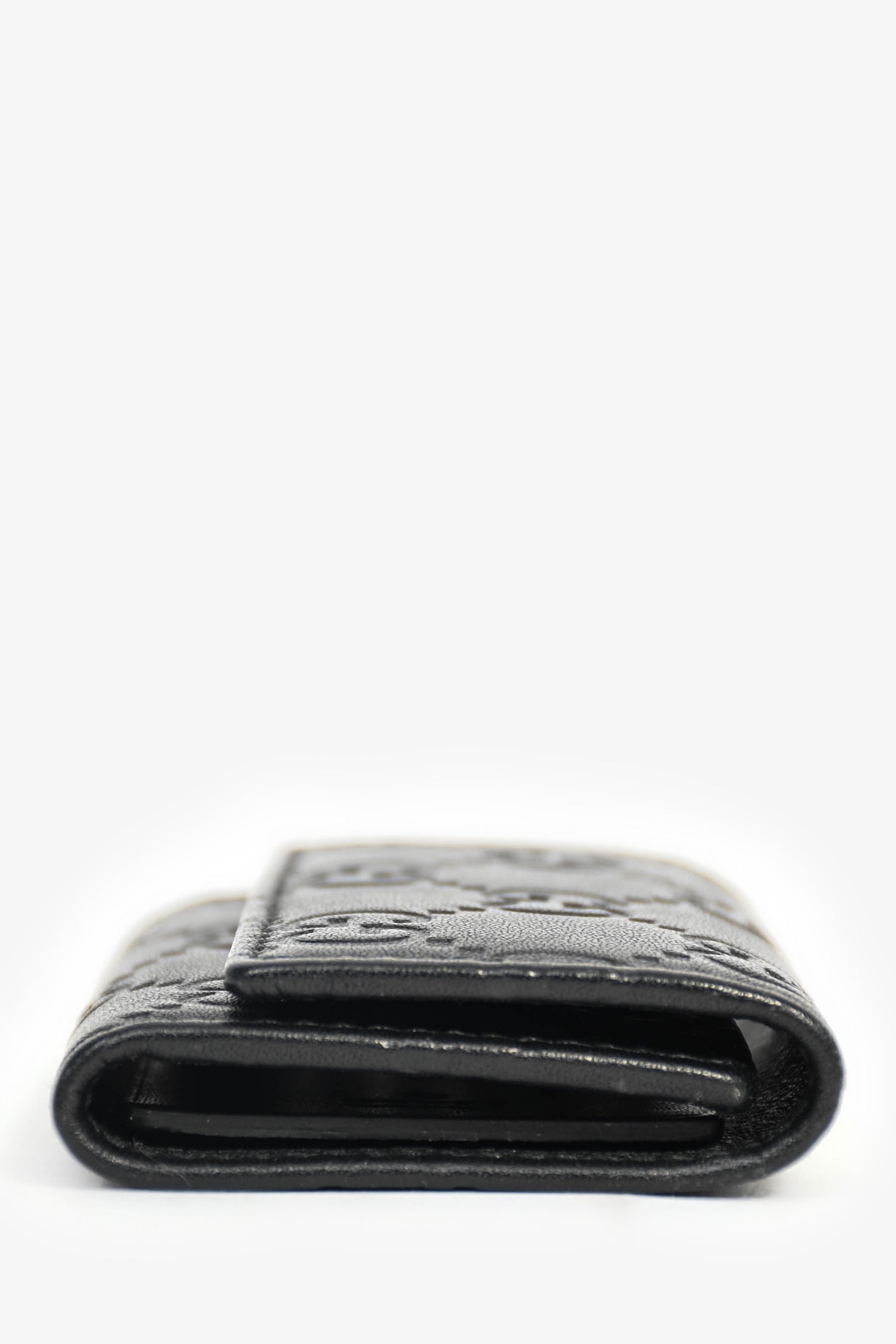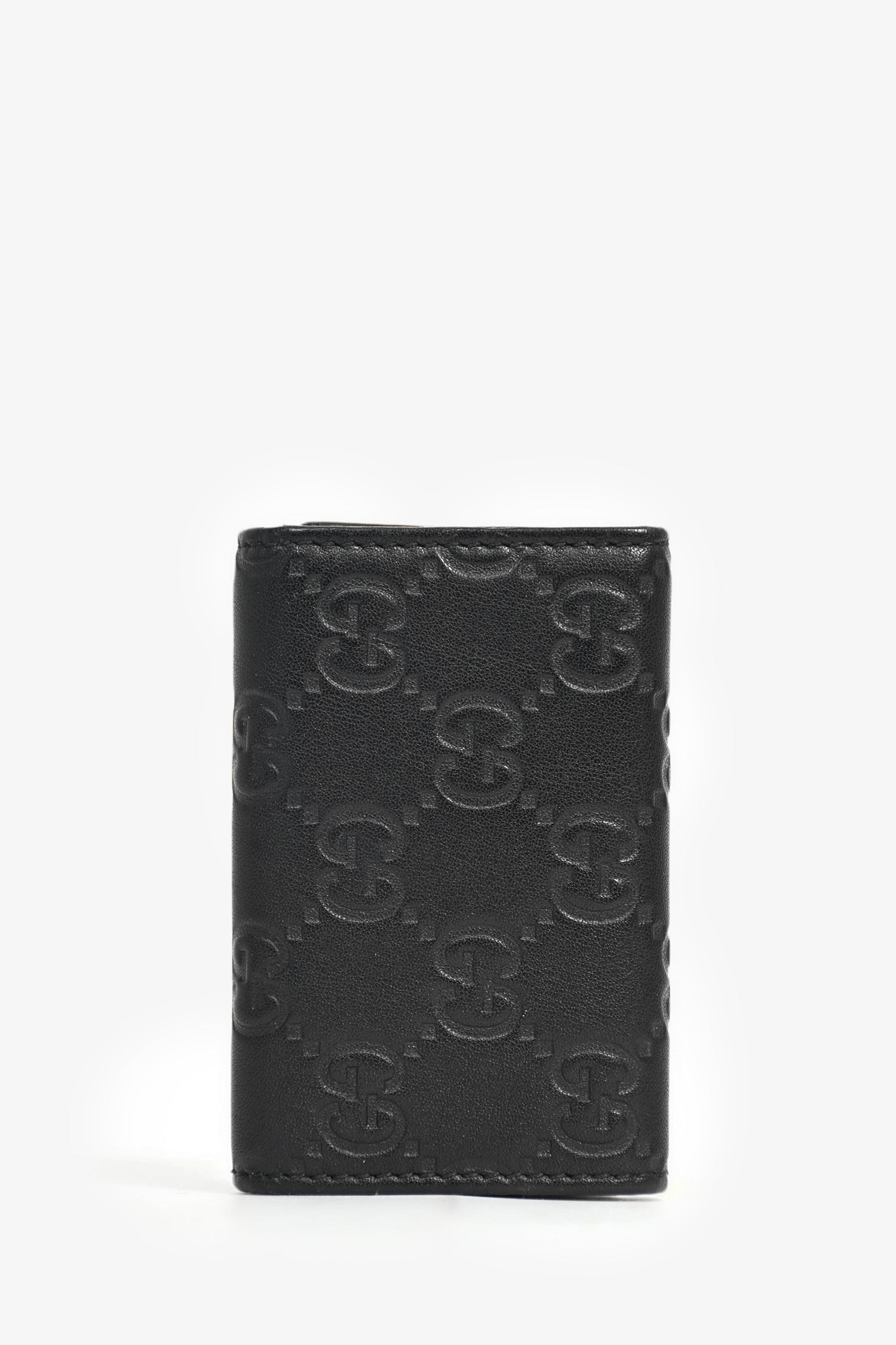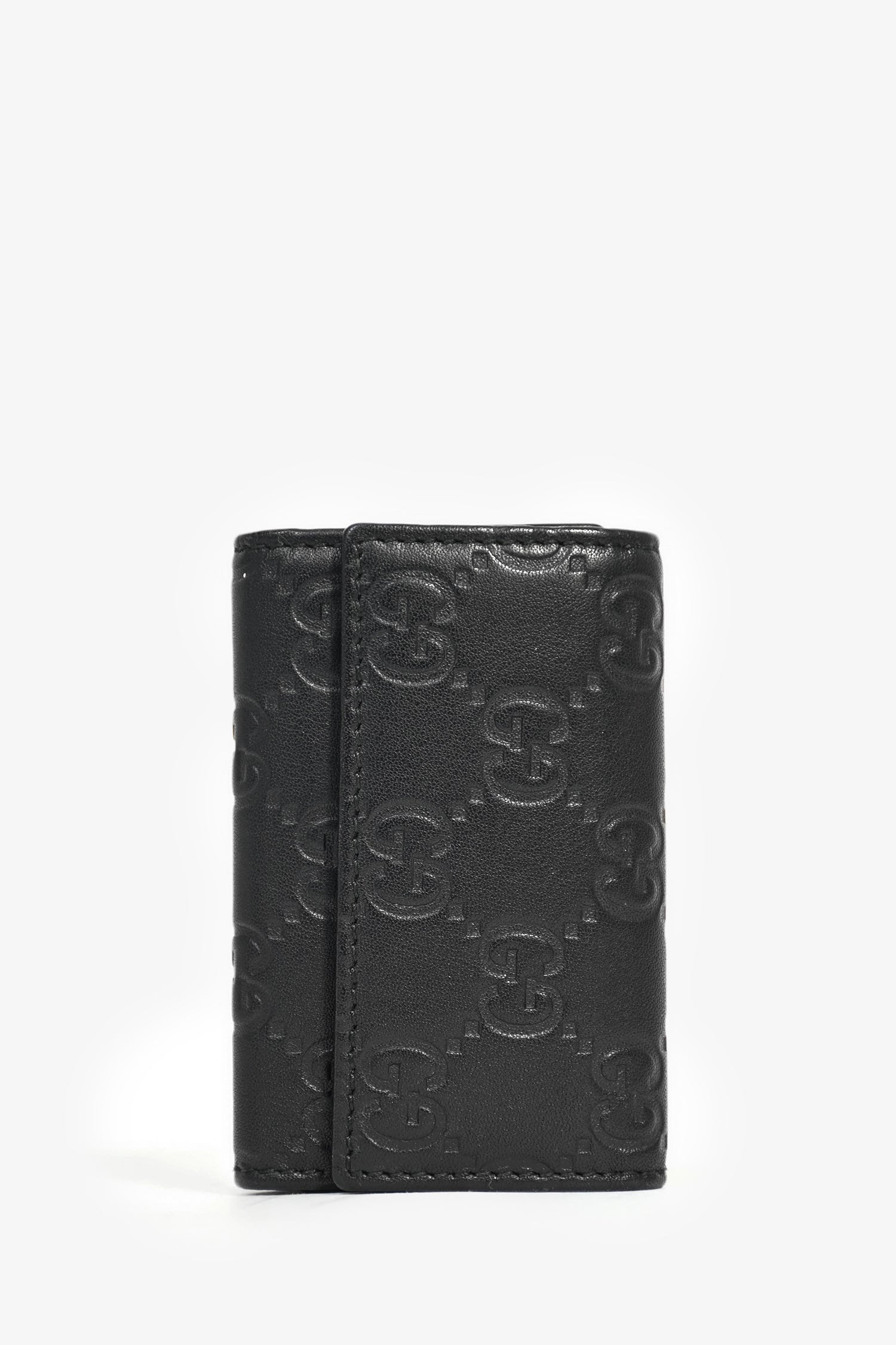 Refresh availabilityGucci Black Leather Monogram Key Case. Fold-over flap with a snap closure. 6 key rings. Leather trimming. Gold-tone hardware. Tonal stitching.