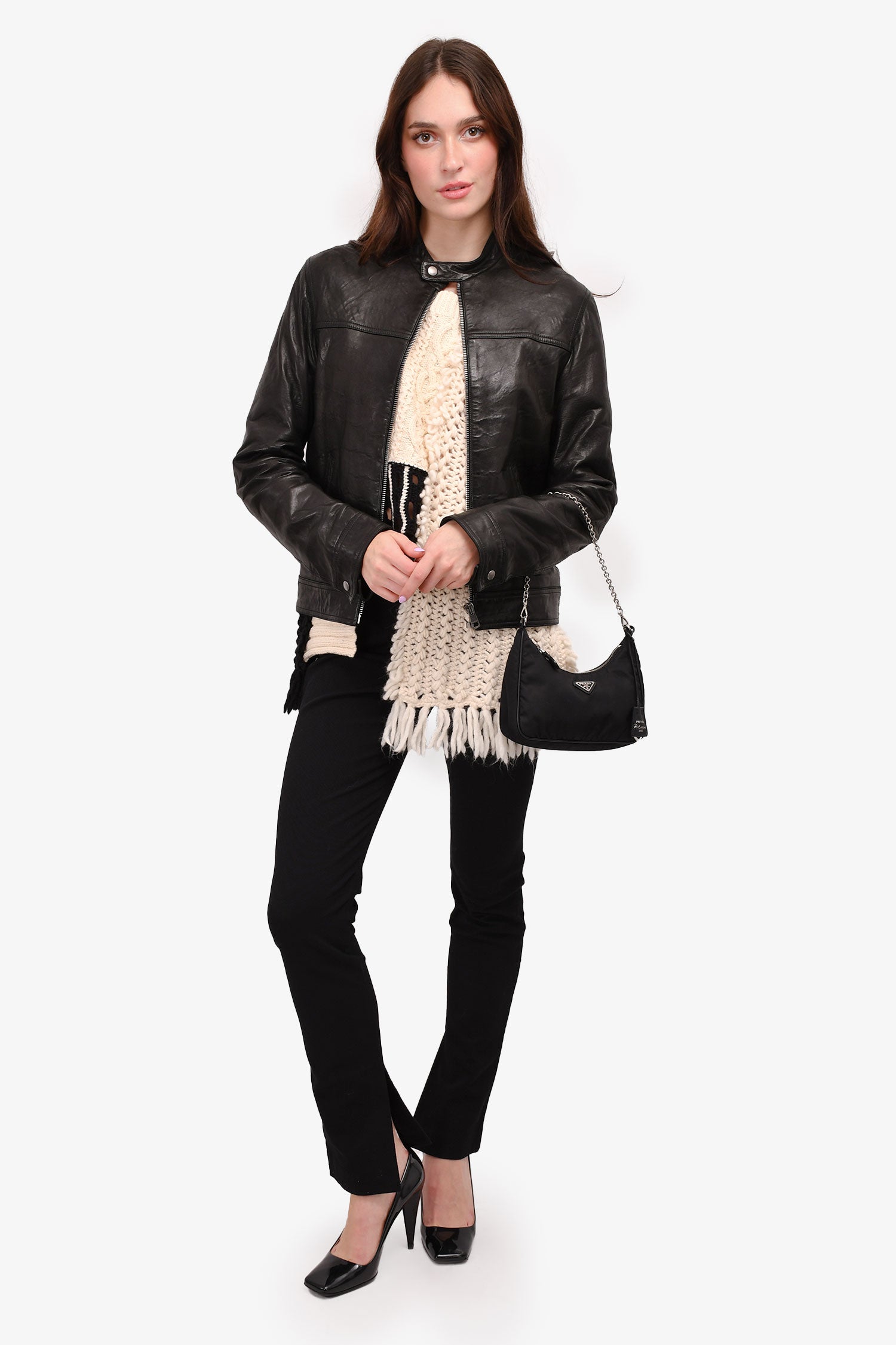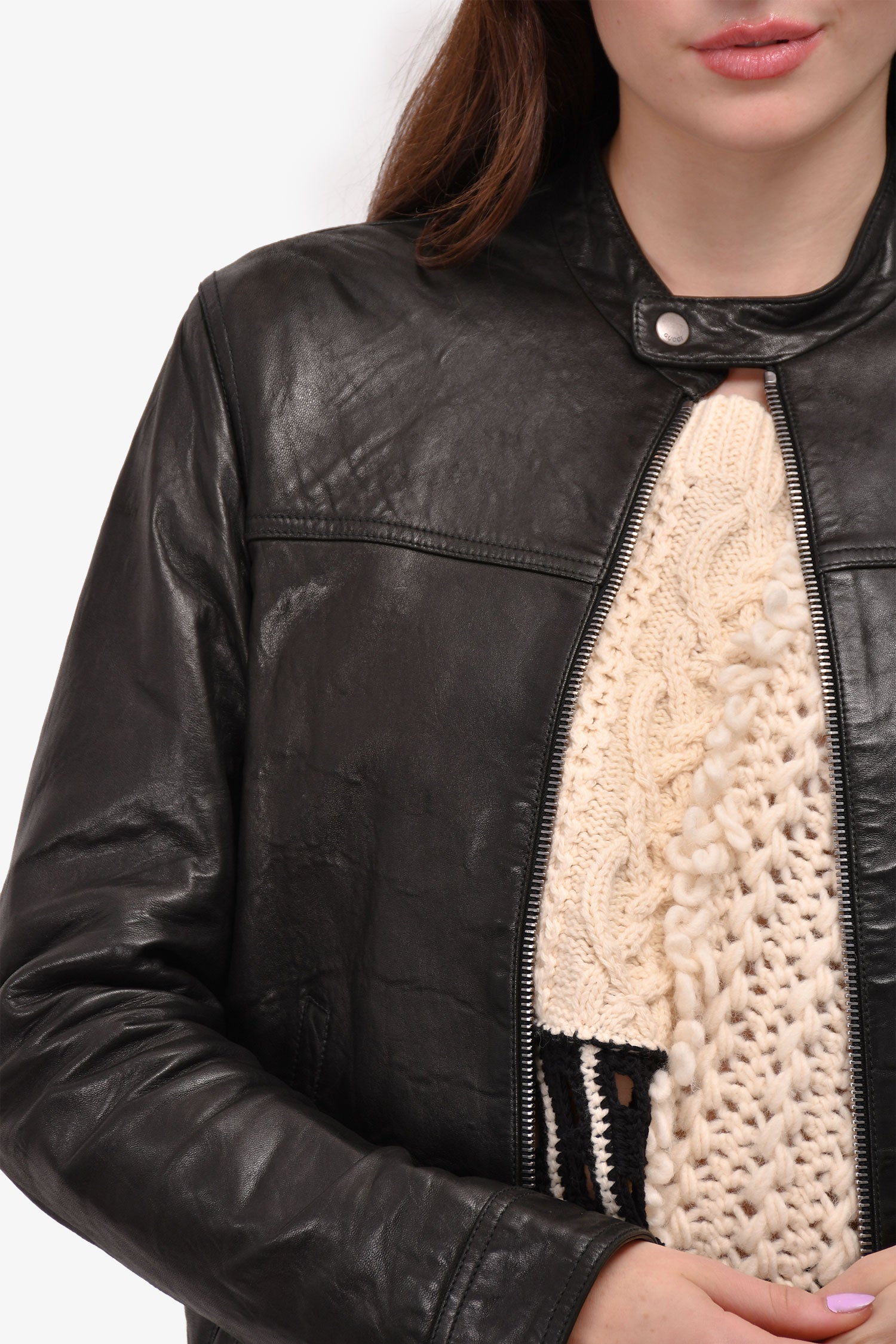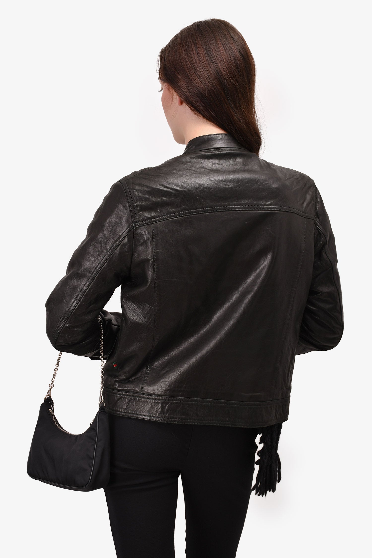 Refresh availabilityGucci Black Leather Motorcycle Jacket. Tonal stitching. Antiqued silver-tone hardware. Red lining.