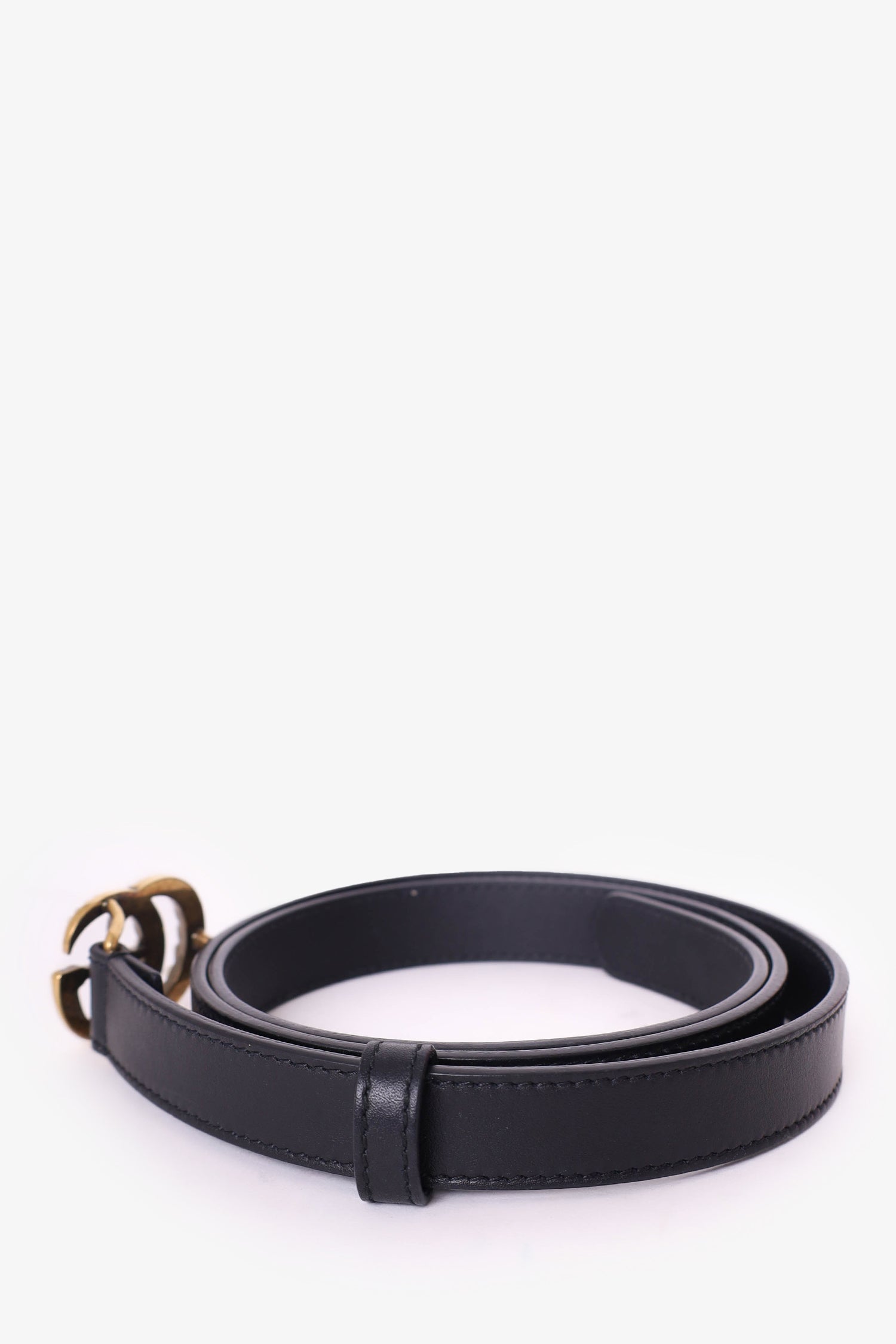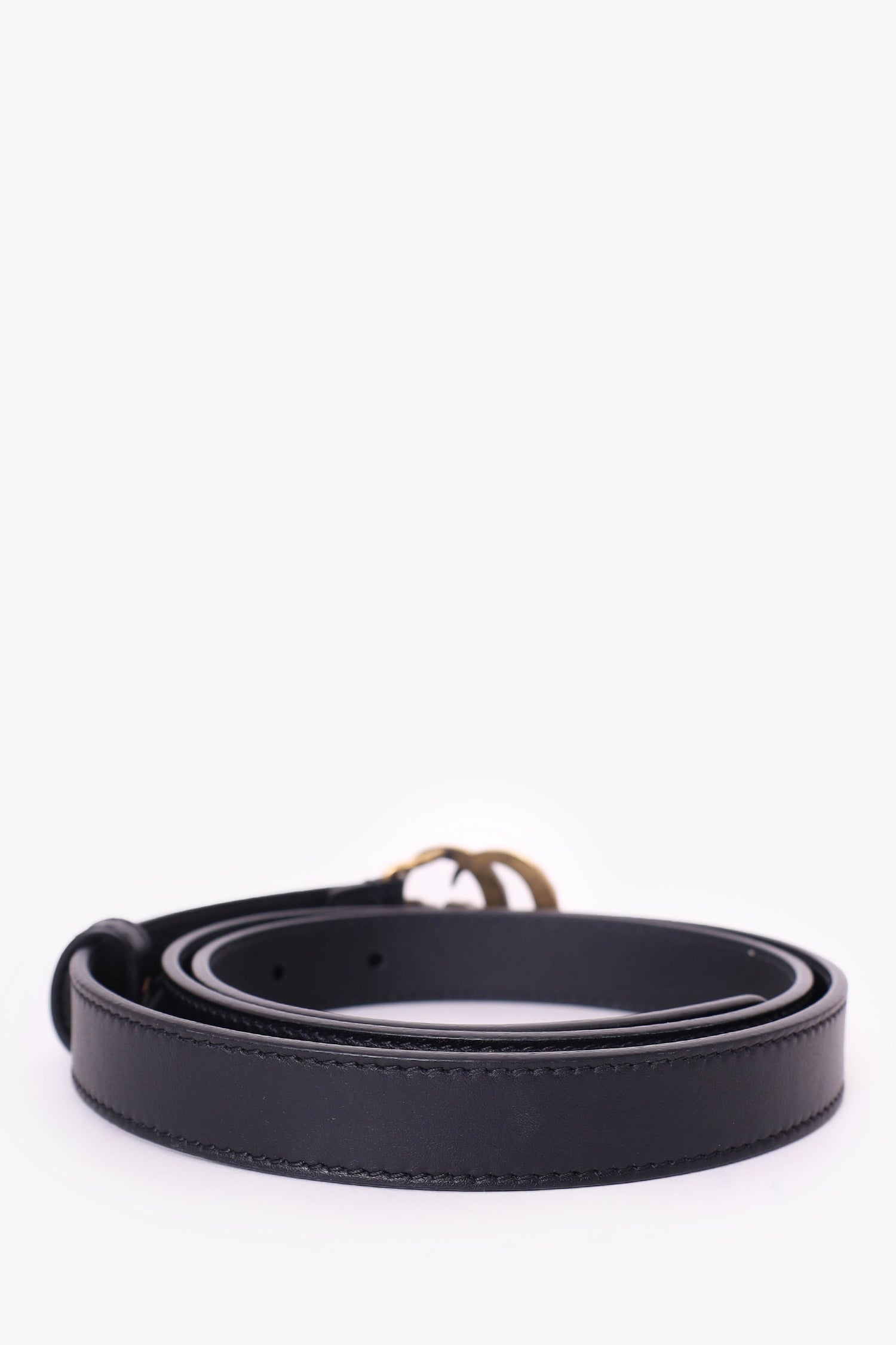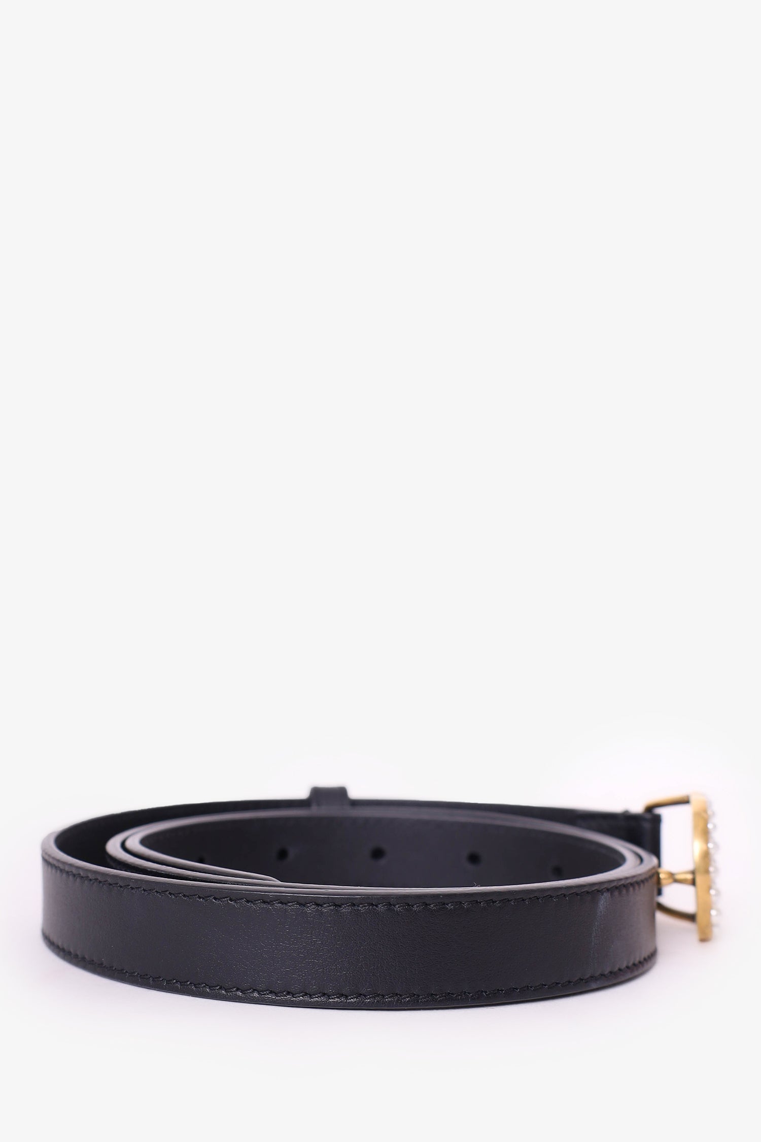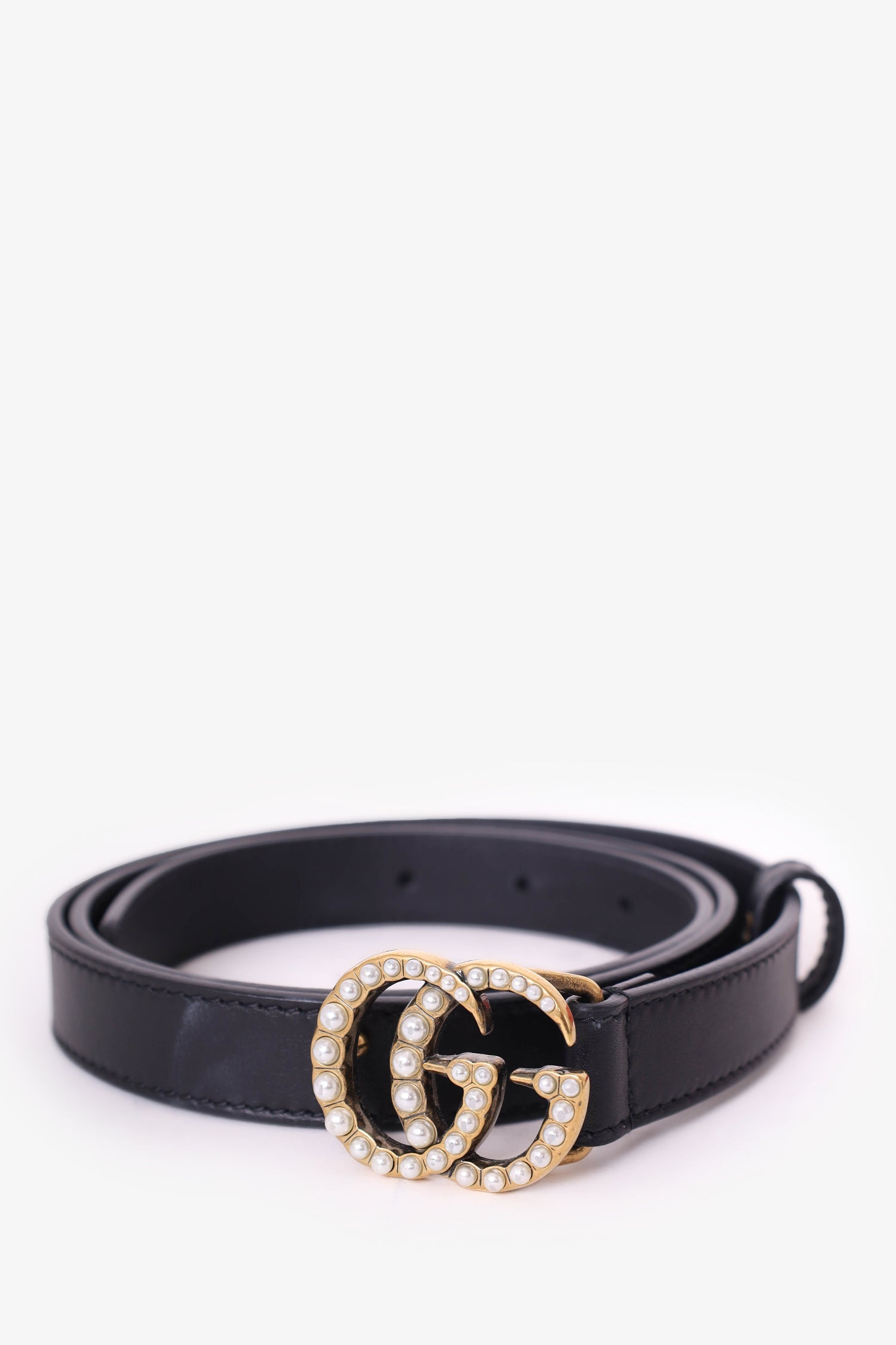 Refresh availabilityGucci Black Leather Pearl Accent GG Belt. Tonal stitching. Gold-tone hardware.