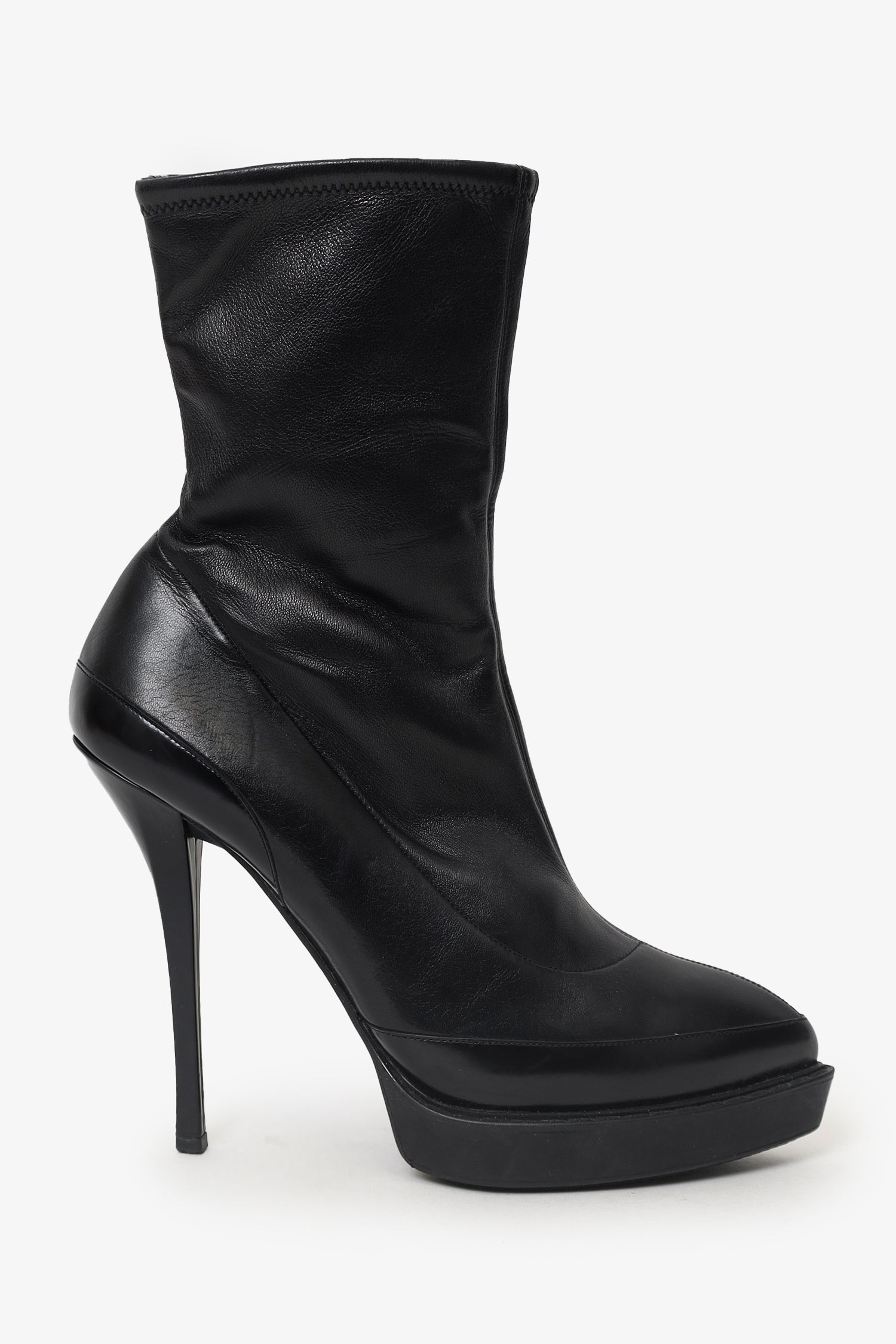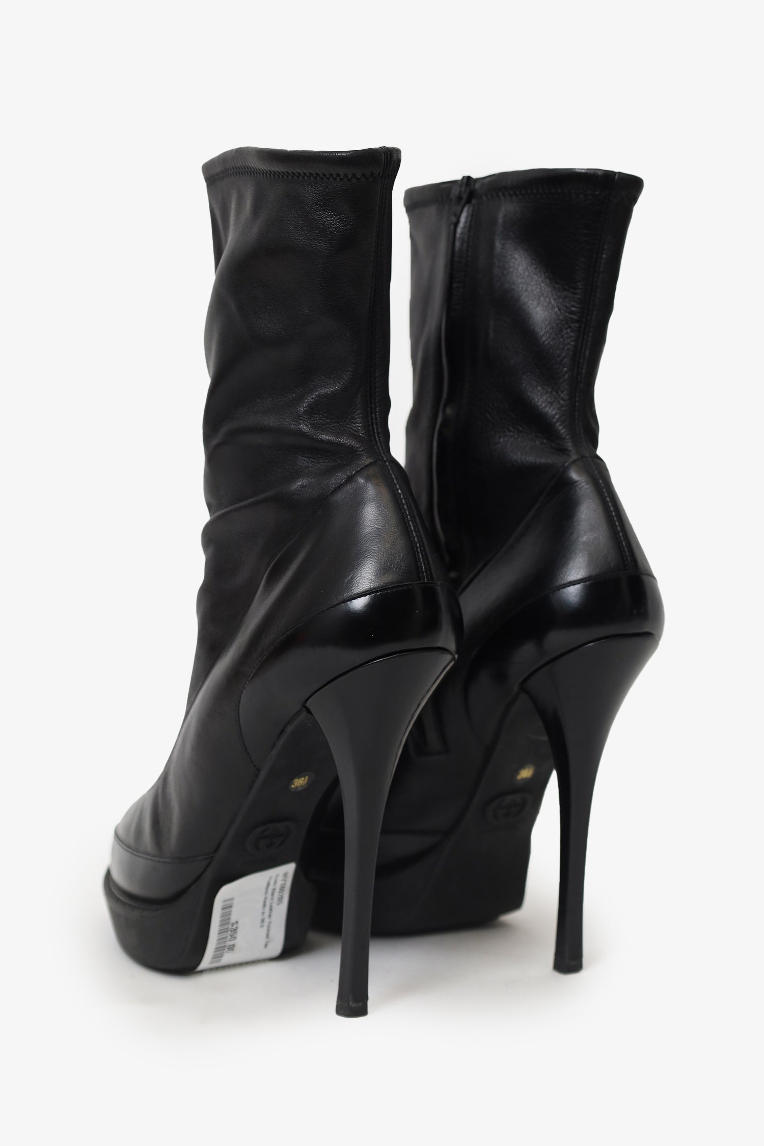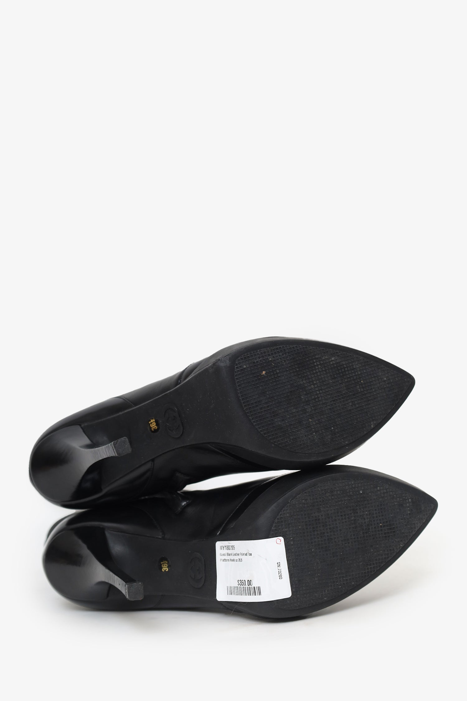 Refresh availabilityGucci Black Leather Pointed Toe Platform Heels. Pull-on. Pointed-toe. Side zip closure. Tonal stitching.