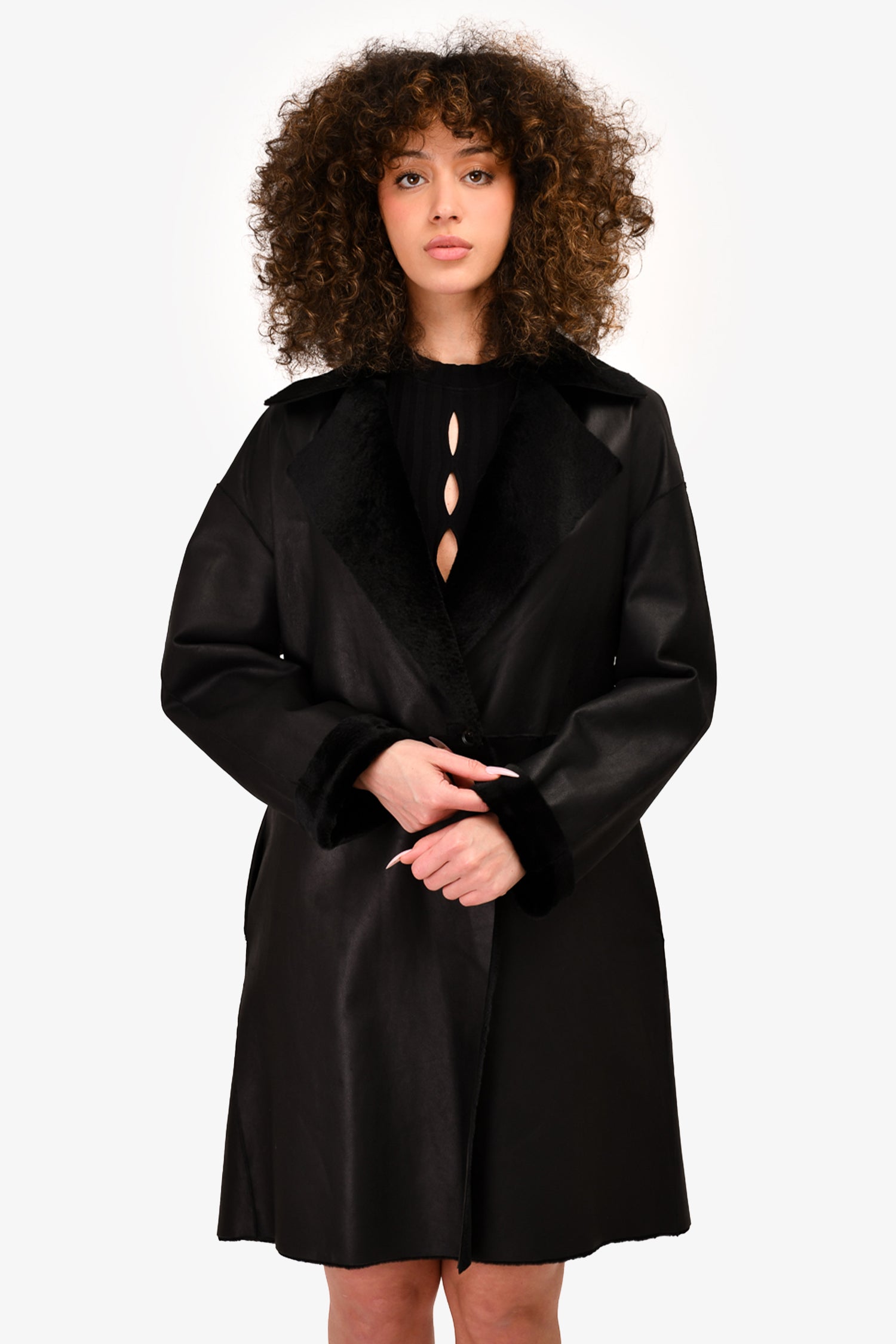 Refresh availabilityGucci Black Leather Lined Coat. Front single button closure. Front pockets. Tonal stitching. Missing belt.