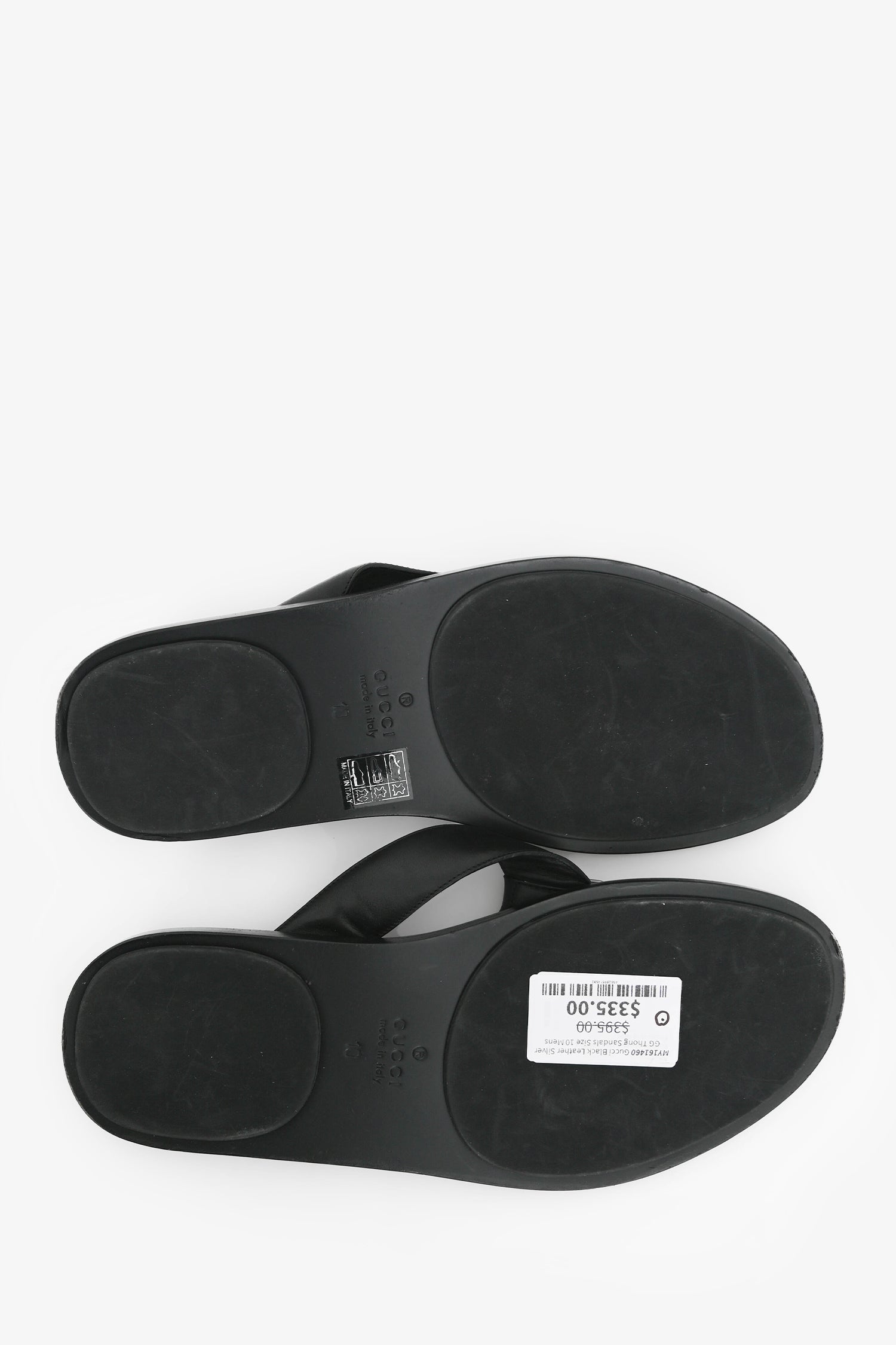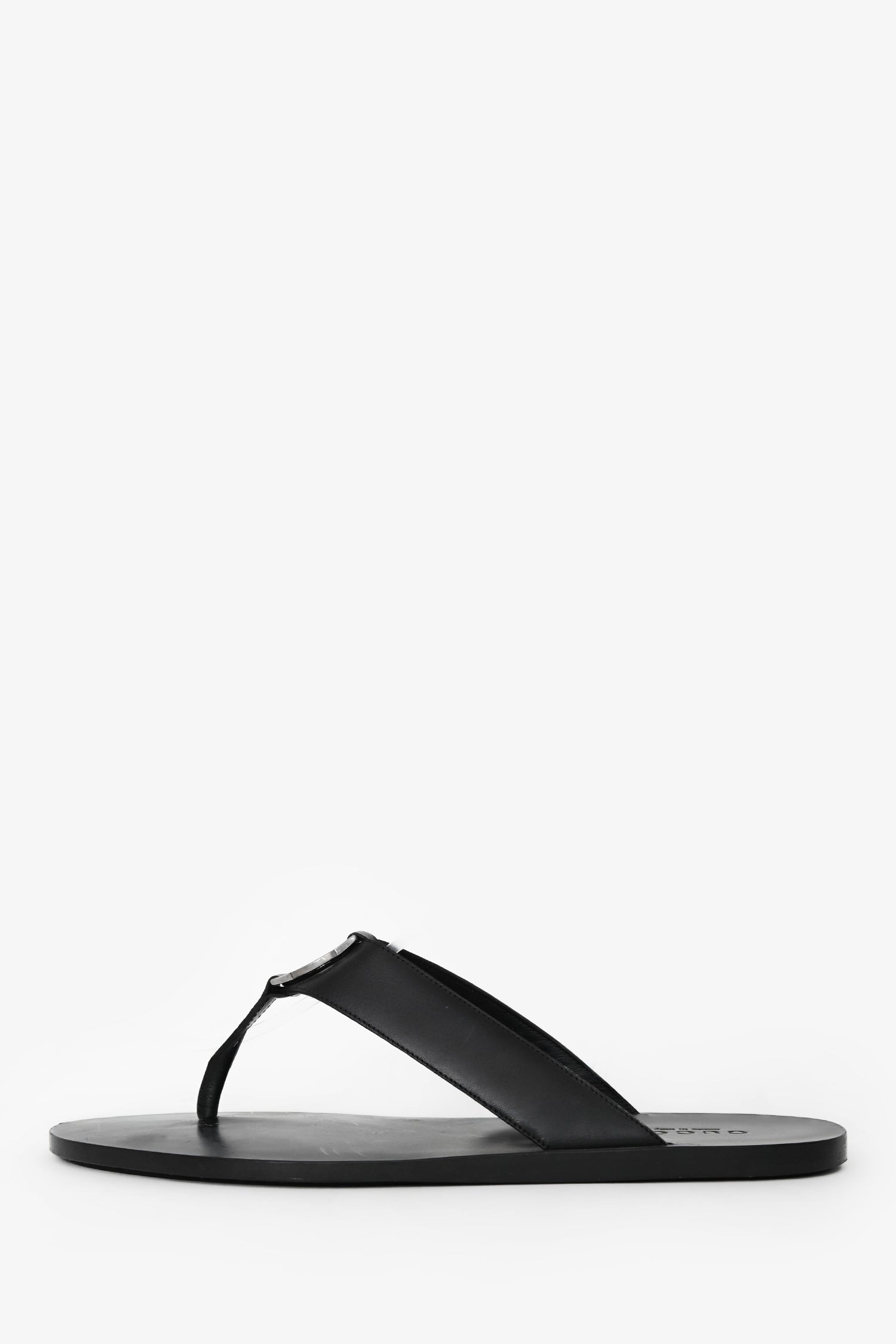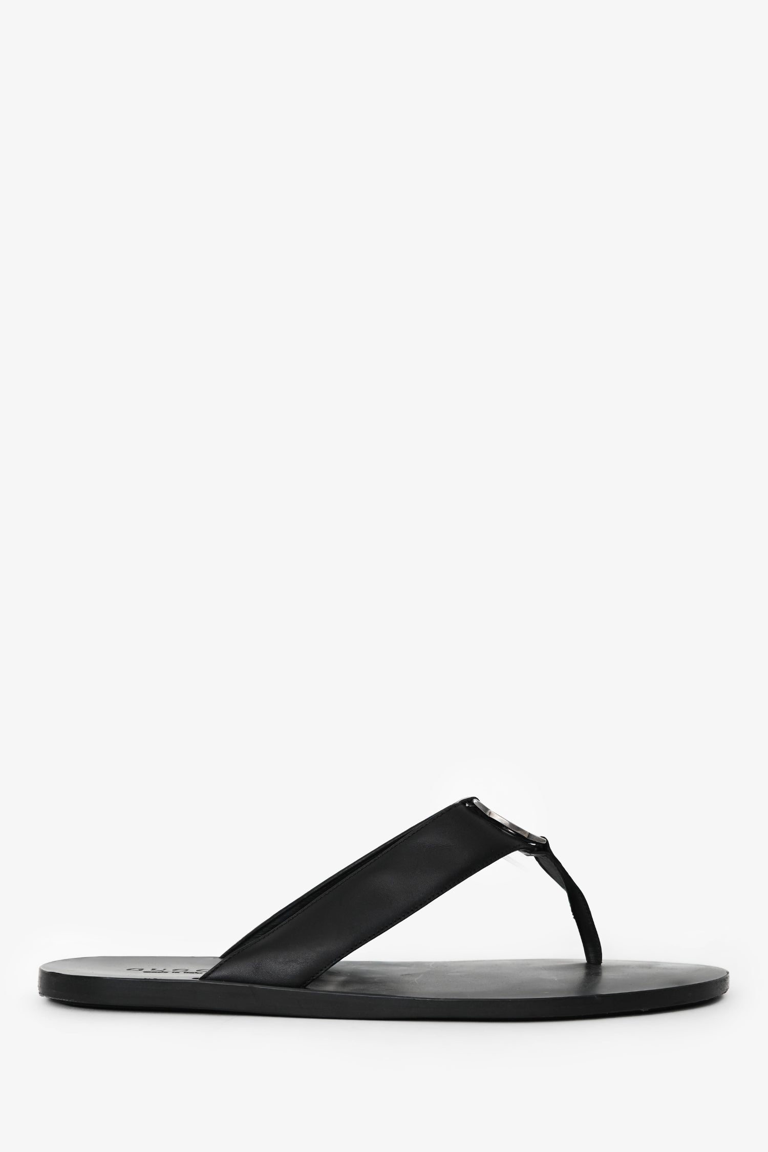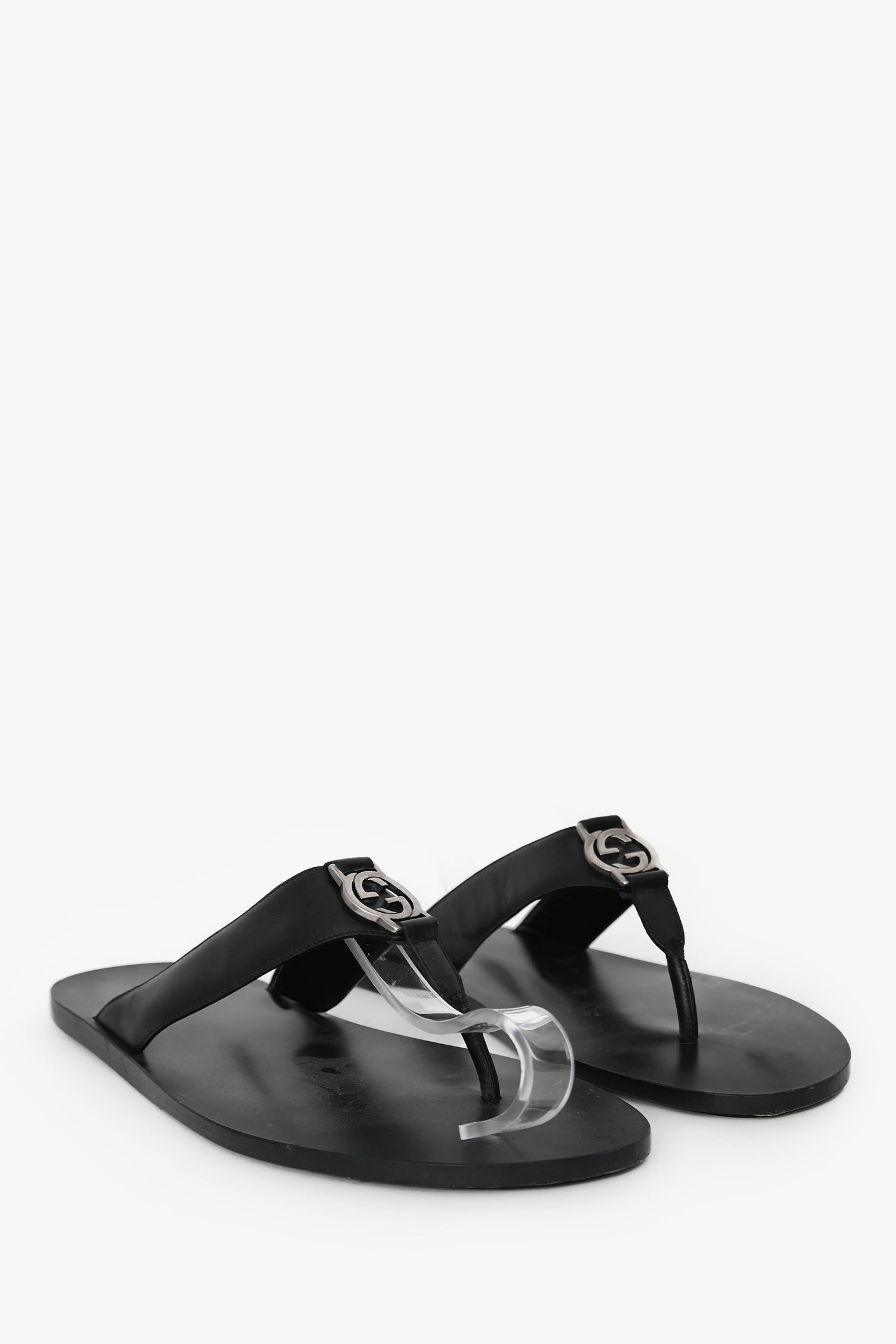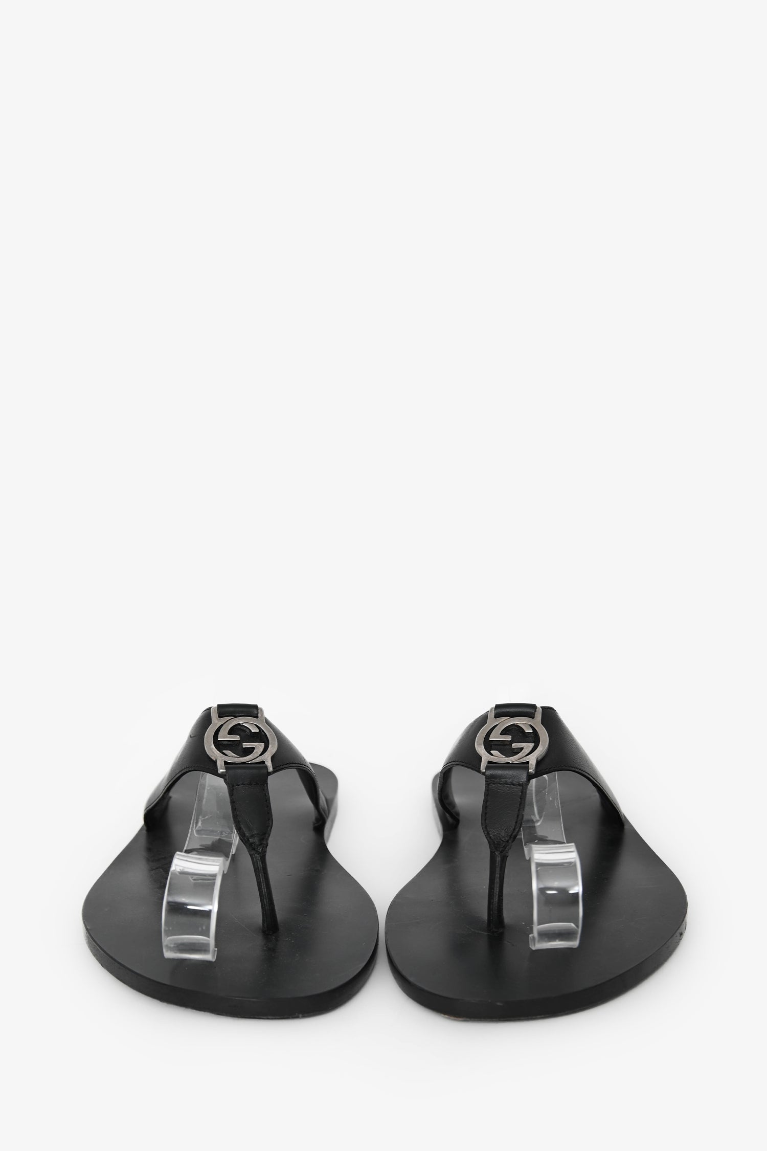 Refresh availabilityGucci Black Leather Silver GG Thong Sandals. Open toe. Silver-tone hardware. Tonal stitching.