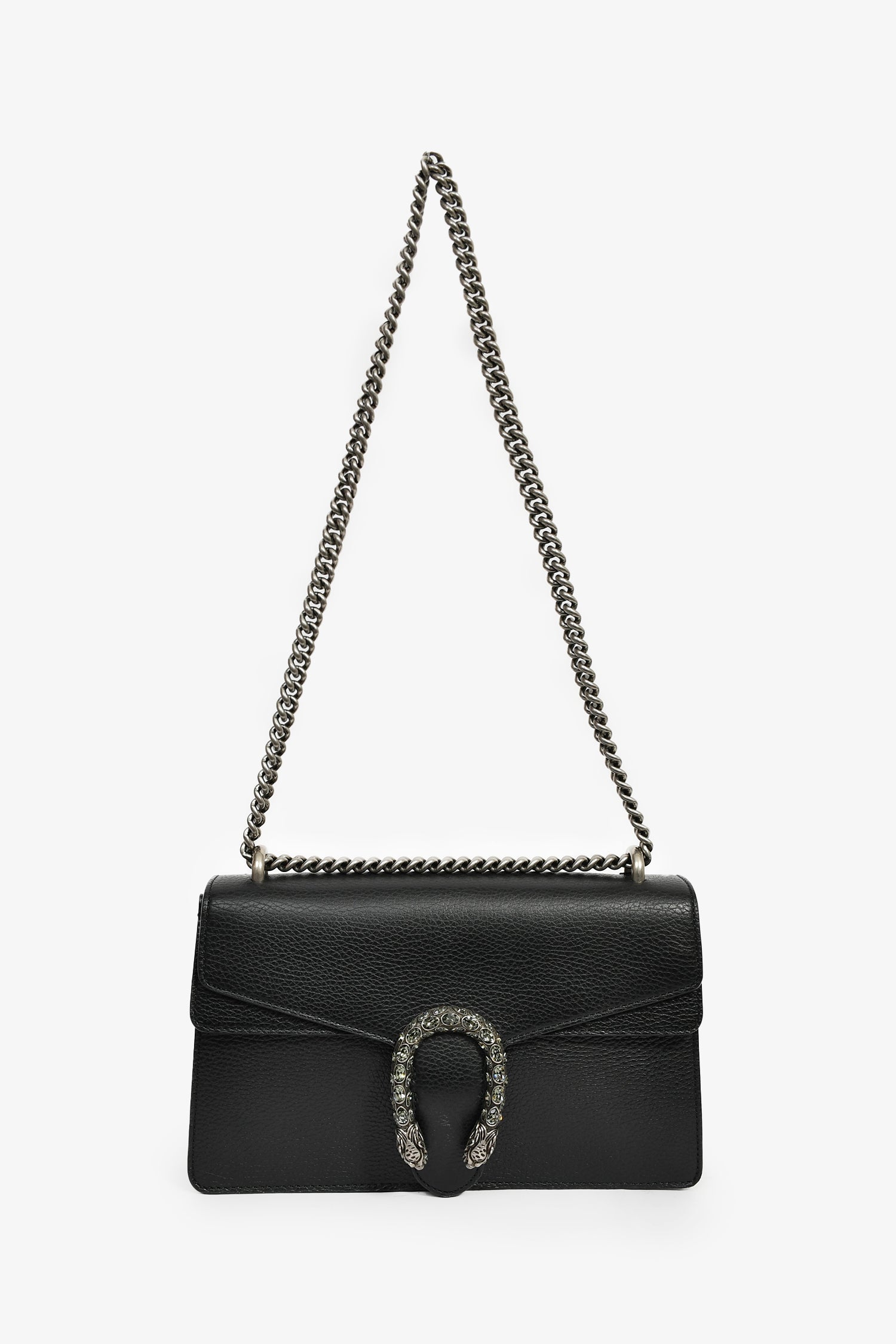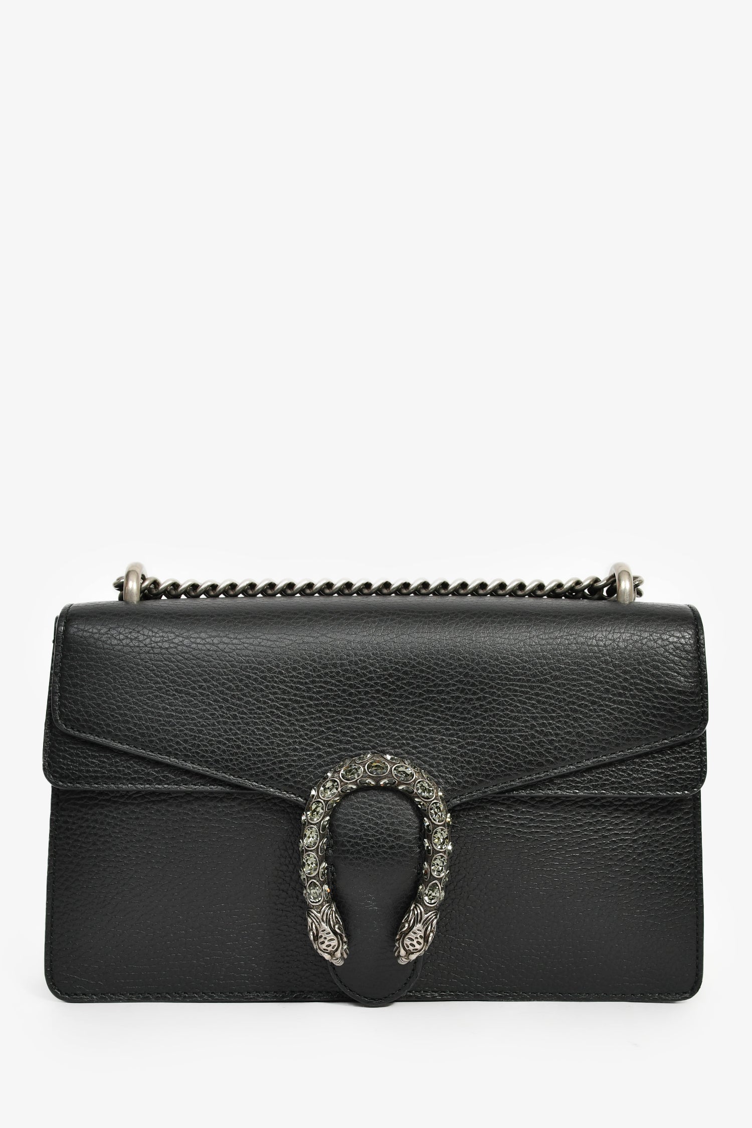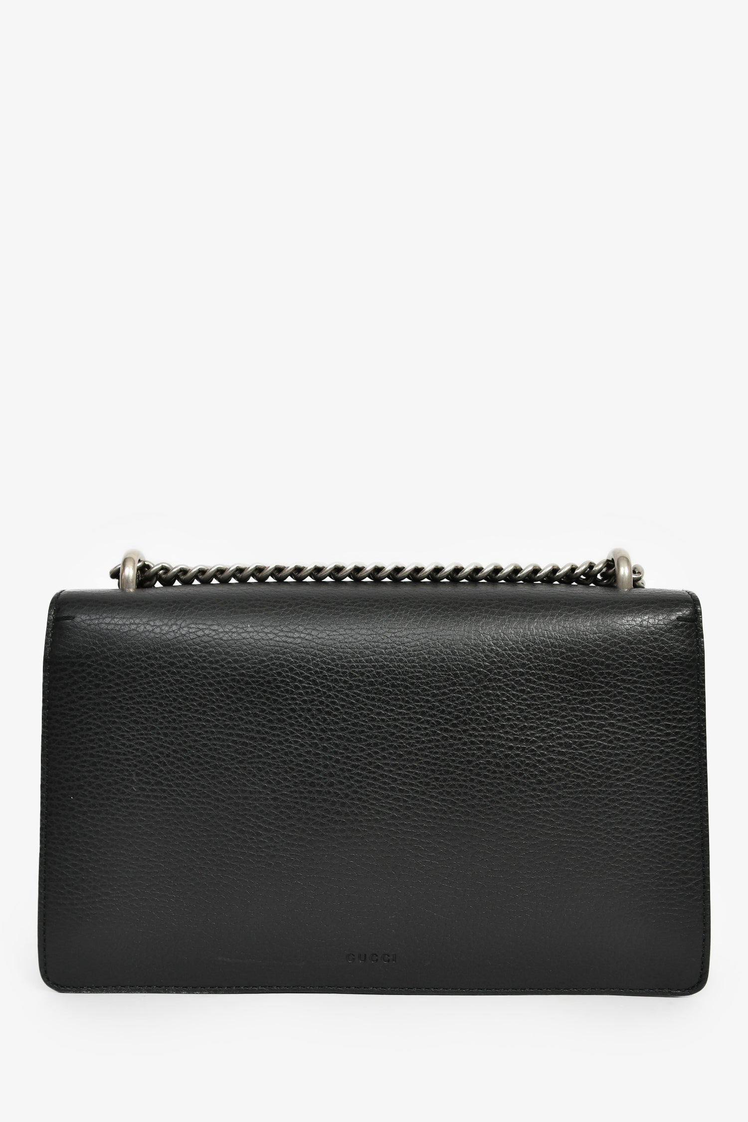 Refresh availabilityGucci Black Leather Small Dionysus Shoulder Bag. Double fold-over flaps with a push-open snap closure. Chain-link shoulder strap. Lined canvas interior with 2 open and 1 zip compartments. Silver-tone hardware. Tonal stitching.