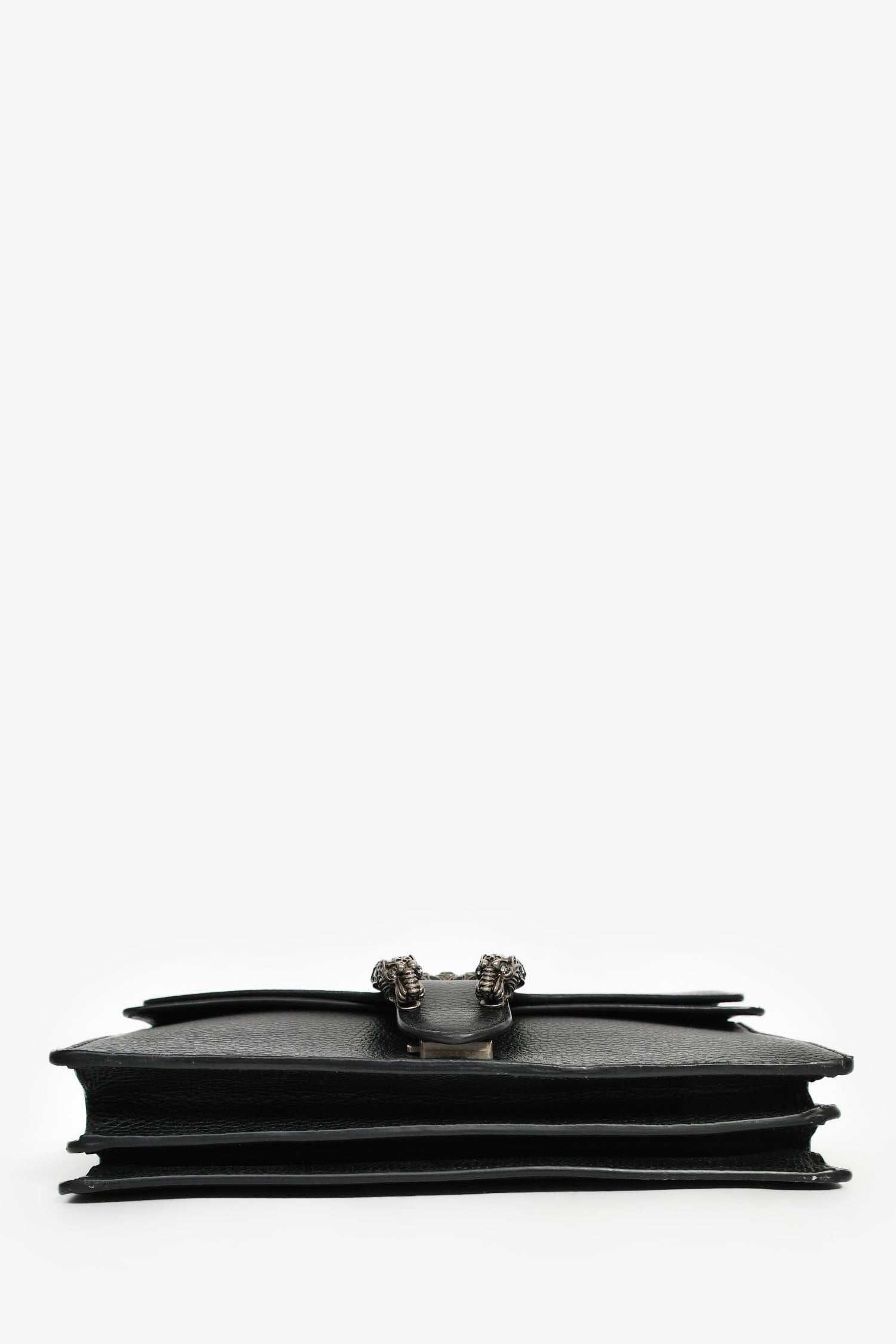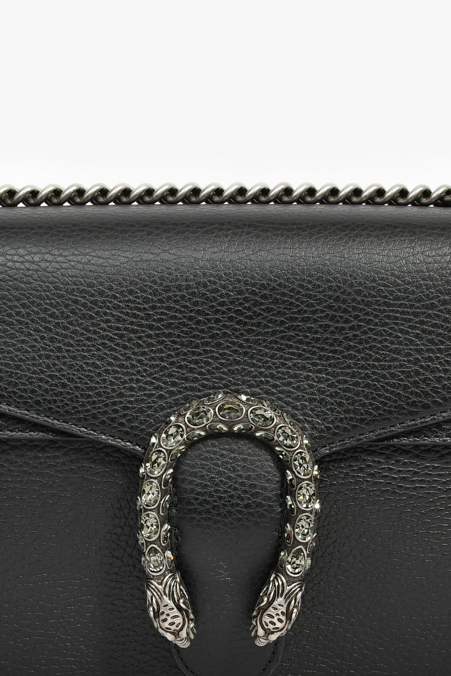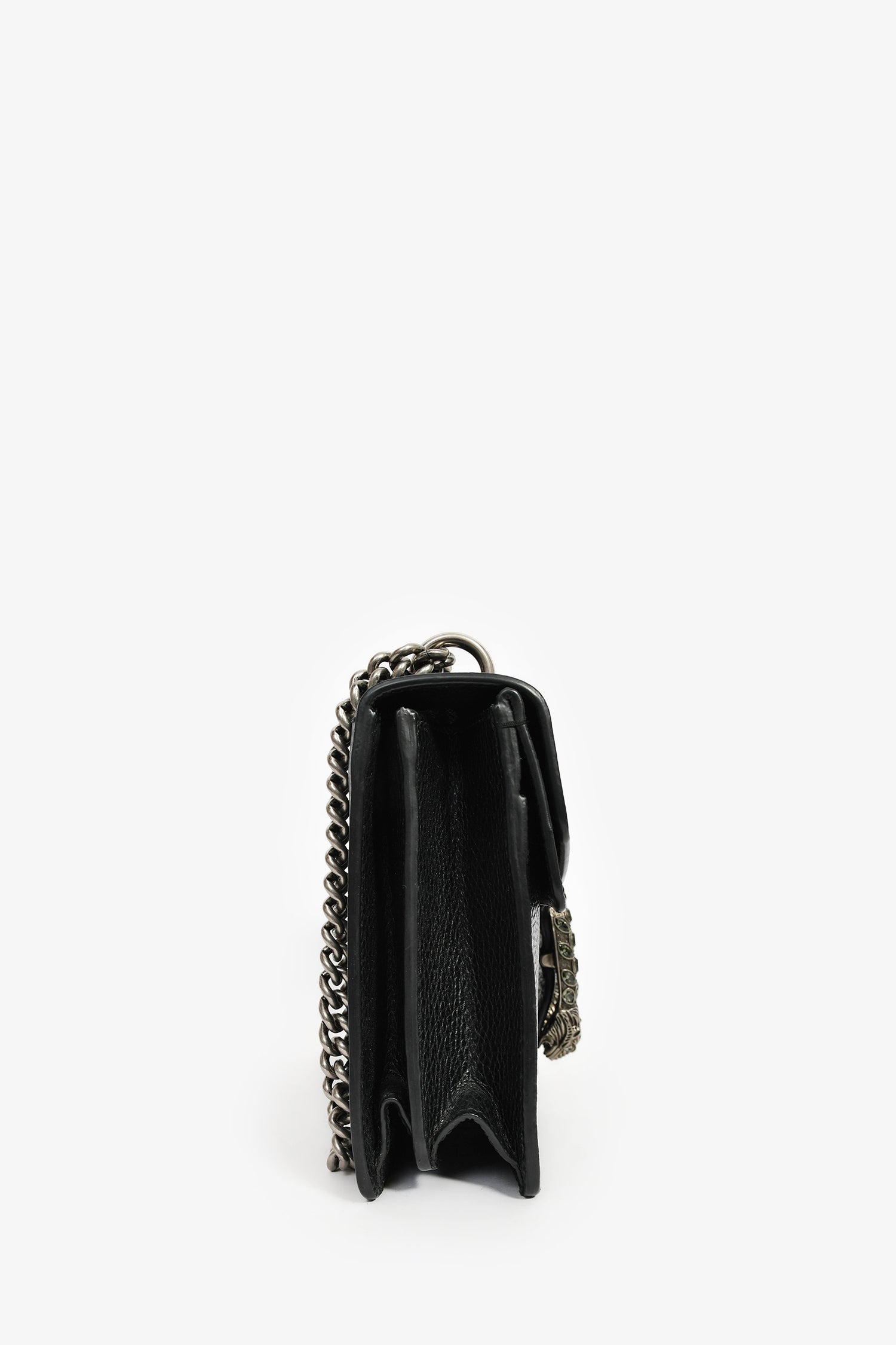 Refresh availabilityGucci Black Leather Small Dionysus Shoulder Bag. Double fold-over flaps with a push-open snap closure. Chain-link shoulder strap. Lined canvas interior with 2 open and 1 zip compartments. Silver-tone hardware. Tonal stitching.