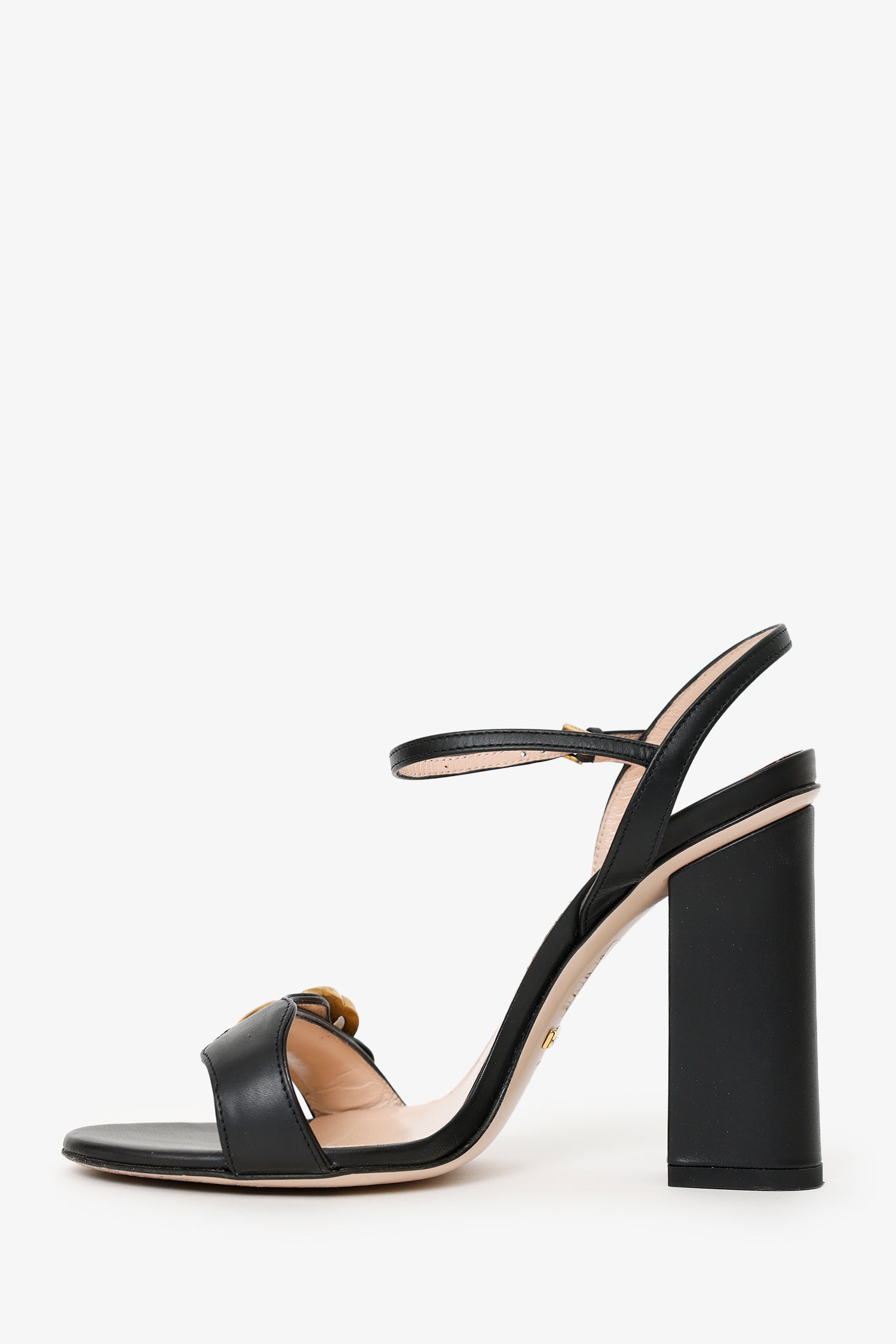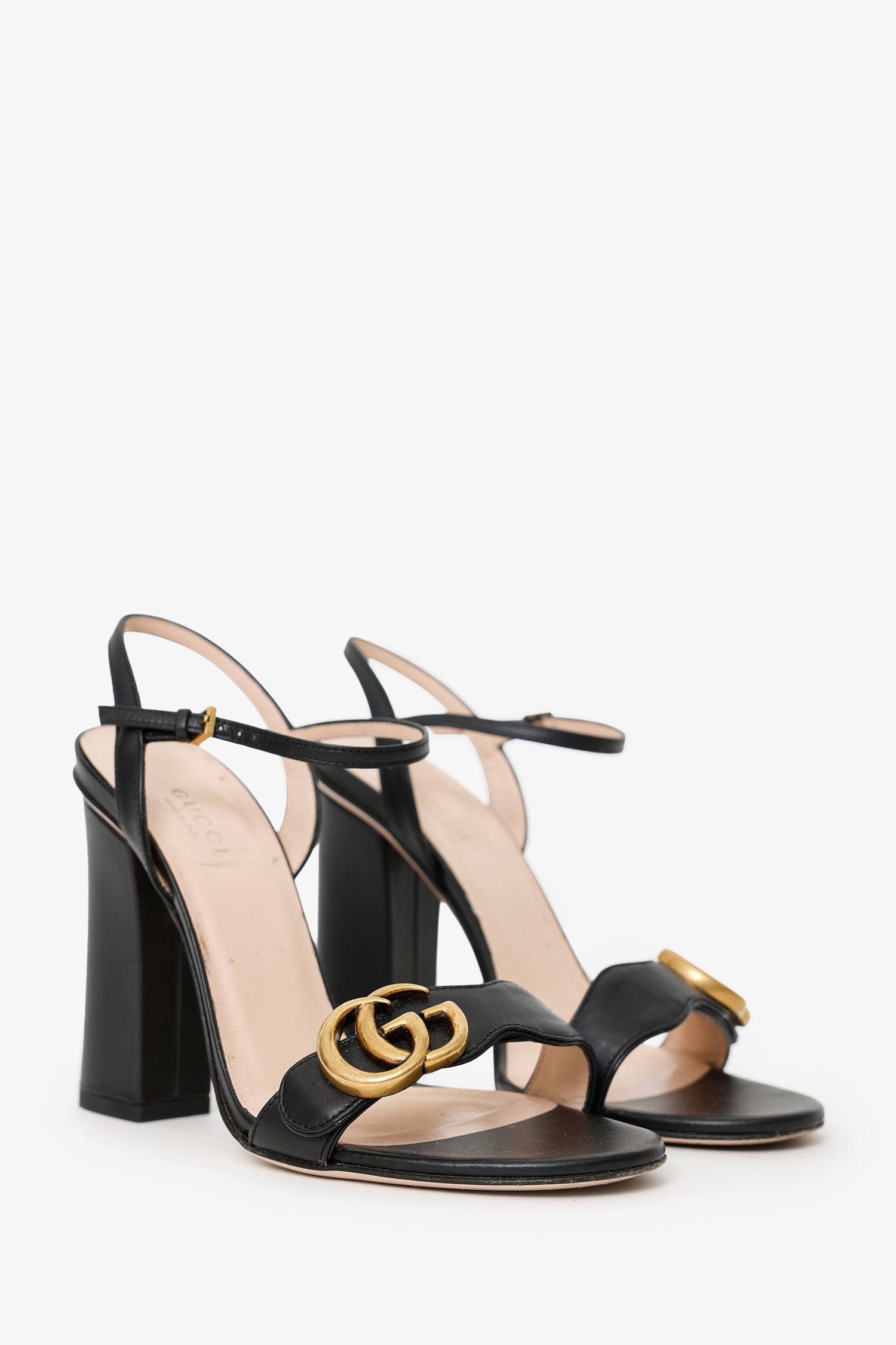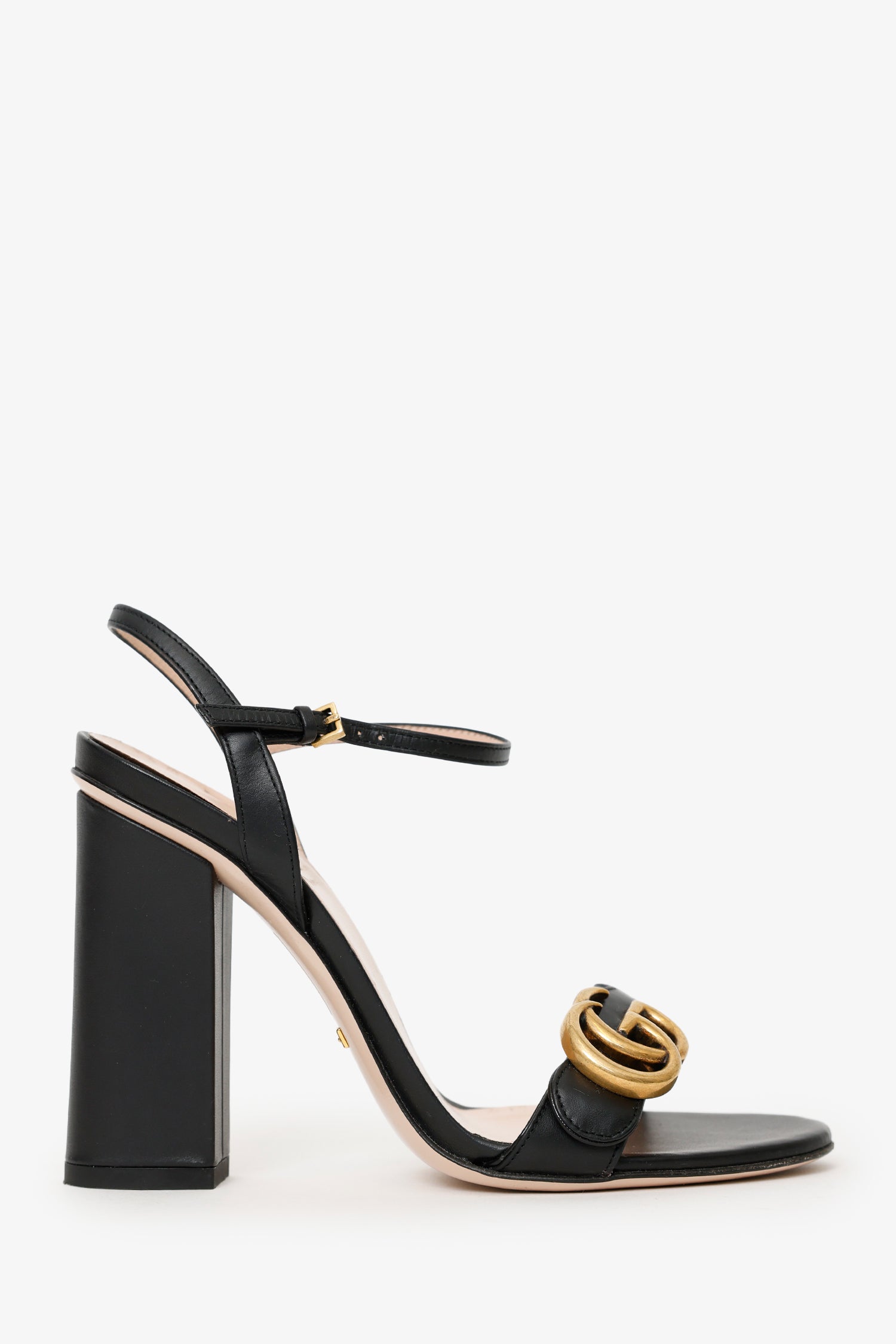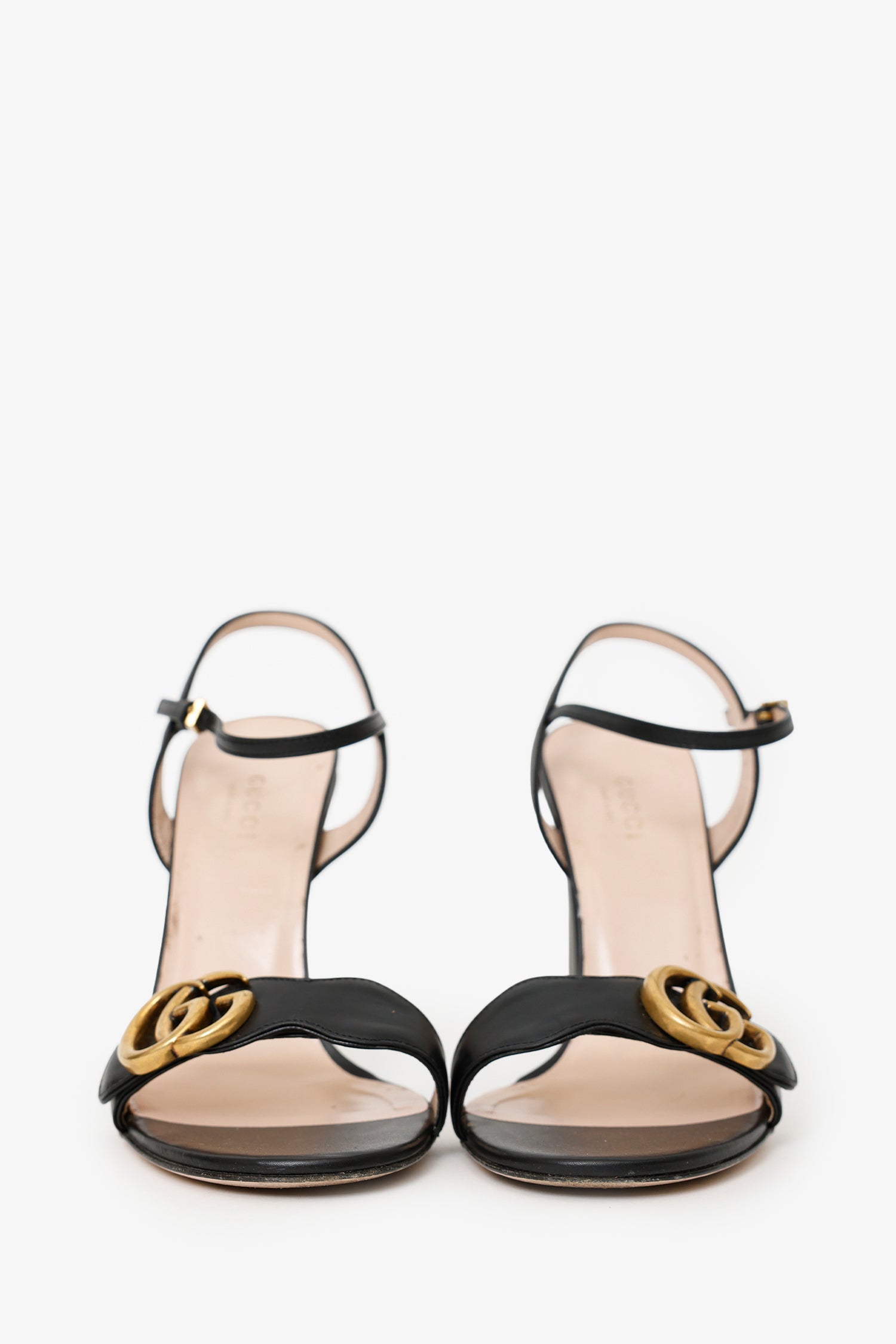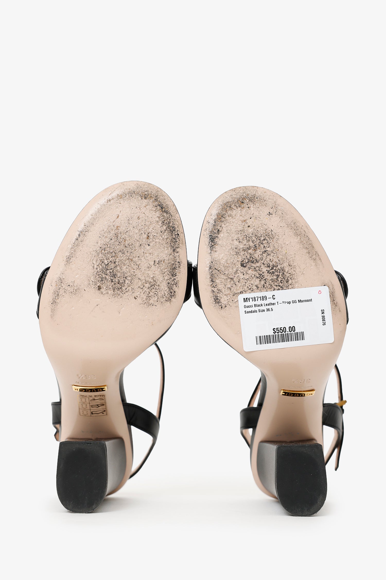 Refresh availabilityGucci Black Leather T-Strap GG Marmont Sandals. Open round toe. Adjustable ankle strap with push-pin buckle closure. Gold-tone hardware. Tonal stitching.