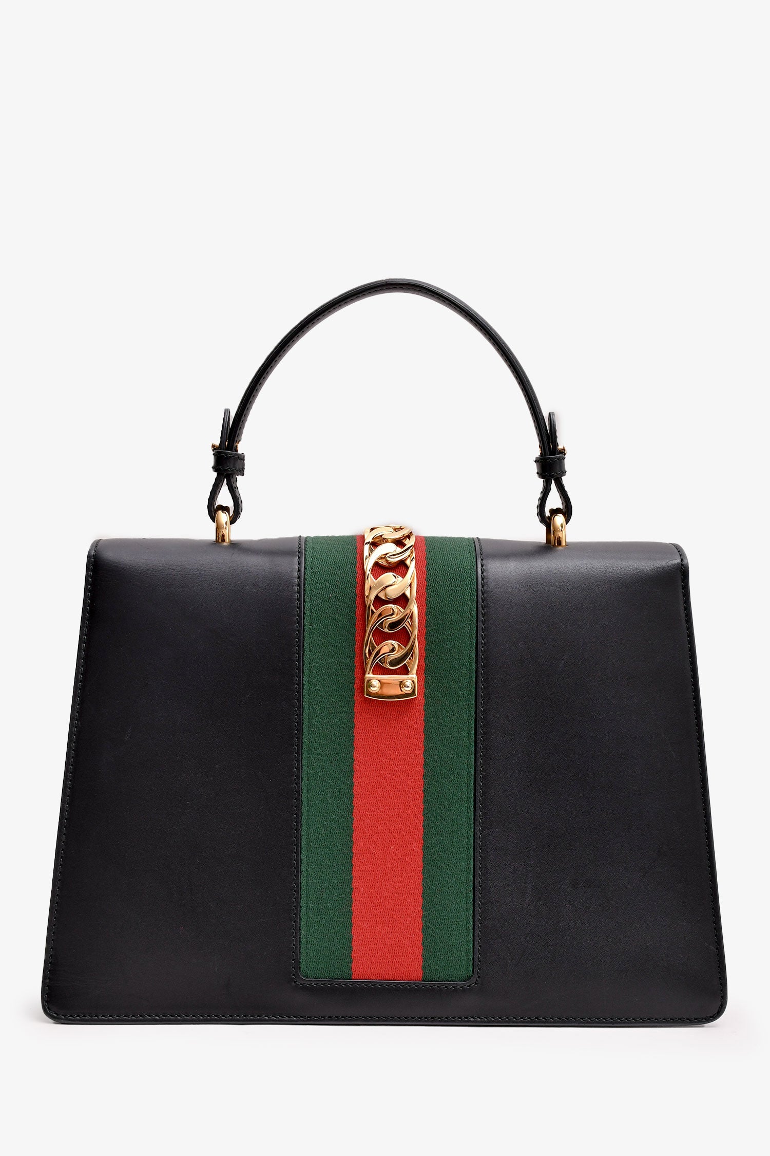 Refresh availabilityGucci Black Leather Web Detail Sylvie Top Handle With Strap. Gold-tone hardware. Turn-lock closure. Two small interior pockets, one with a zipper. Top handle and adjustable, detachable strap. Tonal stitching.