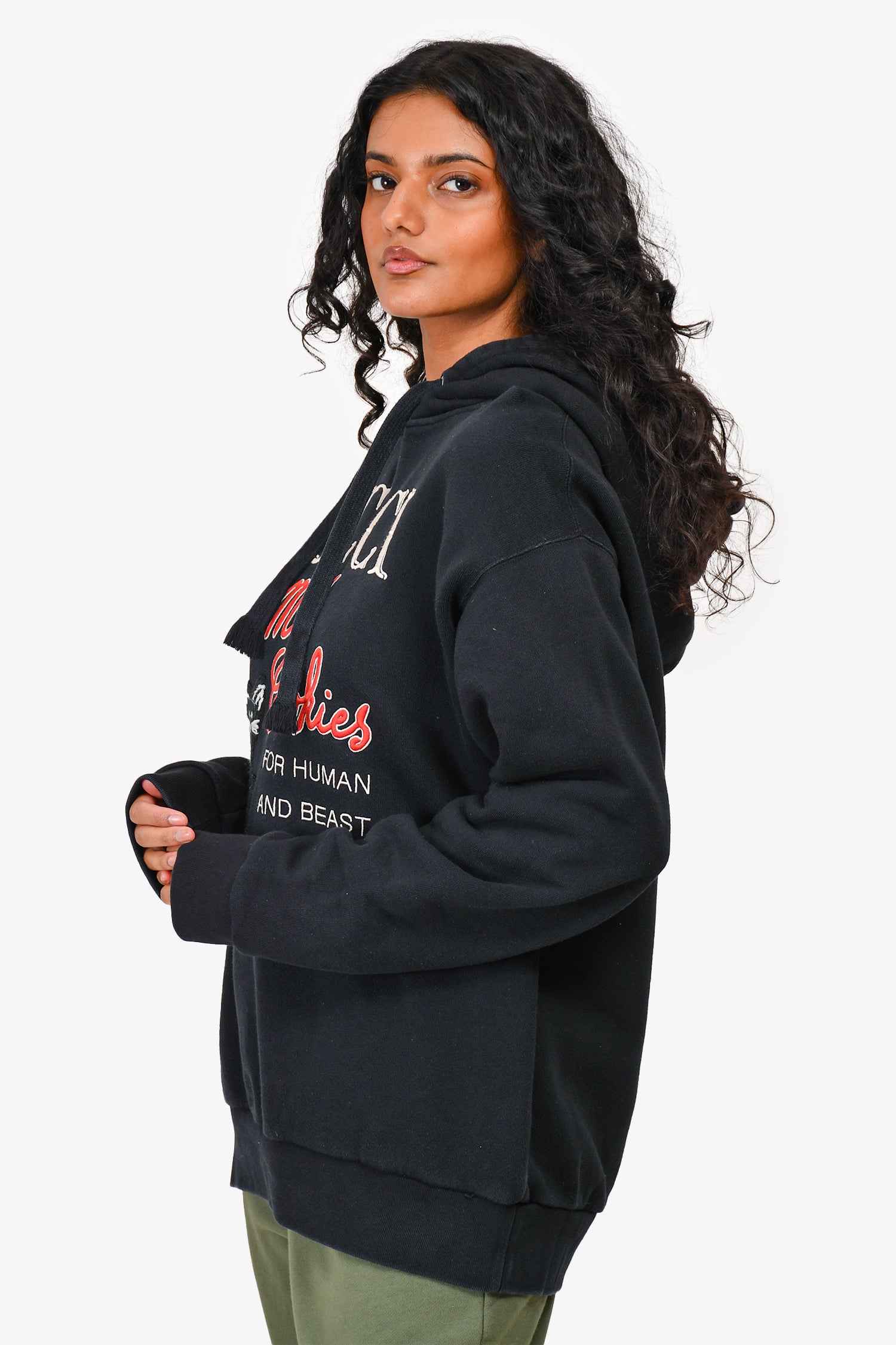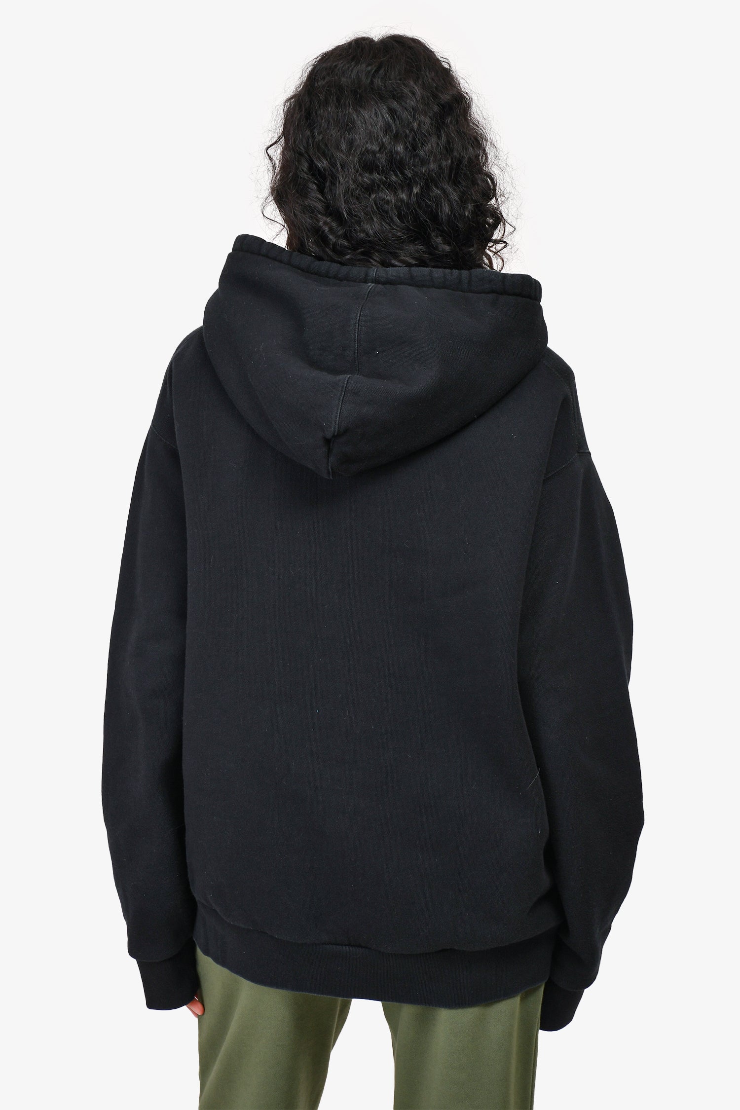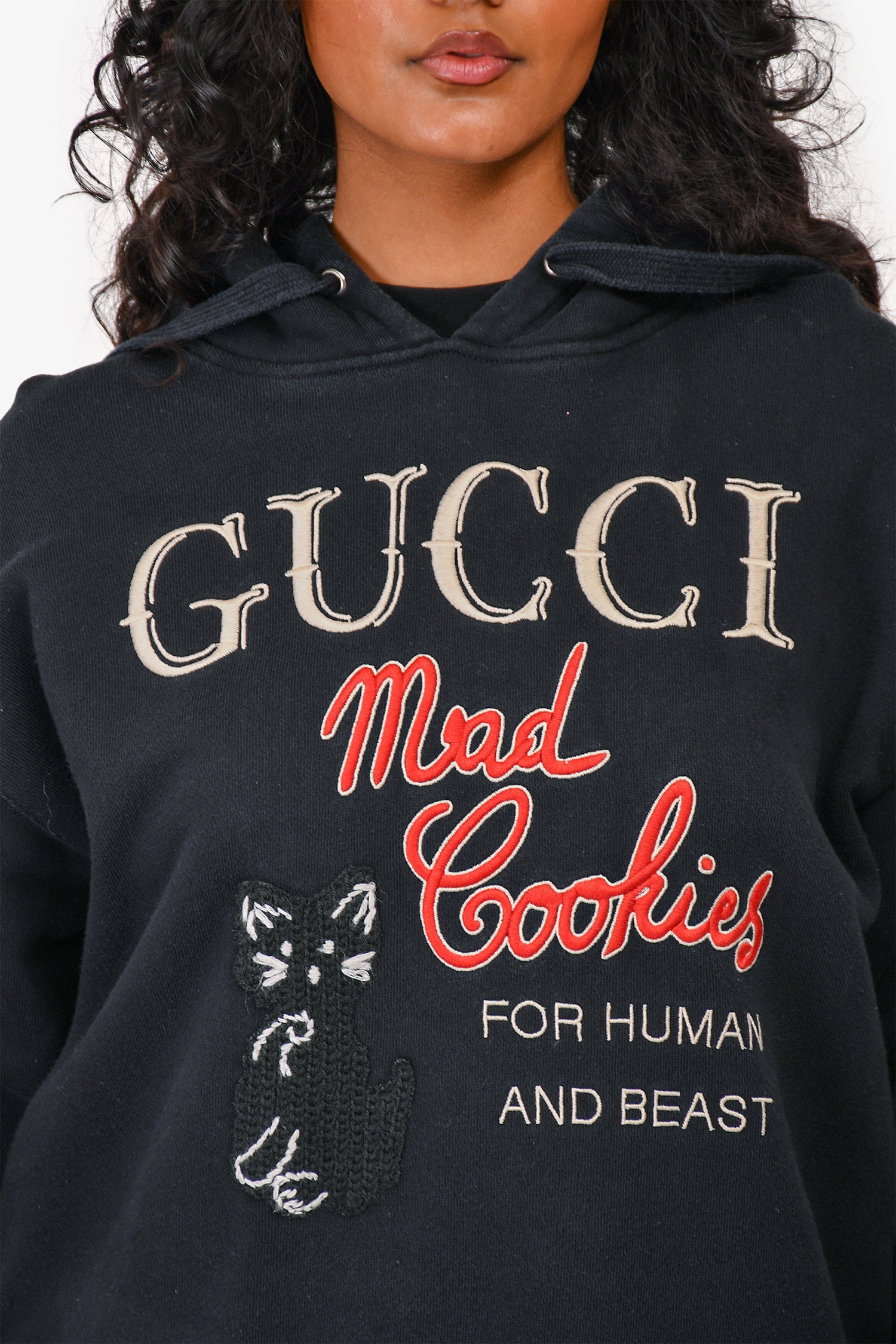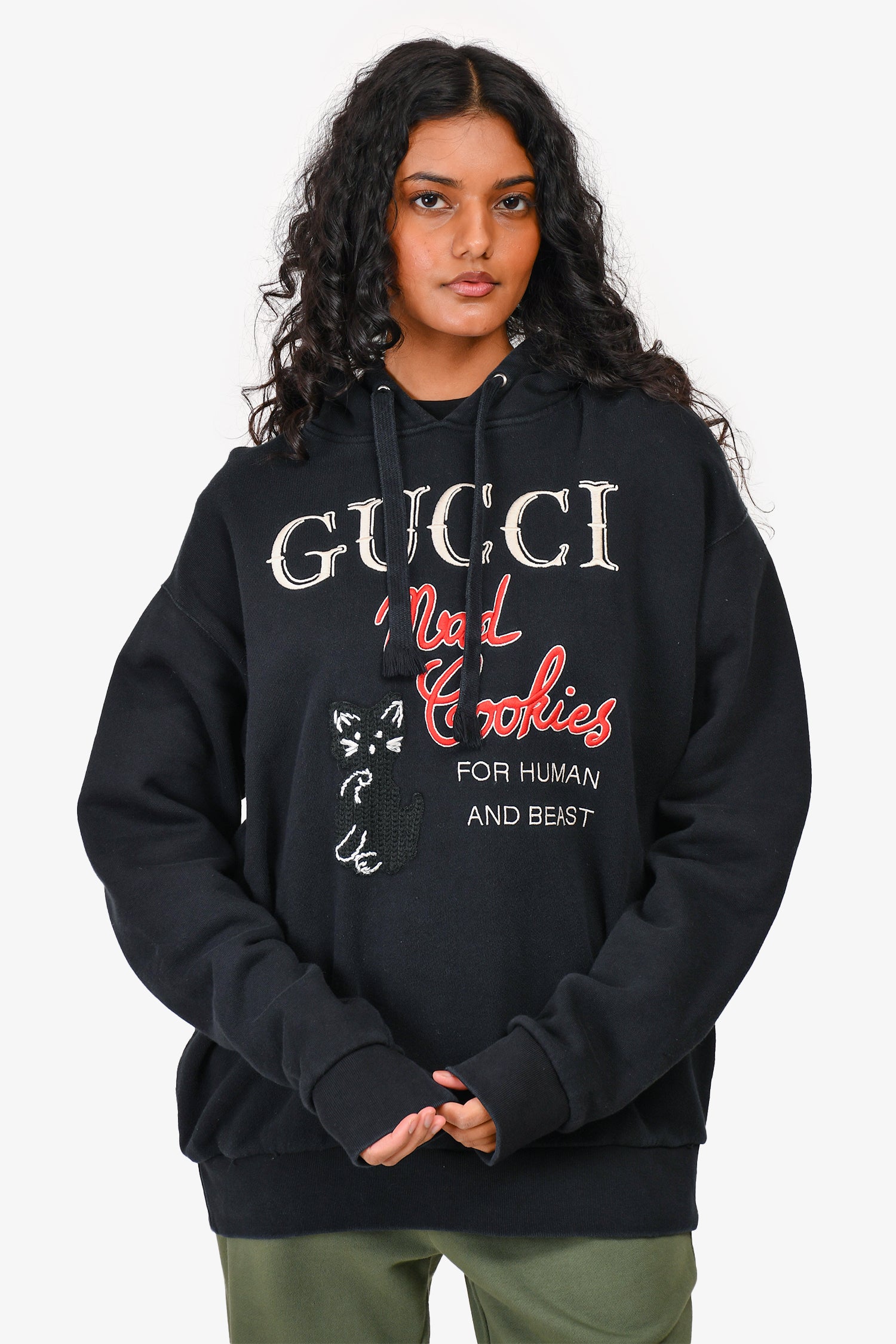 Refresh availabilityGucci Black Logo Embroidered Hoodie. Ribbed cuffs and waistband. Drawstrings on the hood. Stitched front logo at the face. Tonal stitching.
