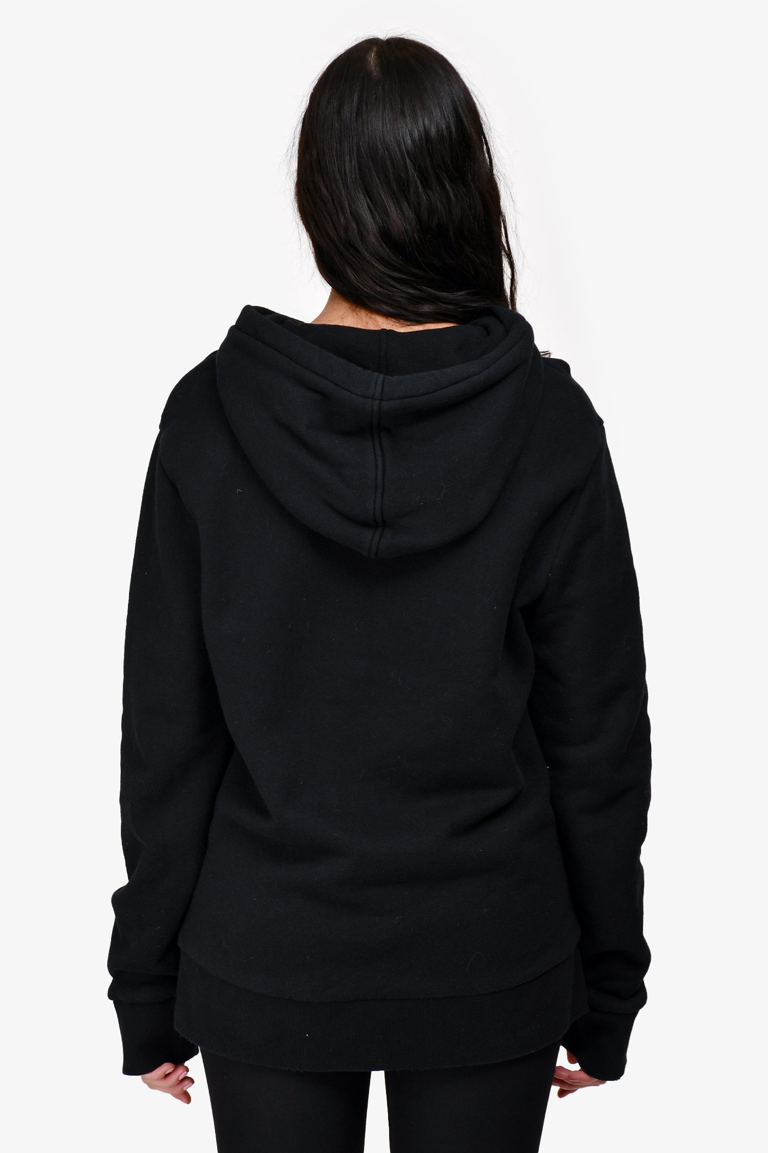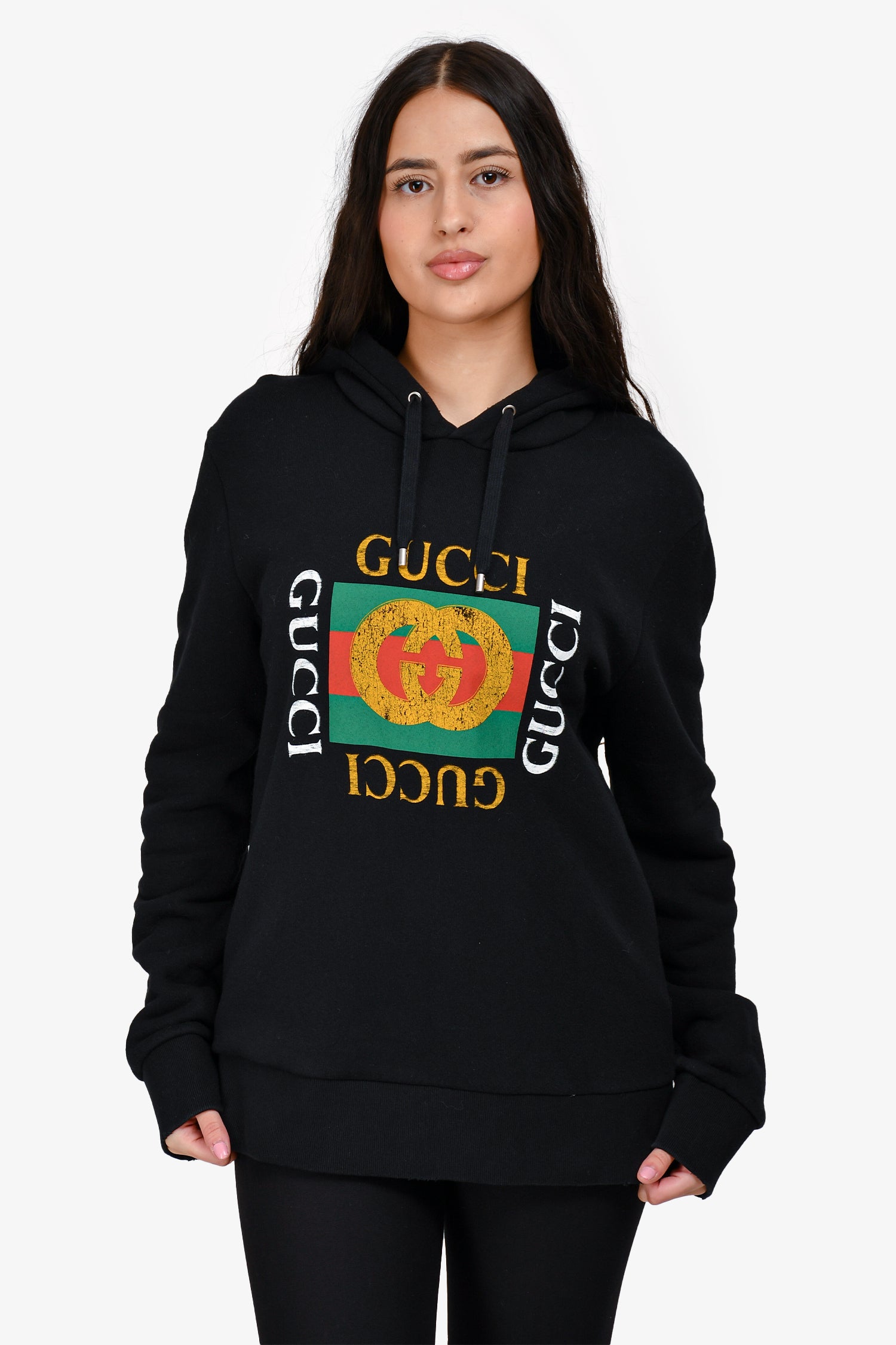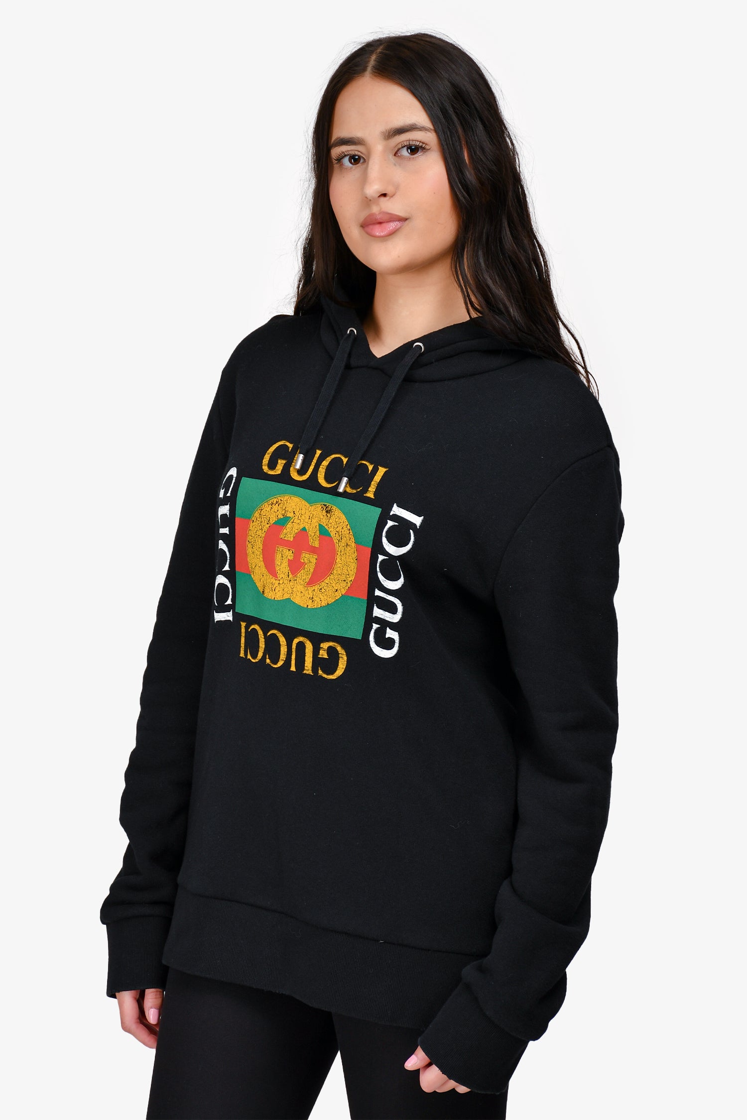 Refresh availabilityGucci Black Logo Hoodie. Silver-tone hardware. Drawstrings on the hood. Intentional distressing at the hem. Tonal stitching.