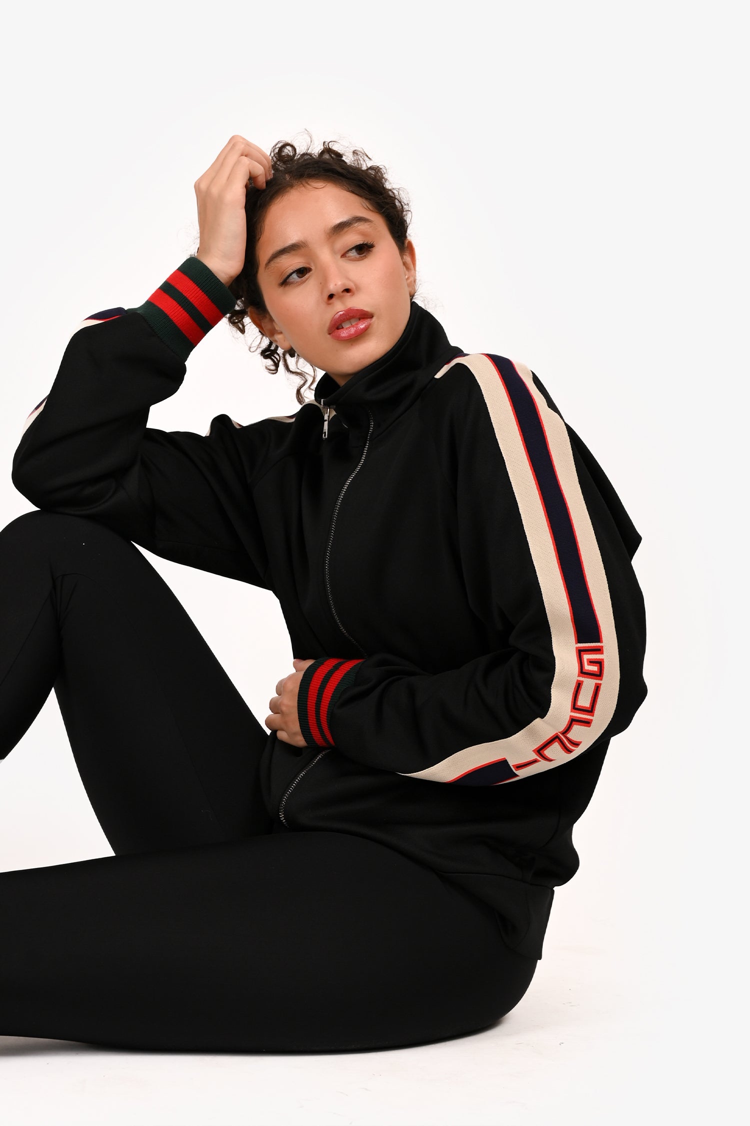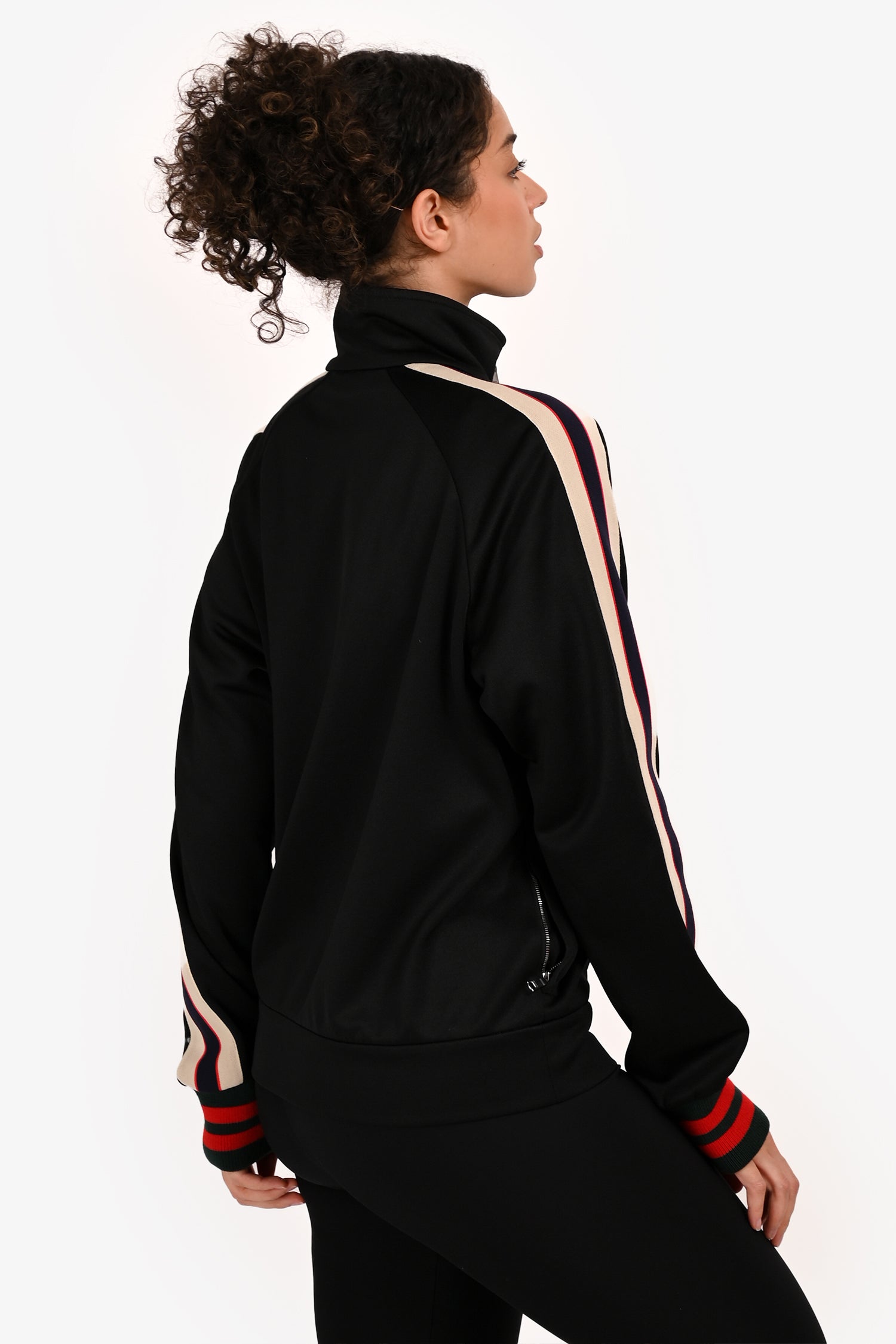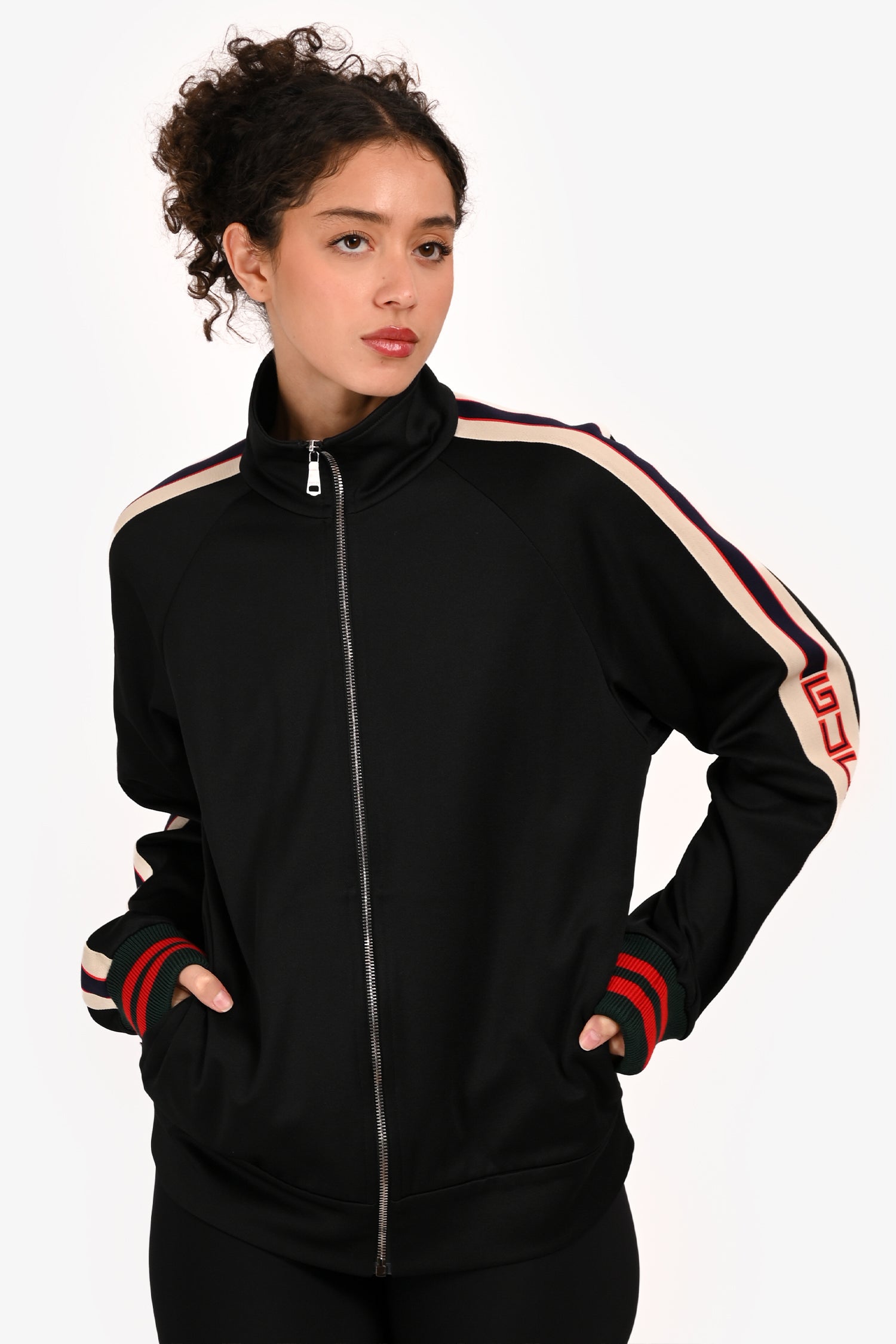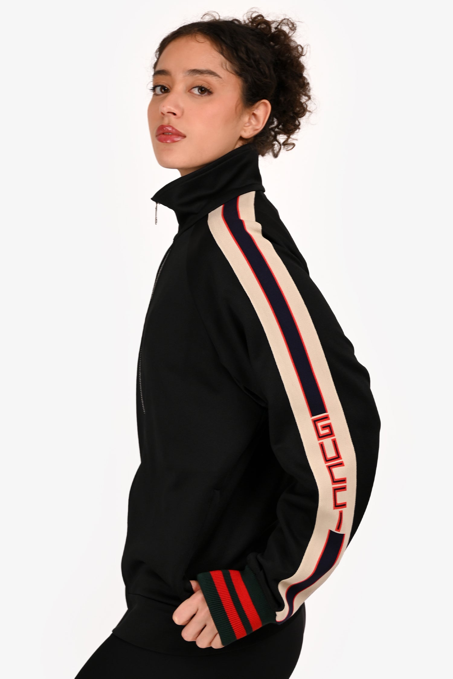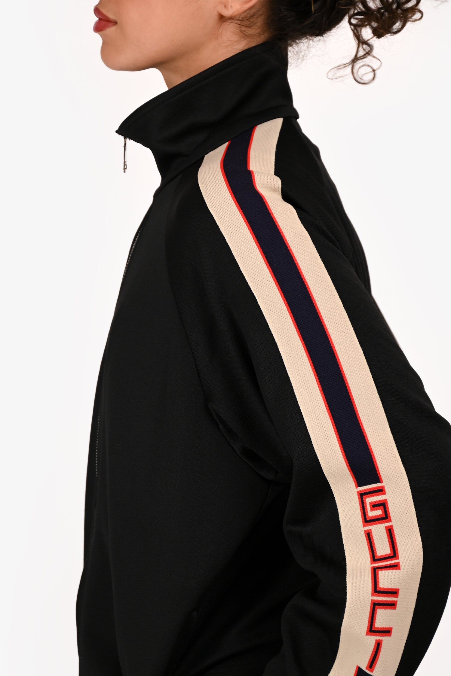 Refresh availabilityGucci Black Logo Sleeve Zip-Up Track Jacket. Raised neckline. Front zip closure. Front zip pockets. Elasticized cuffs. Silver-tone hardware. Tonal stitching.