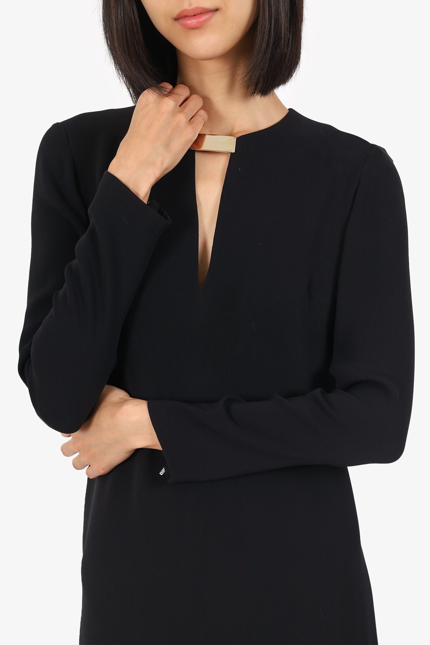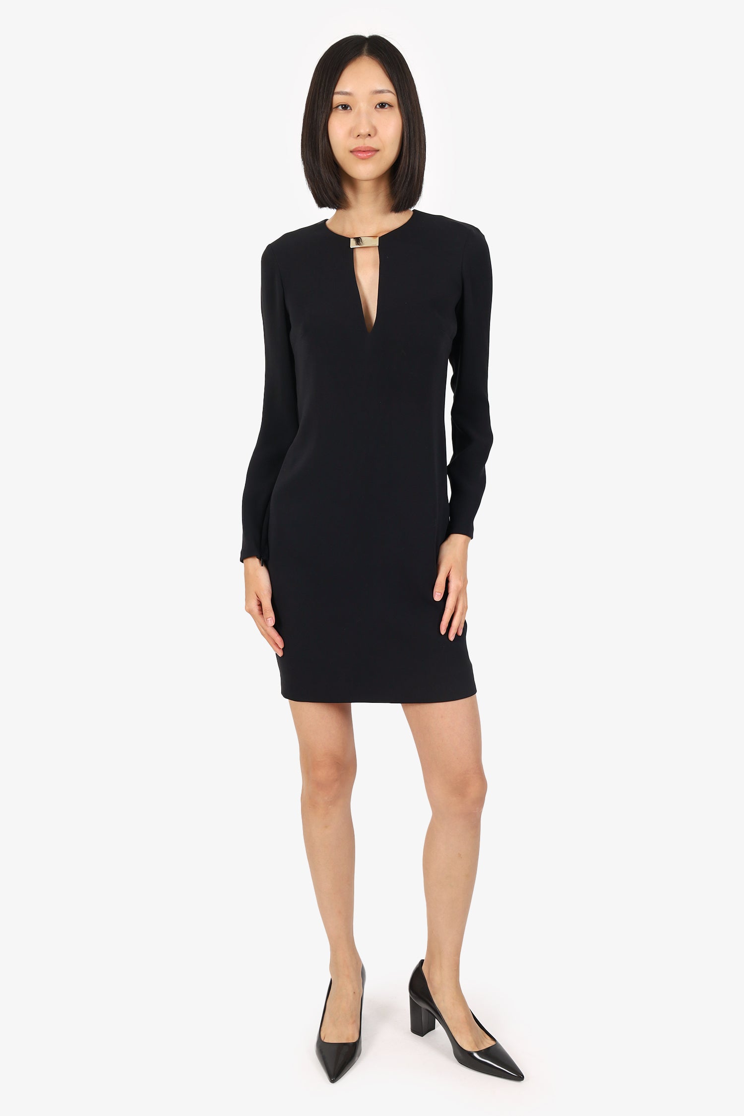 Refresh availabilityGucci Black Long Sleeve Mini Dress. Slip-on. V-neckline. Front keyhole with logo hardware. Rear zip closure. Silver-tone hardware. Tonal stitching.