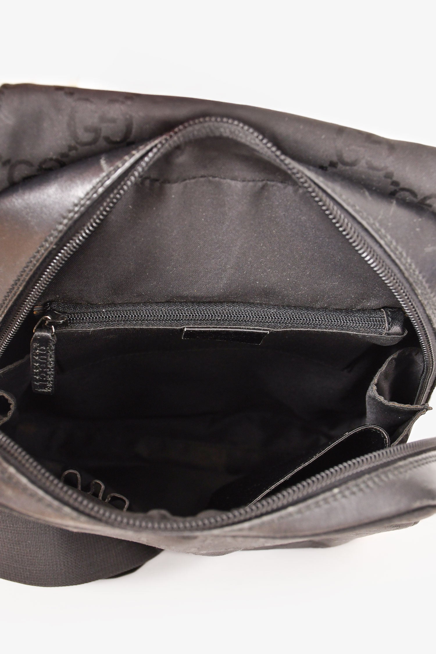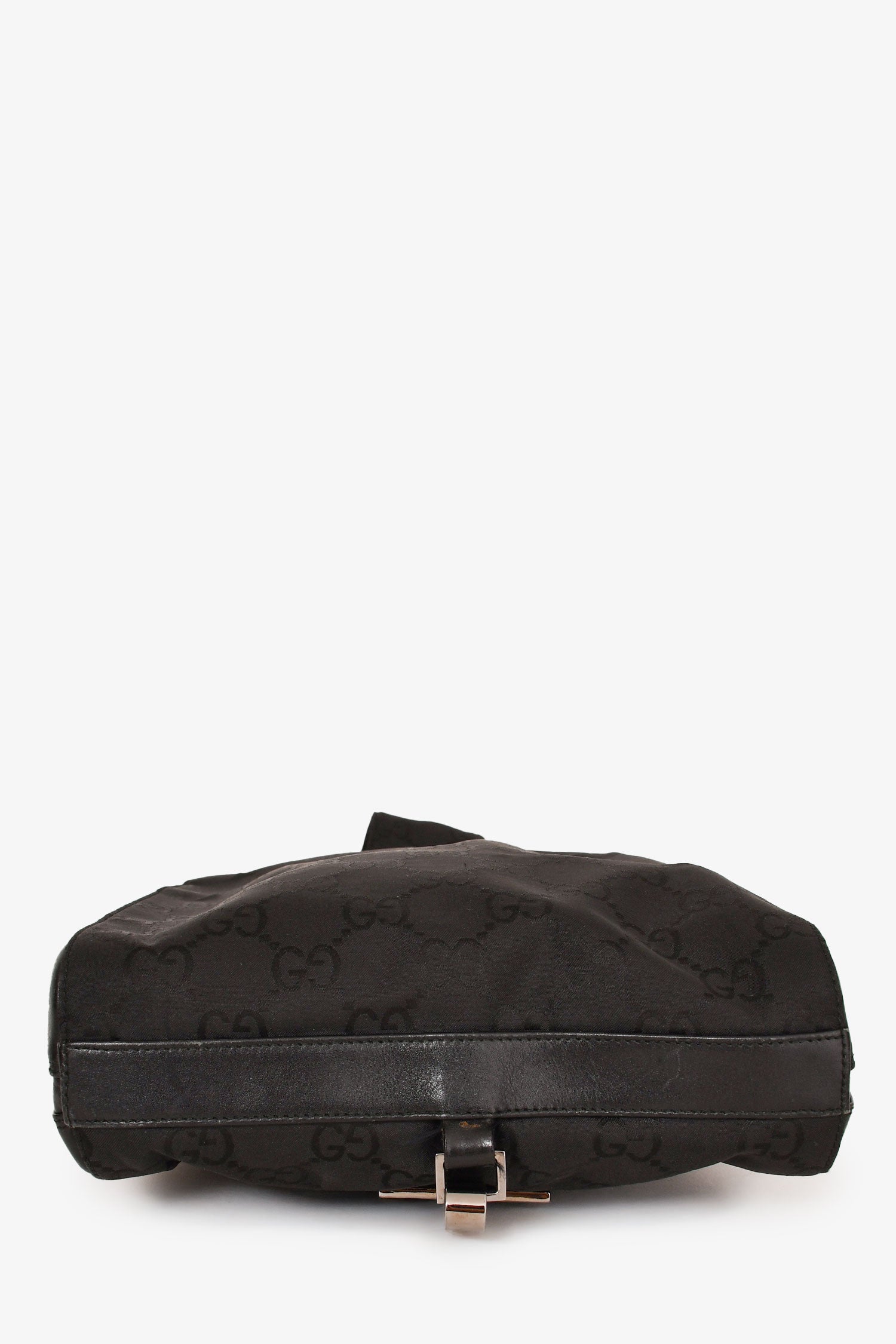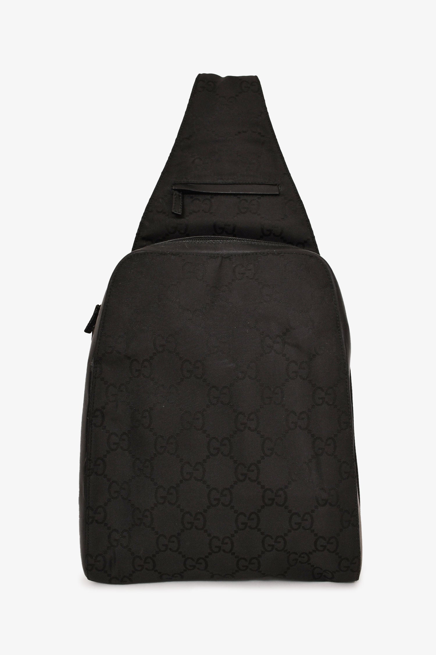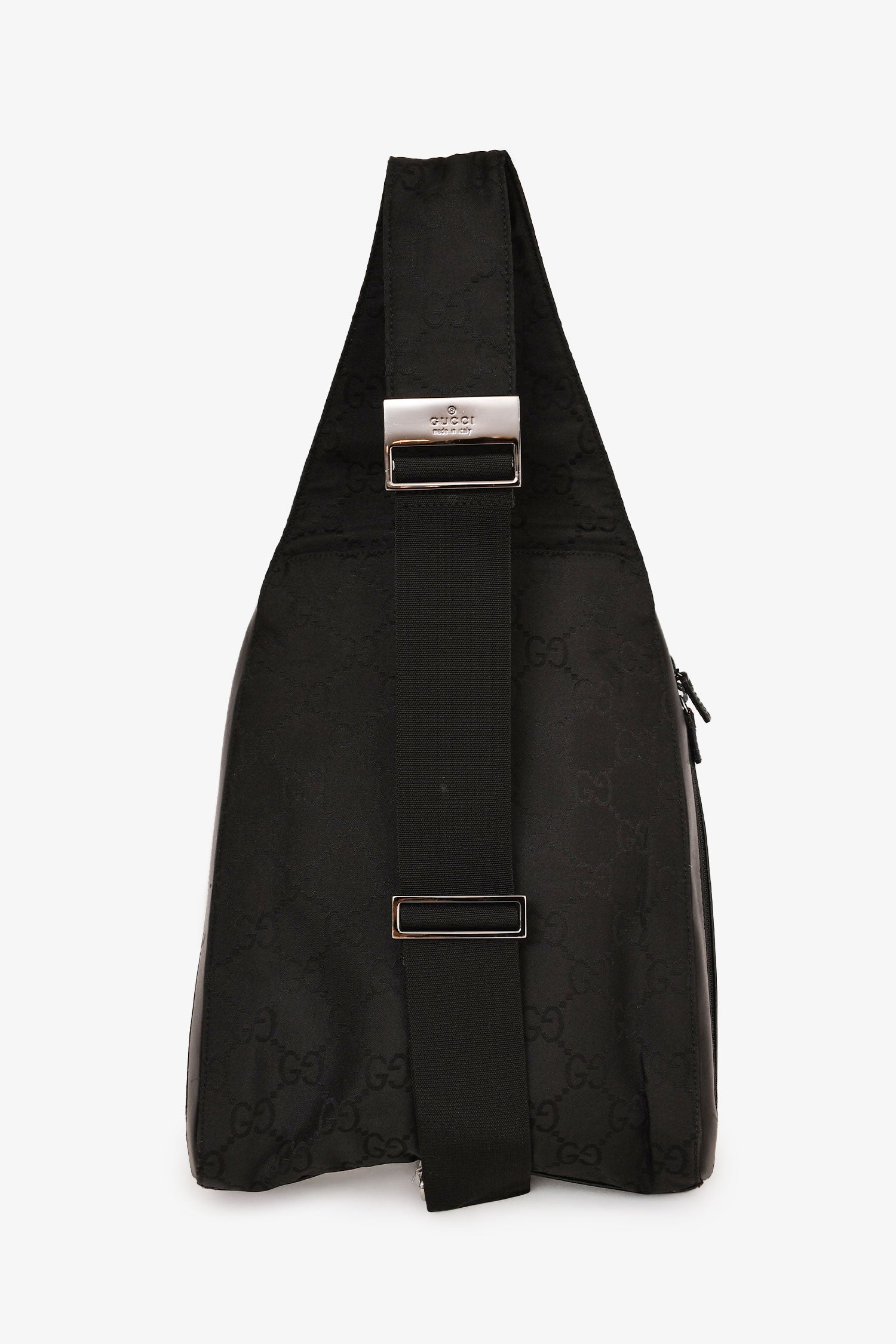 Refresh availabilityGucci Black Monogram Sling Bag Backpack. Leather trimming. Monogrammed exterior. Silver-tone hardware. Lined interior. Zipped pocket. Adjustable sling strap. 1 slip pouch and 3 pen holders. Tonal stitching.