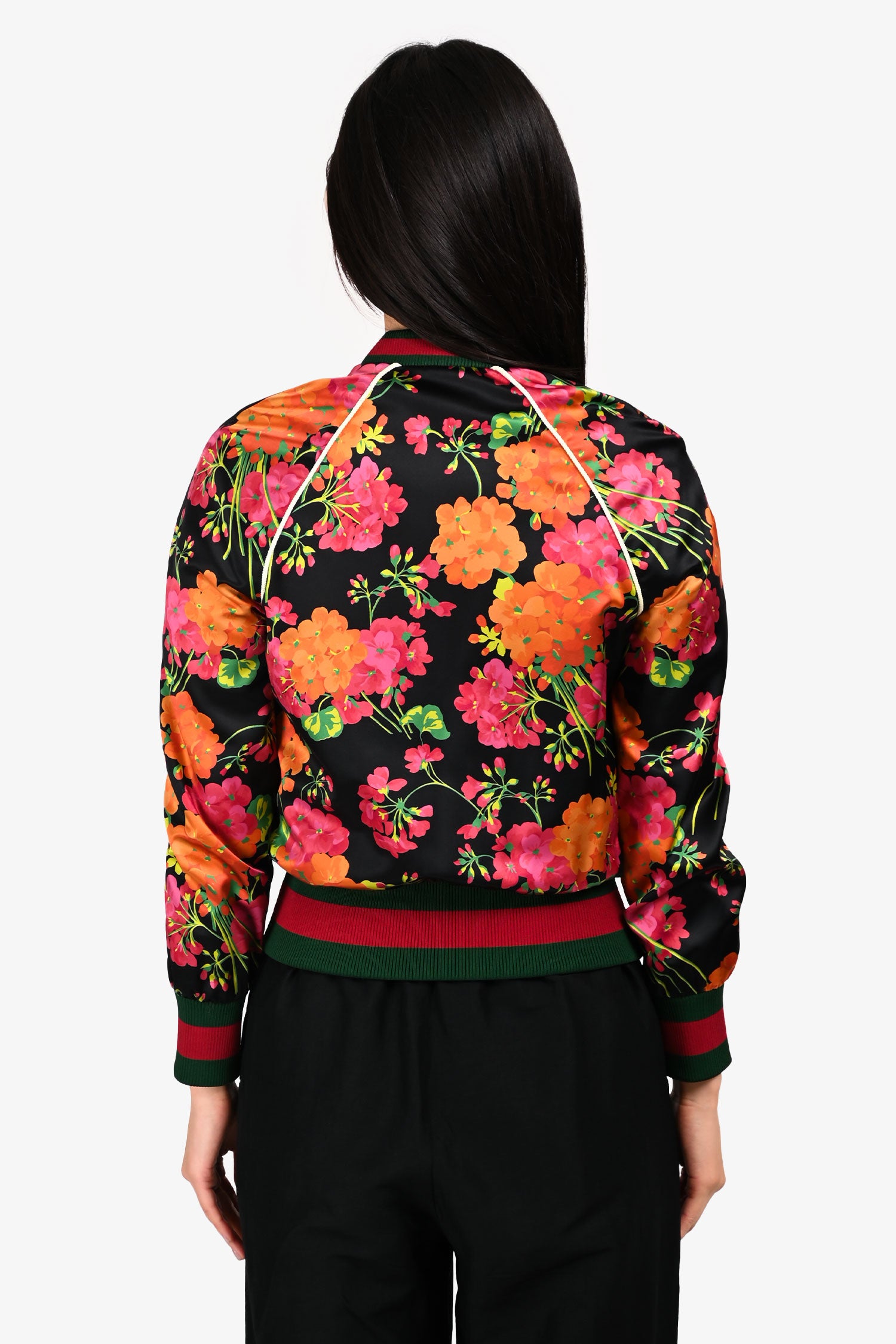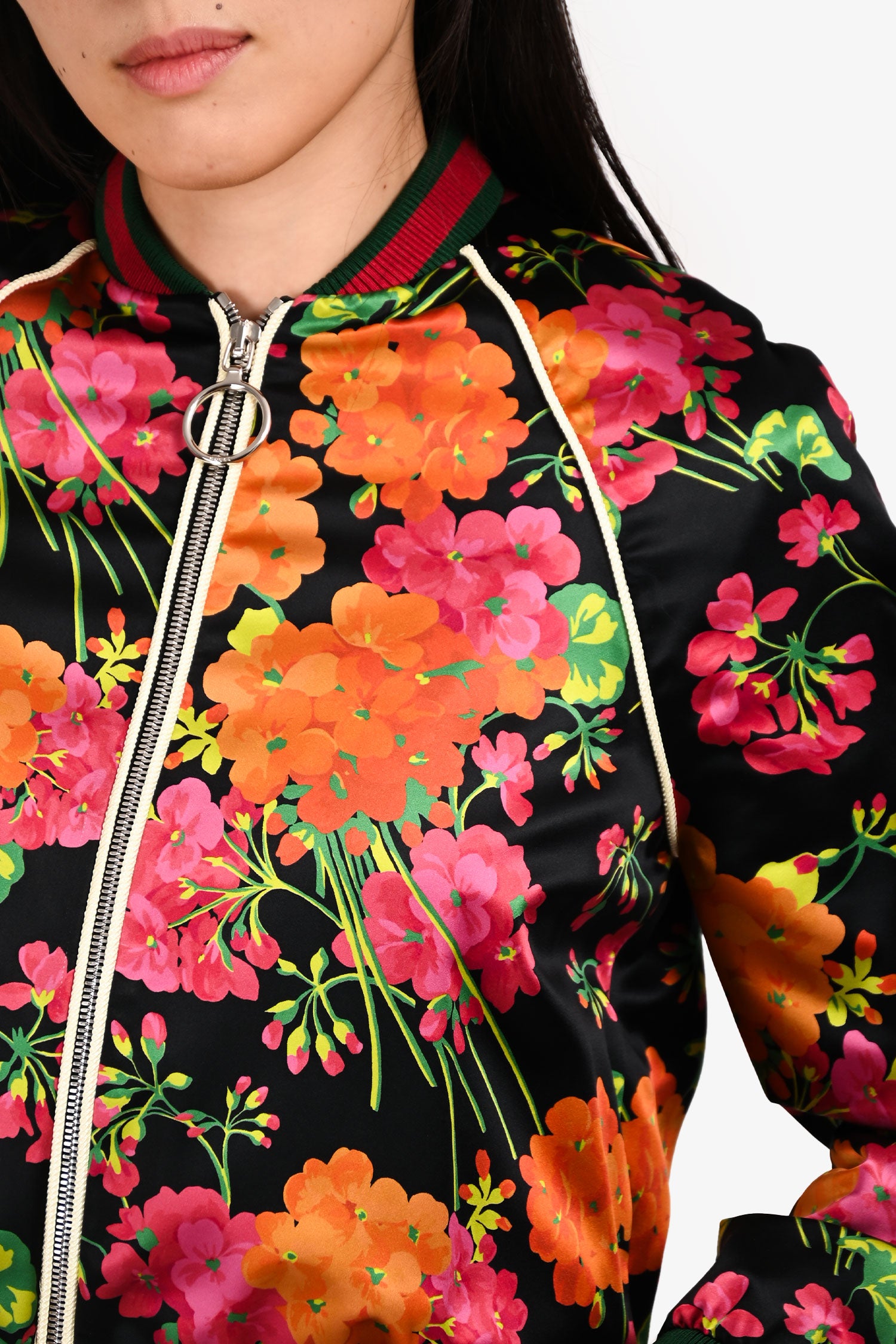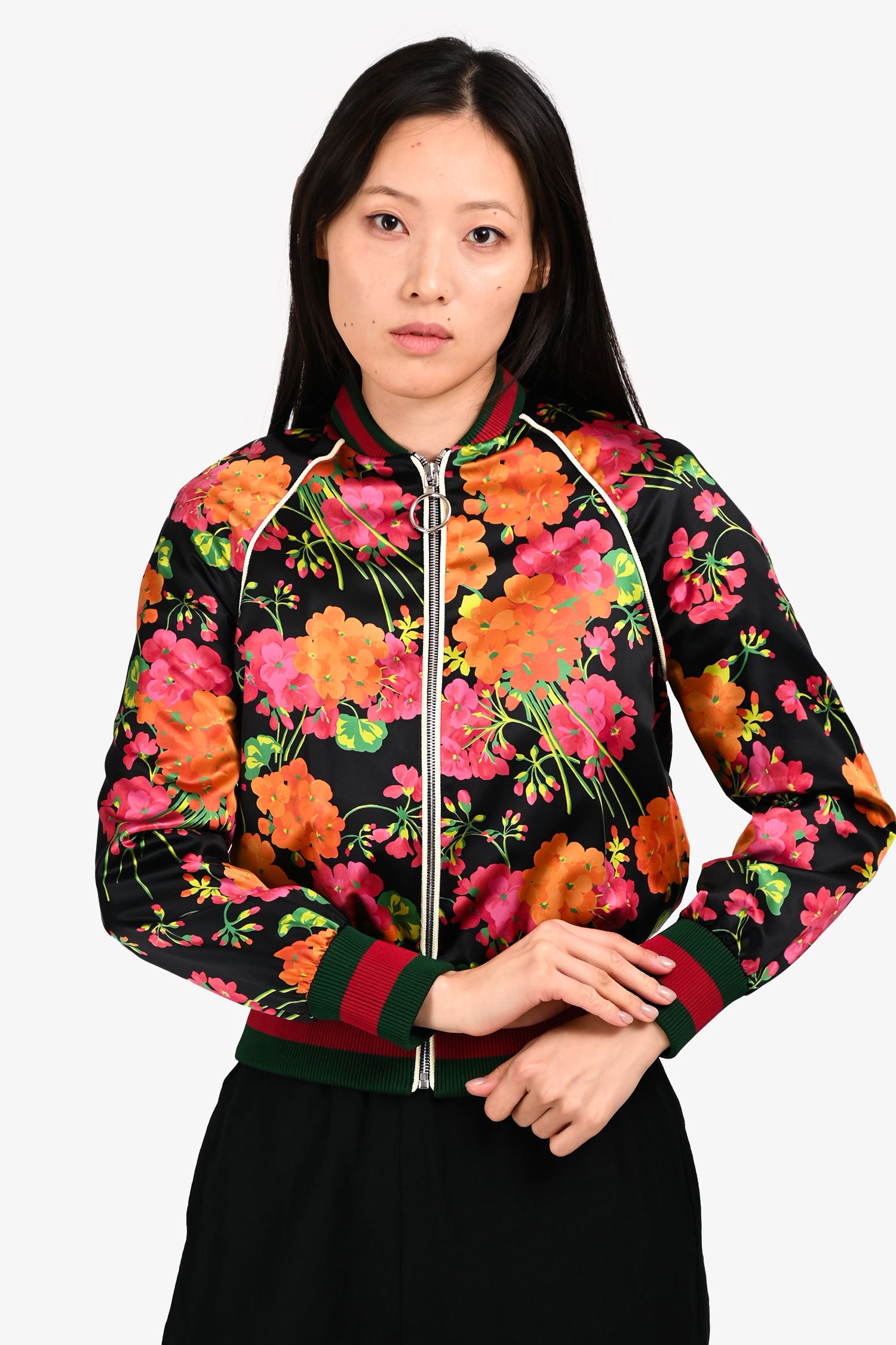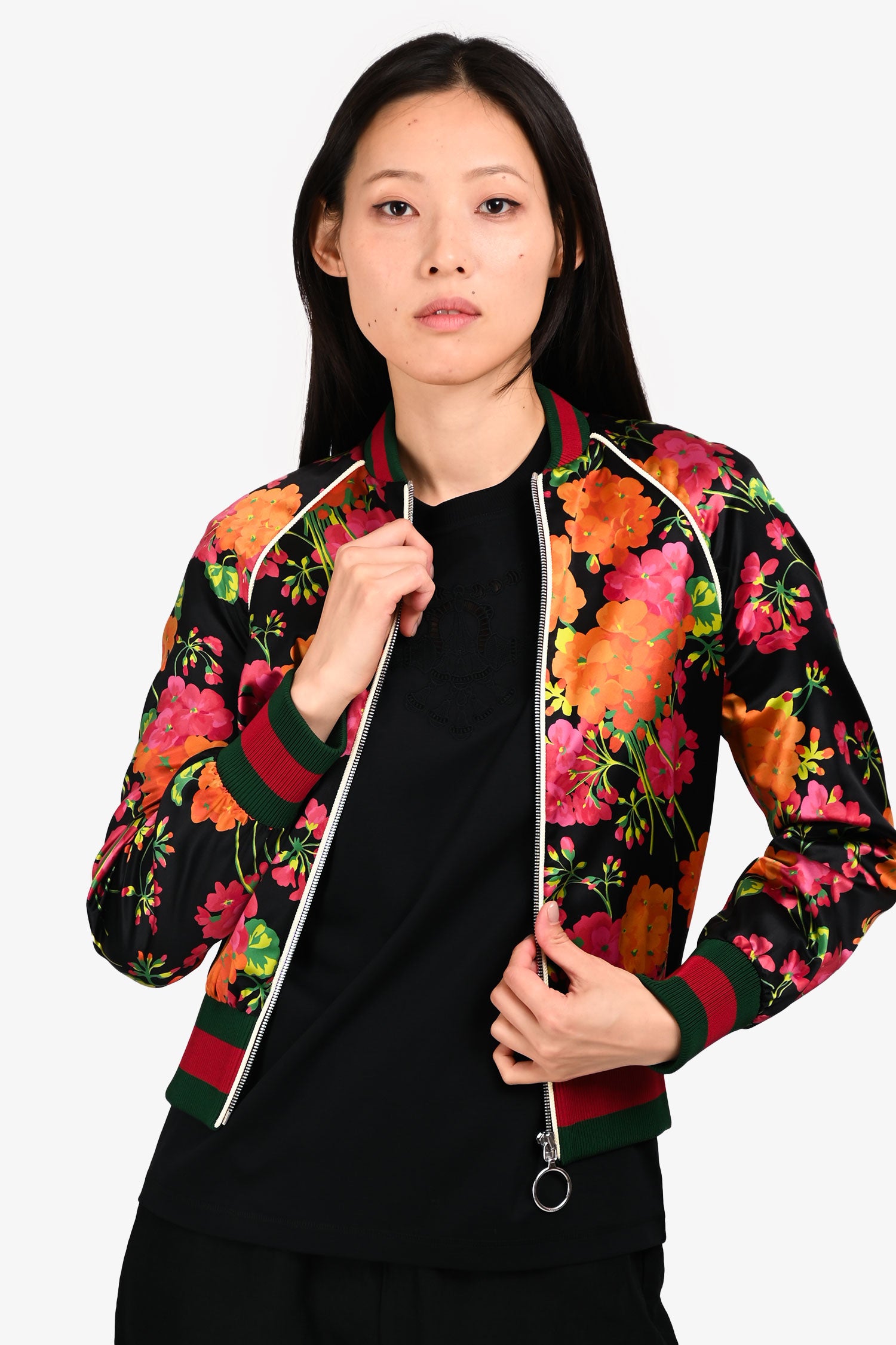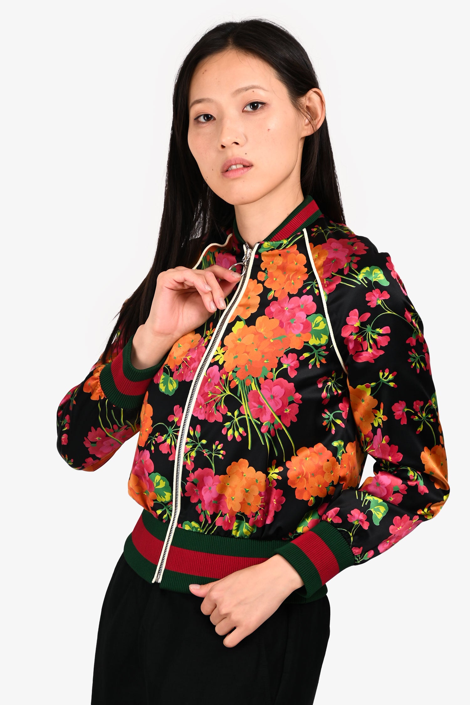 Refresh availabilityGucci Black/Multi Floral Silk Zip-Up Bomber Jacket. Front two-way zip closure. Front pockets. Lined. Ribbed neck, cuffs, and hem.