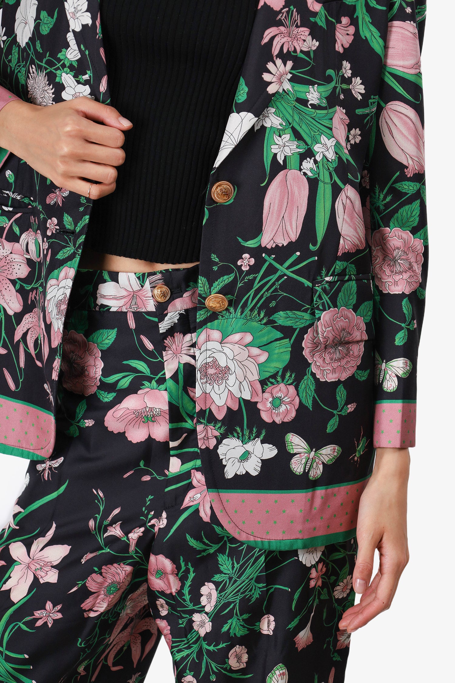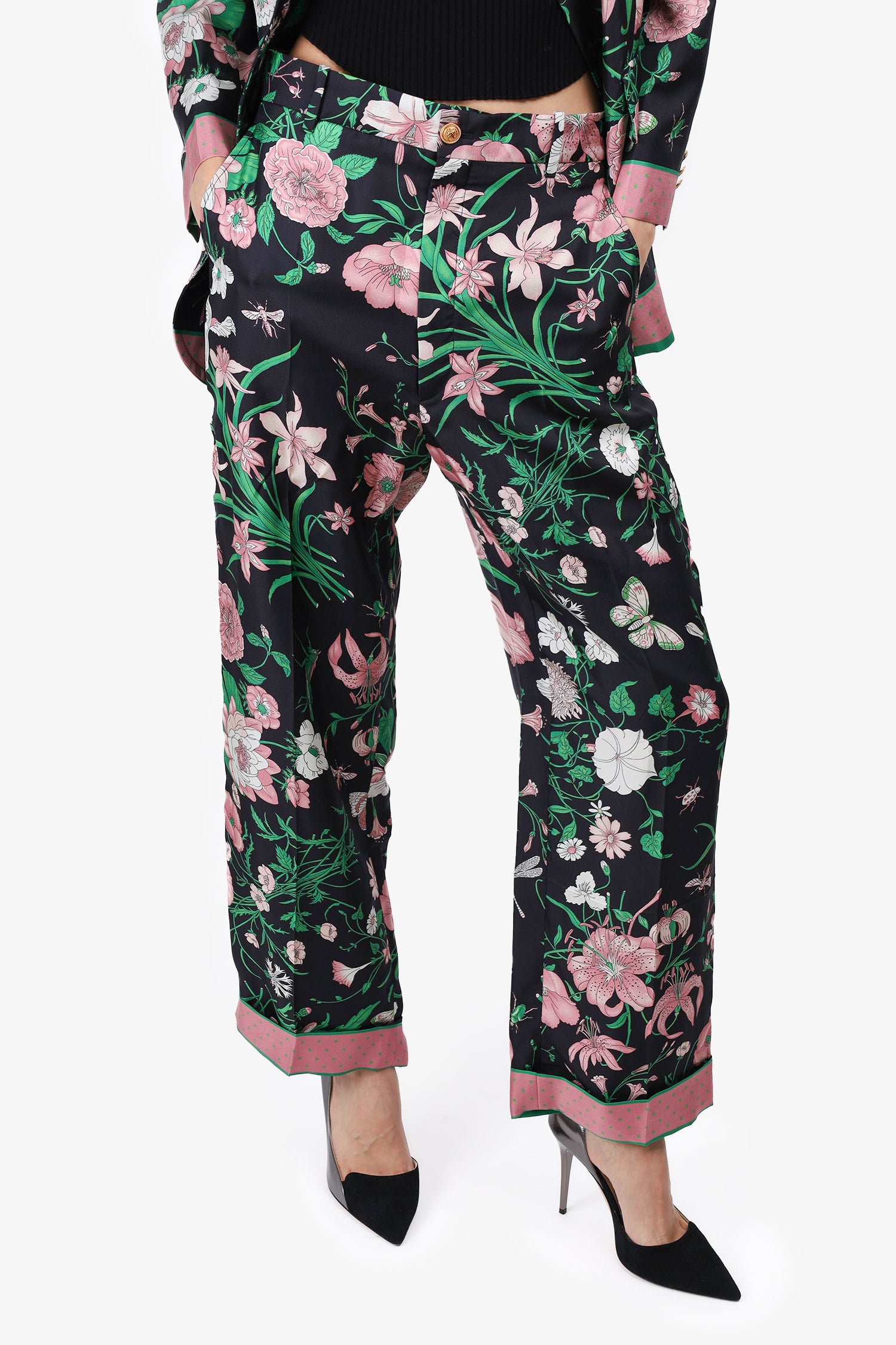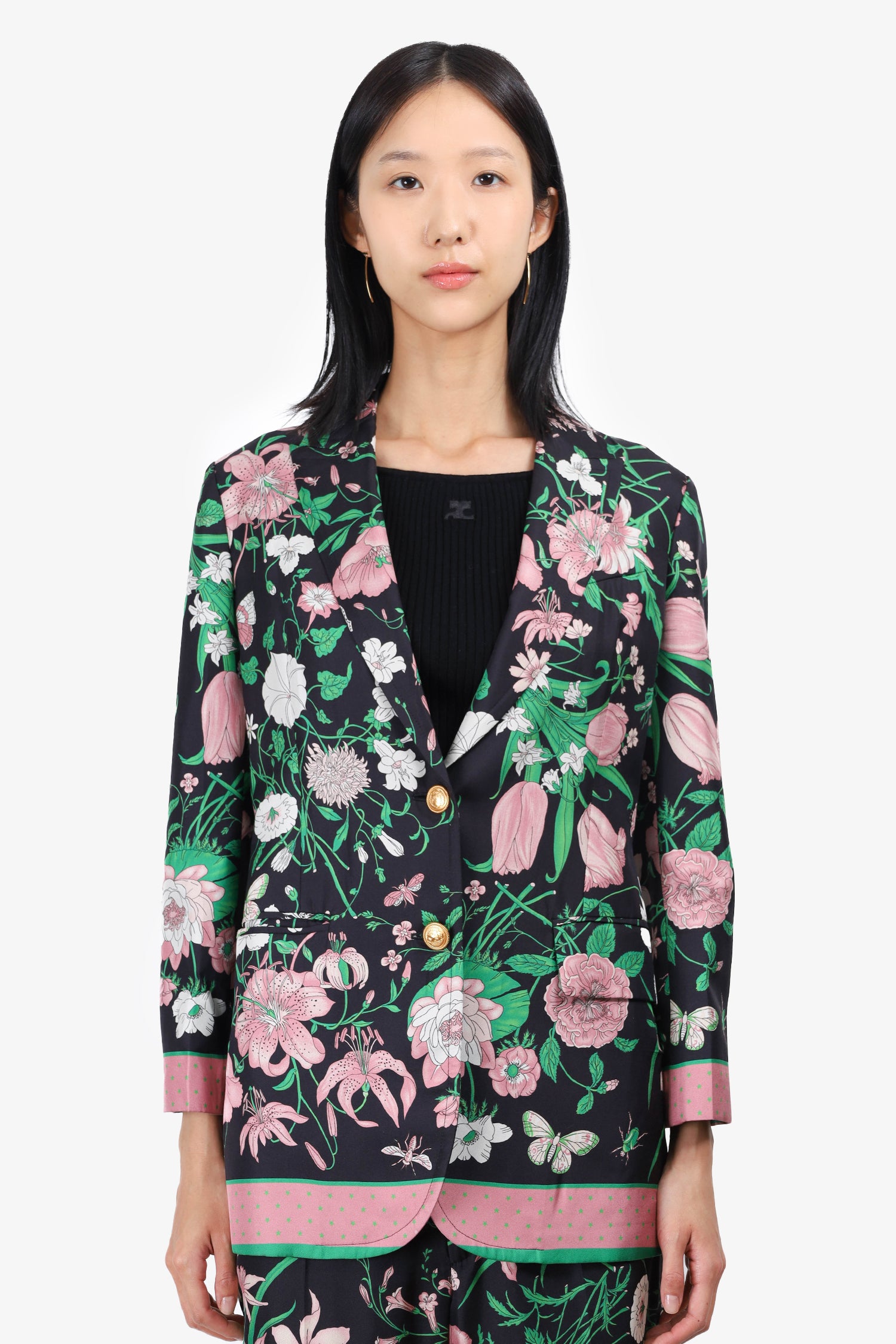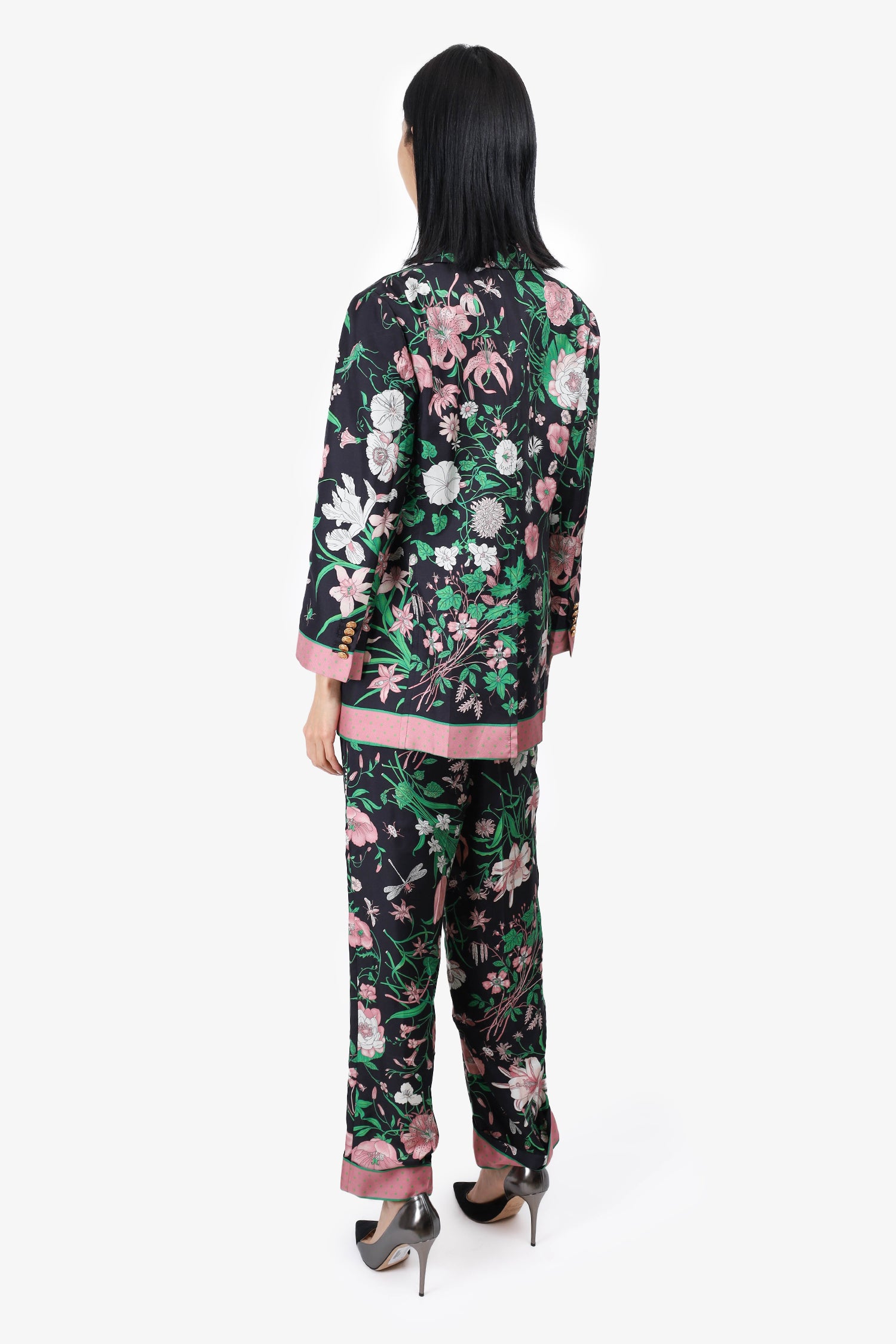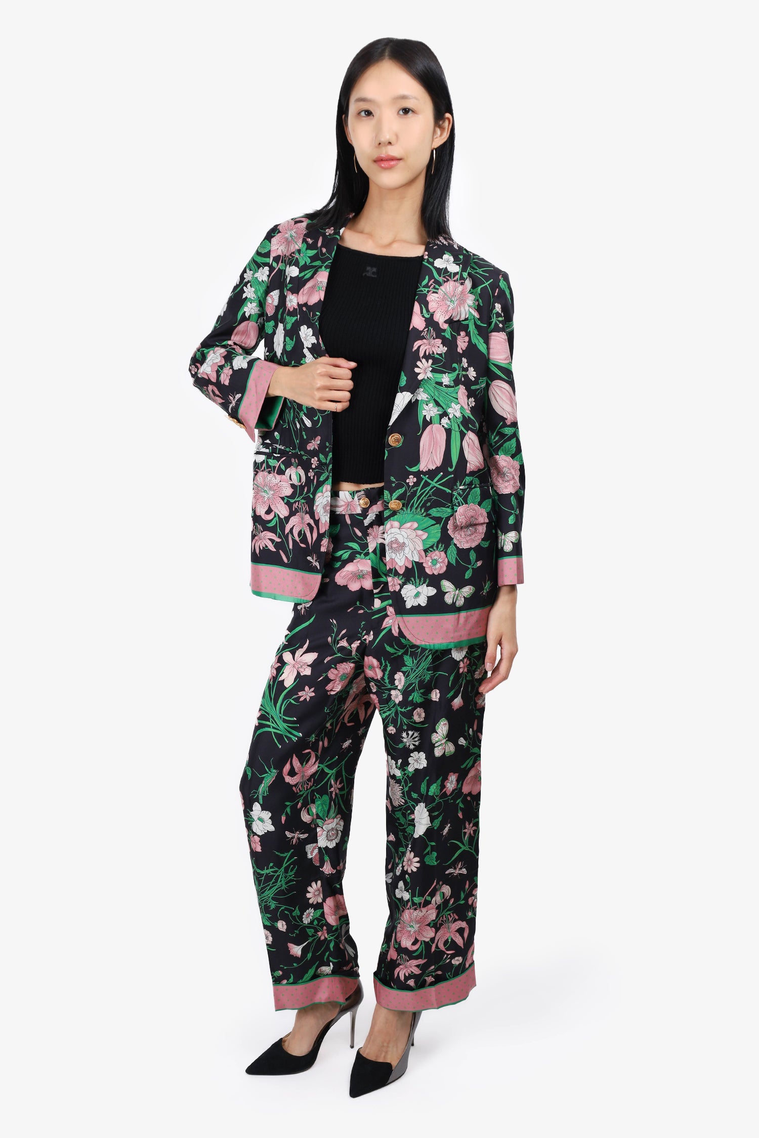 Refresh availabilityGucci Black/Multicolour Silk Floral Print Blazer With Trousers Set. Blazer; Collared v-neckline. Double front button-up closure. 2 front pockets with fold-over flap. Button-up detail on sleeve cuffs. Lined. Pants; Front zip and button-up closure. Belt loops around waist. 2 front slip pockets. 2 rear pockets with button-up closure. Folded bottom pant leg hem. Unlined. Both pieces have tonal stitching and gold-tone hardware.