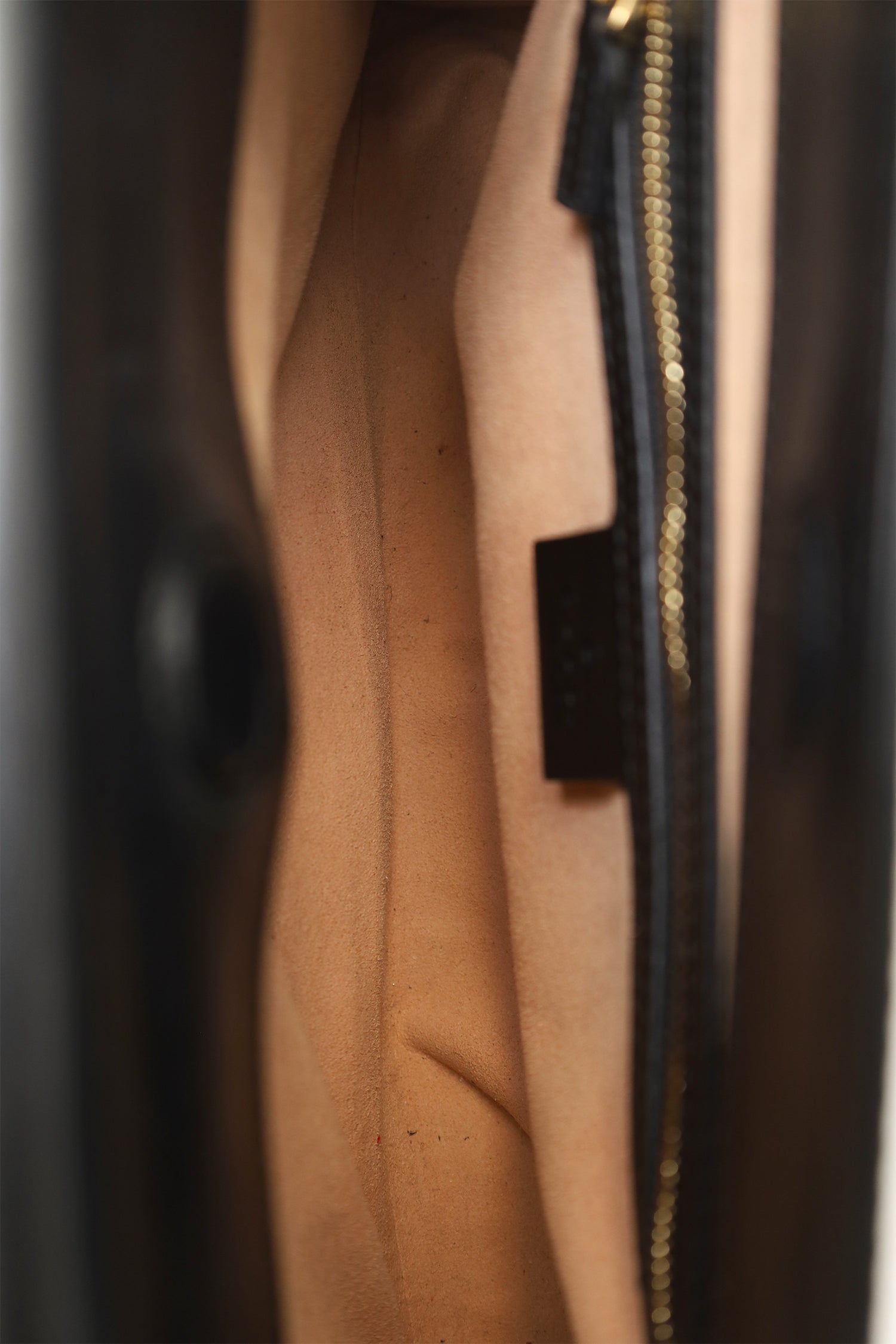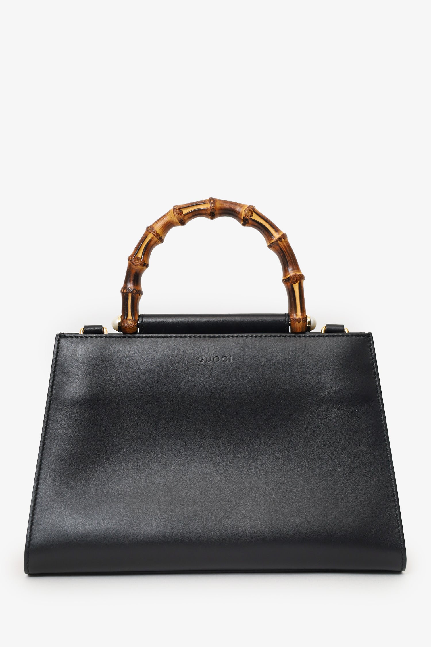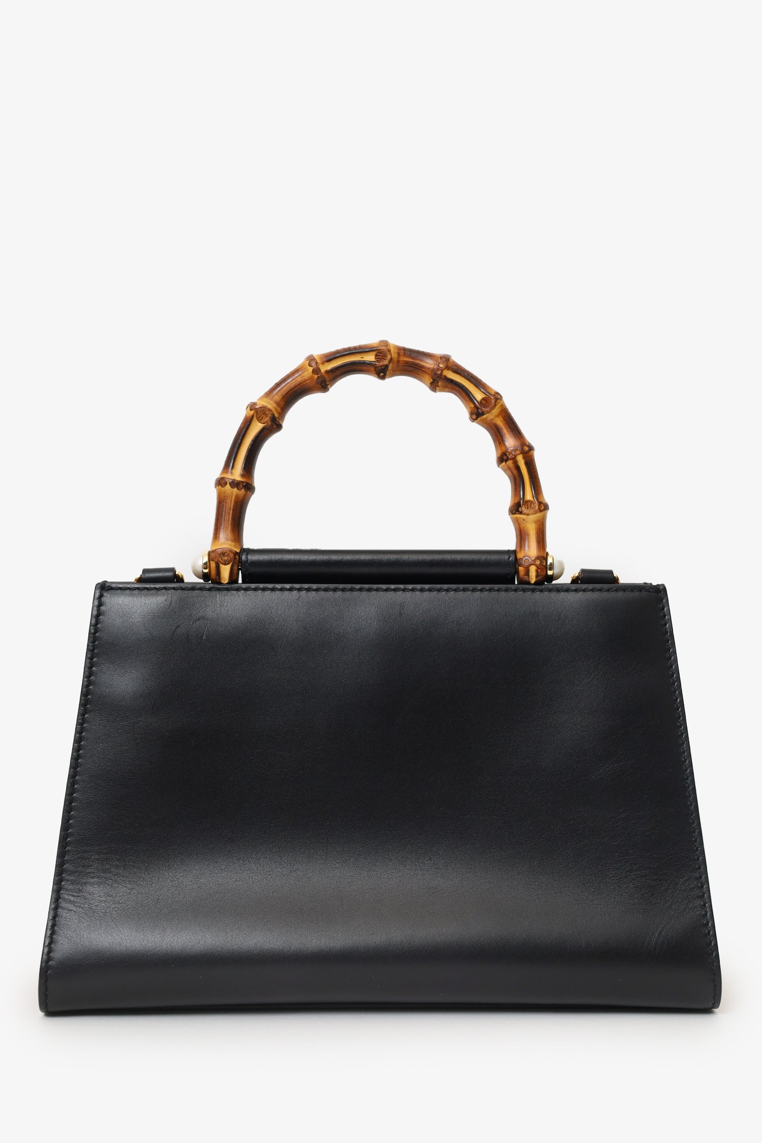 Refresh availabilityGucci Black Nymphaea Leather Bamboo Top Handle Bag. Top interior magnetic closures. 2 compartment; front with single interior slip pocket, rear with single interior zip pocket. Suede-lined interior. Gold-tone hardware. Tonal stitching.
