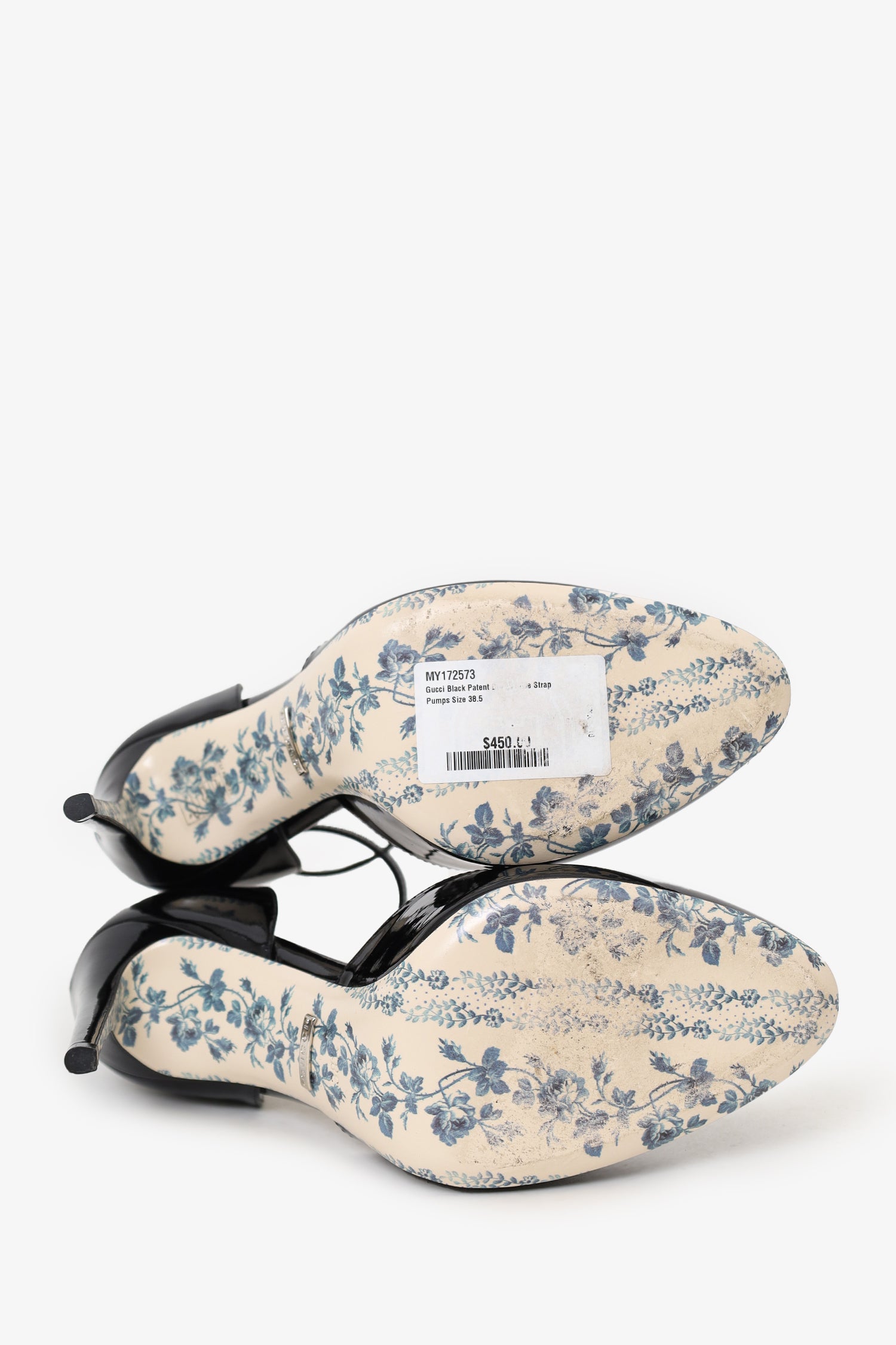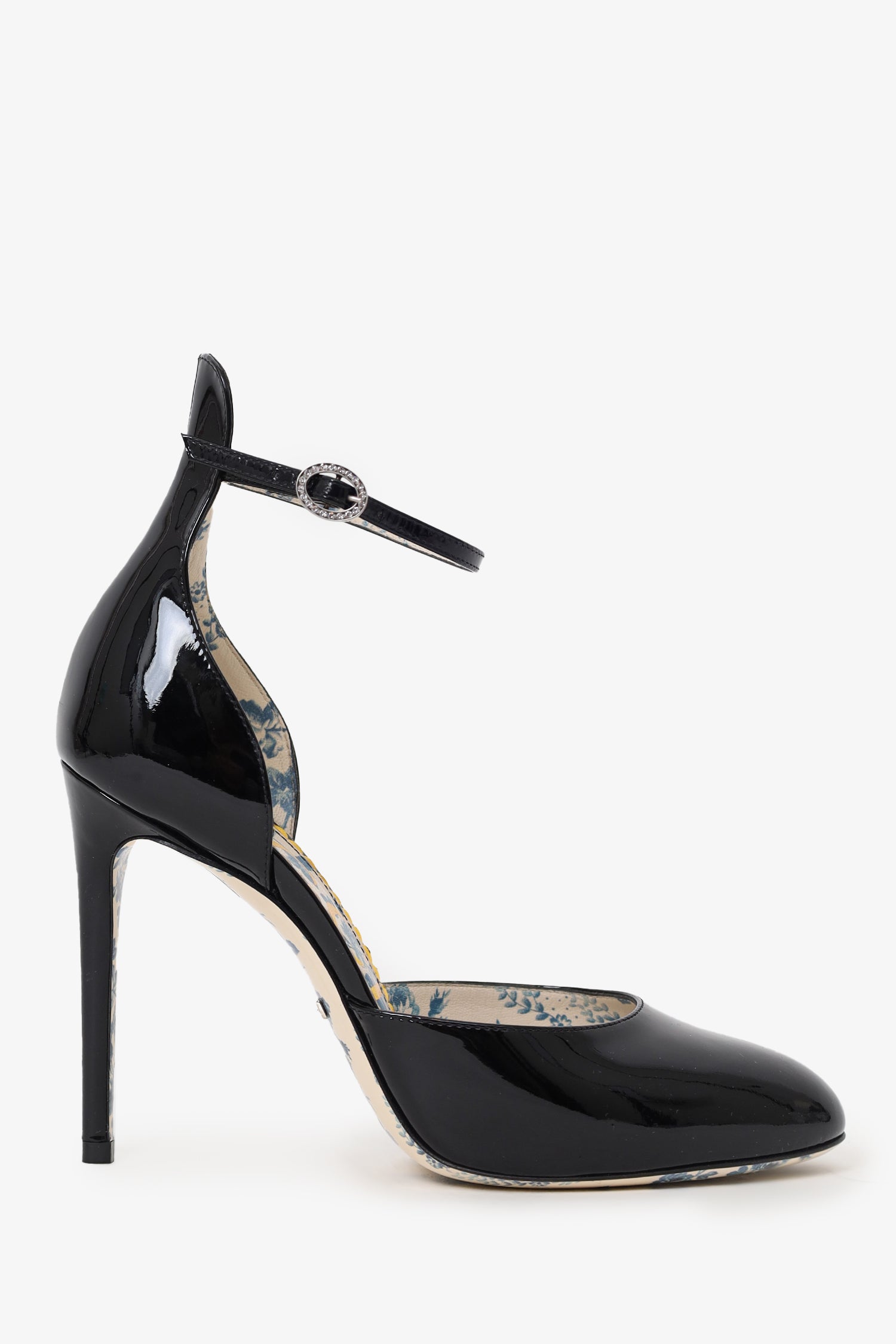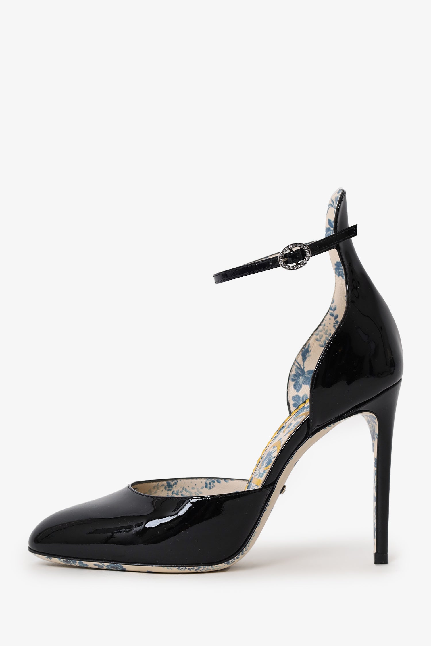 Refresh availabilityGucci Black Patent Daisy Ankle Strap Pumps. Slip-on. Round-toe. Ankle strap with adjustable buckle closure. Silver-tone hardware. Tonal stitching.