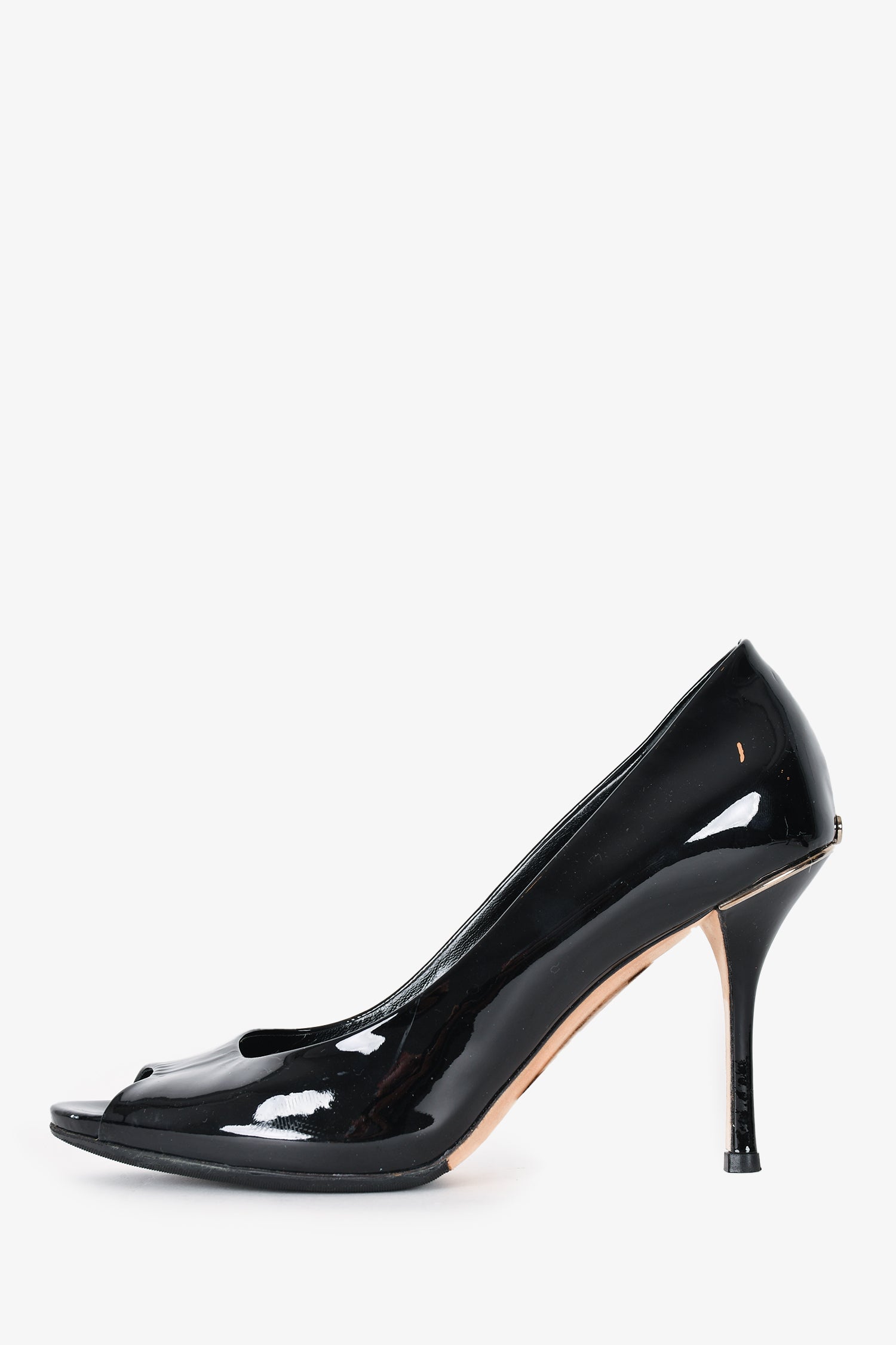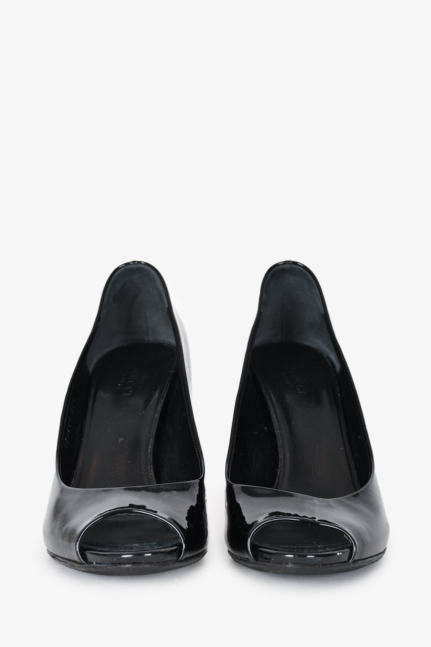 Refresh availabilityGucci Black Patent Leather Peep Toe Heels. Open toe. Skinny heel. Tonal stitching.