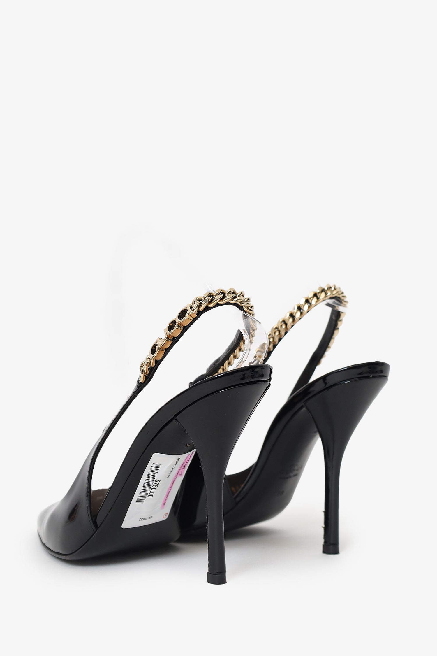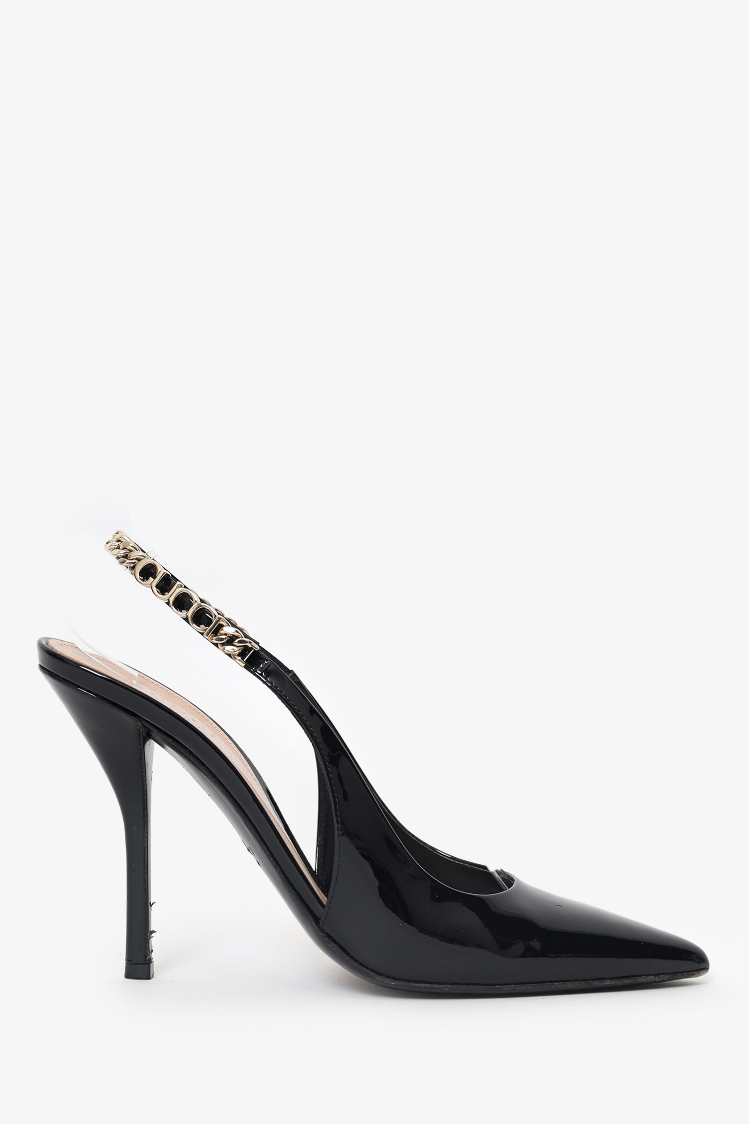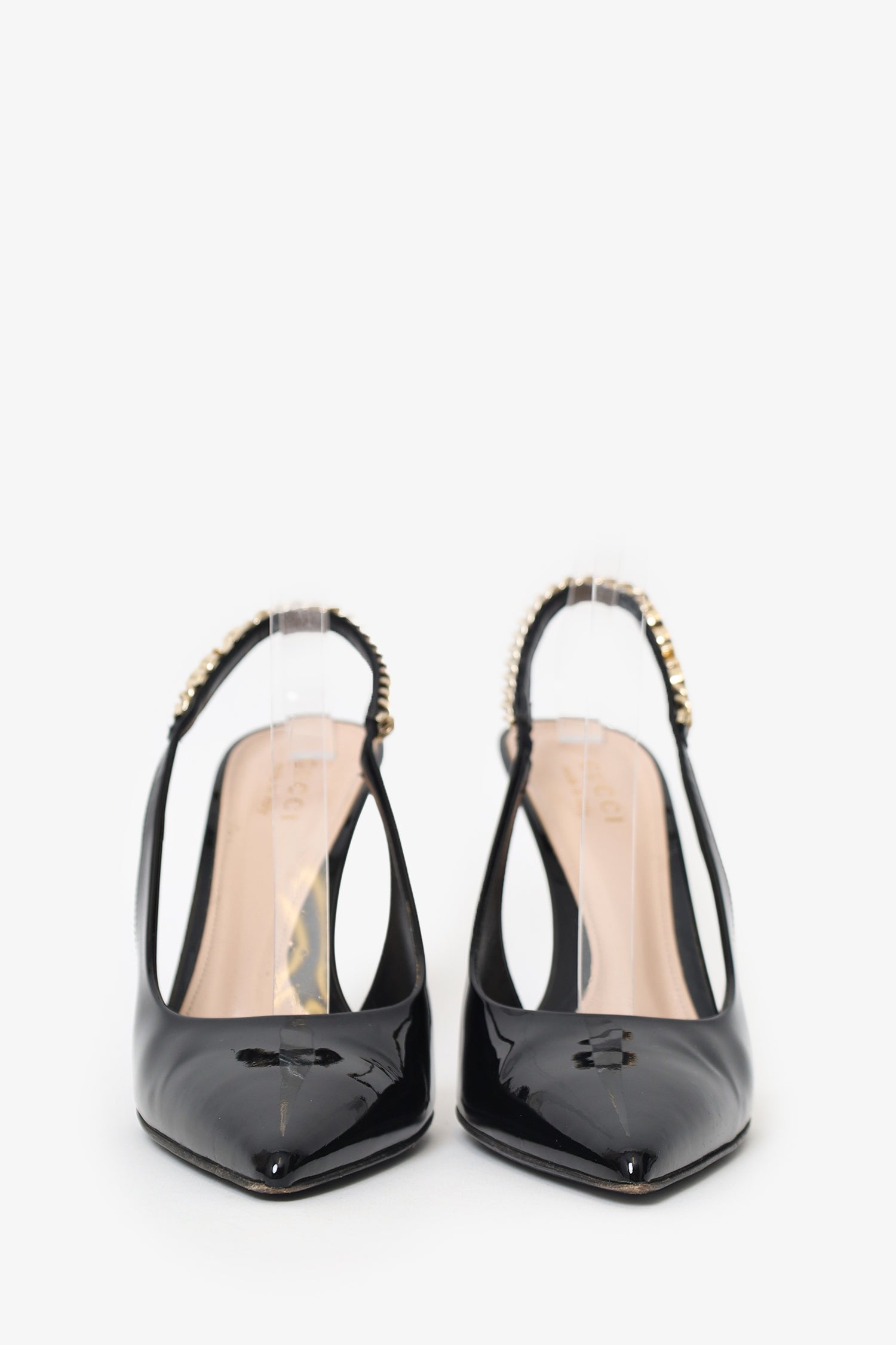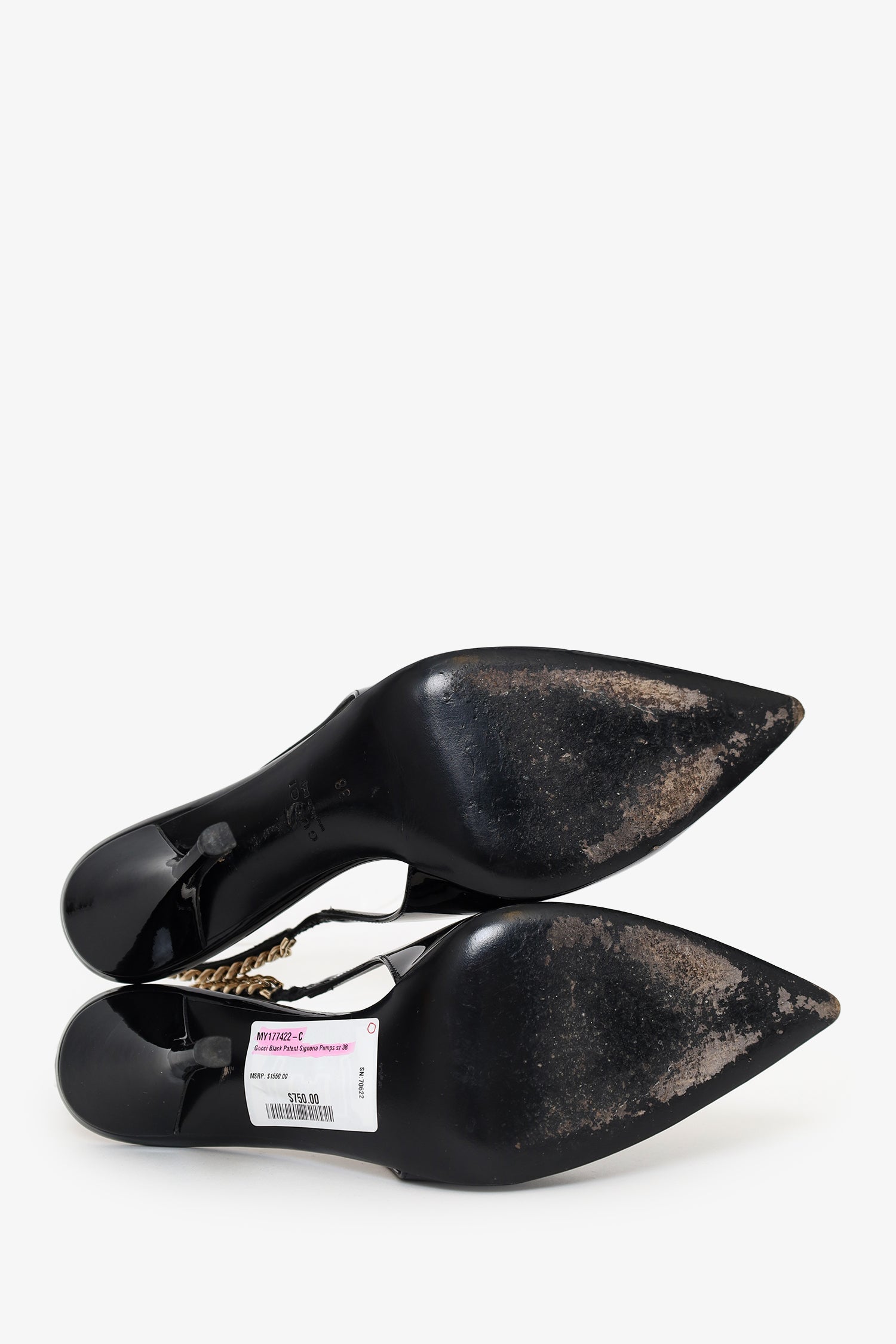 Refresh availabilityGucci Black Patent Signoria Pumps. Slip-on. Pointed toe. Lined interior. Gold-tone hardware. Tonal stitching.