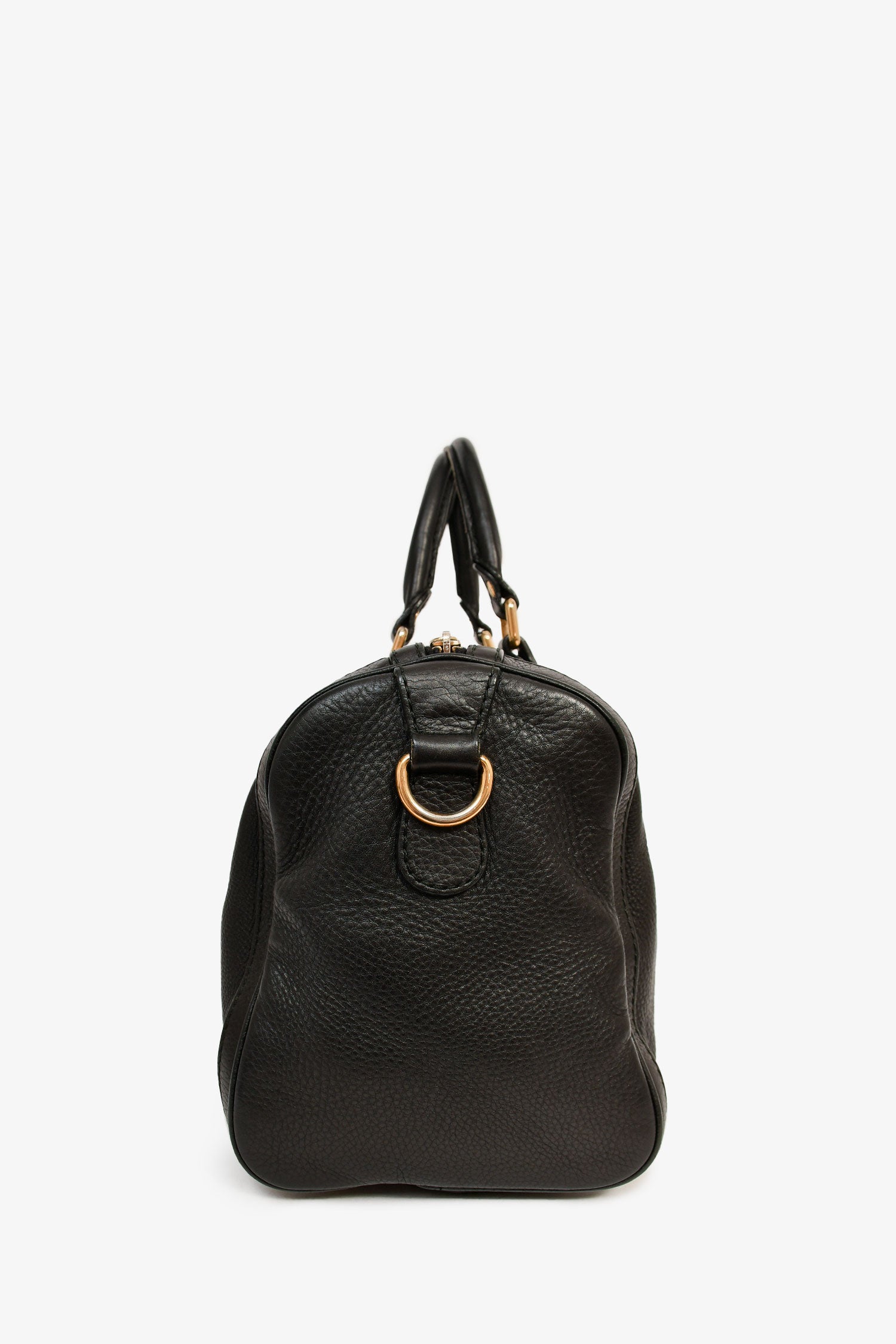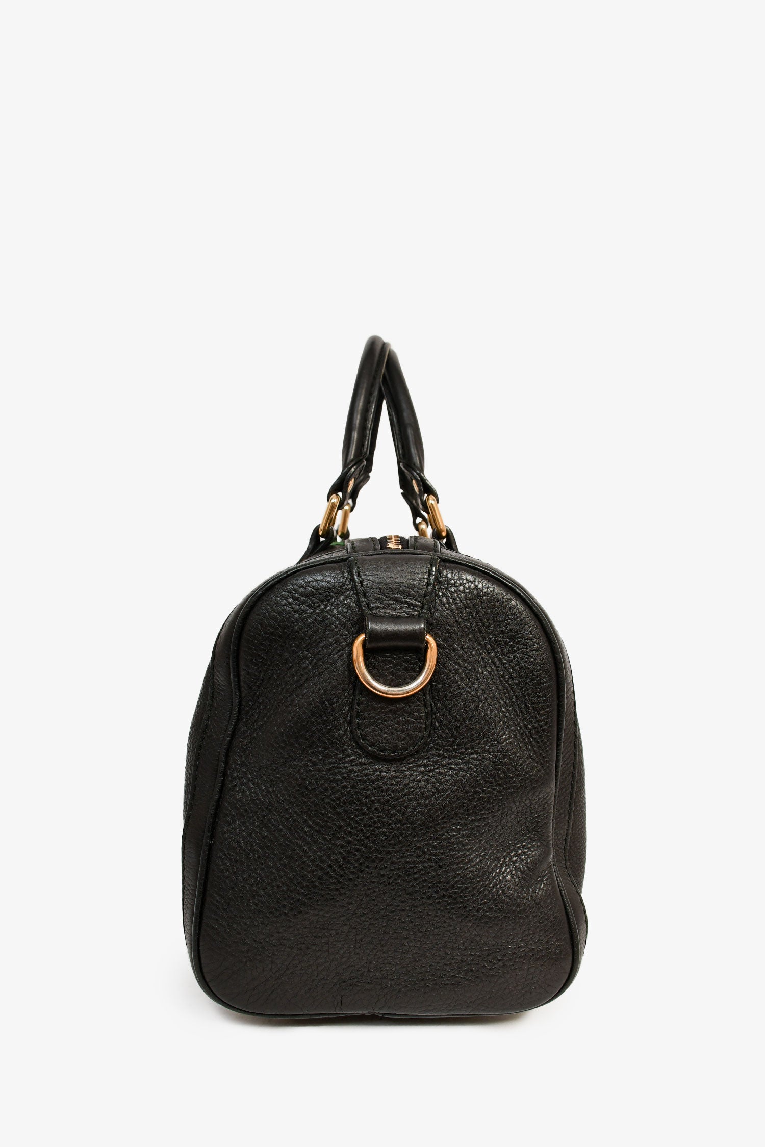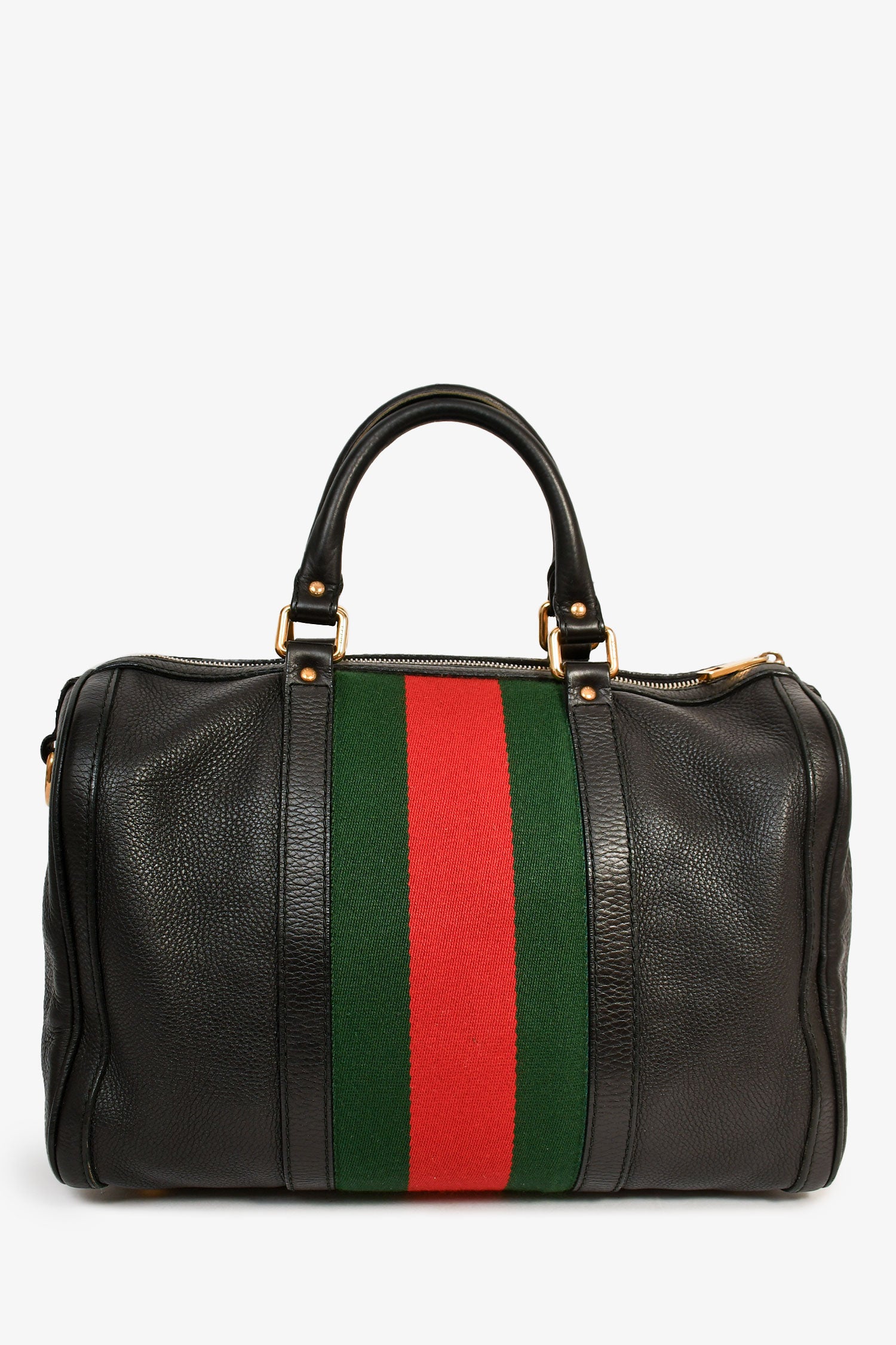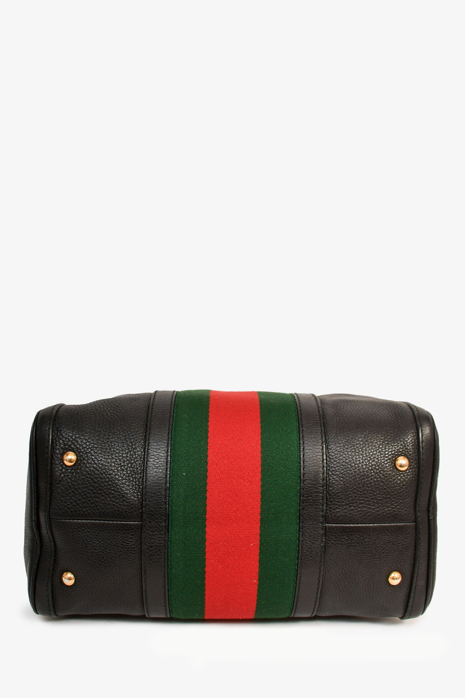 Refresh availabilityGucci Black Pebbled Leather Red/Green Striped Bowler Bag with Strap. Dual handle. Top zipper closure. Single interior compartment with two slip pockets and a wall zip pocket. Detachable and adjustable strap. Bottom protective studs. Textile lining. Gold-tone hardware. Tonal stitching.