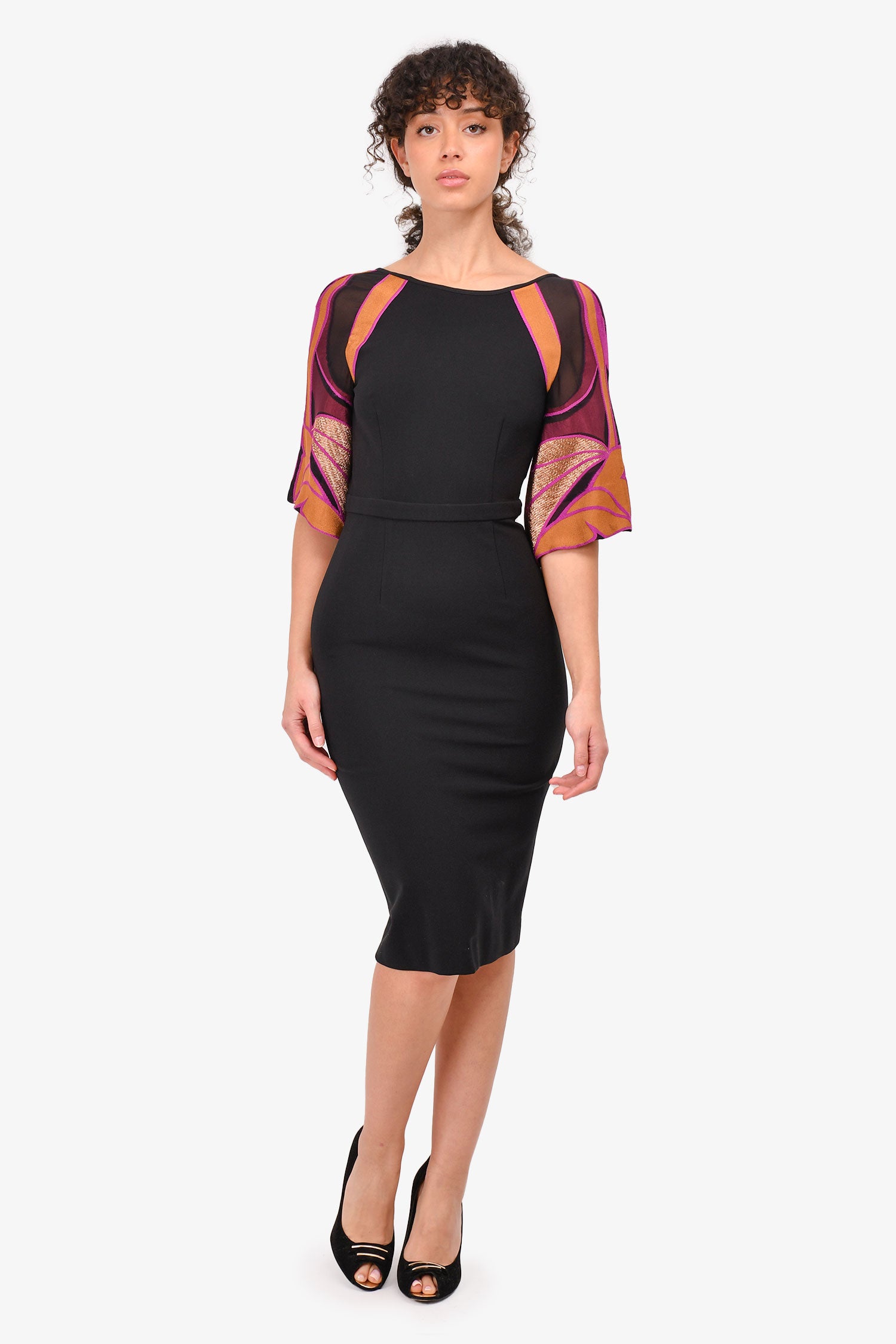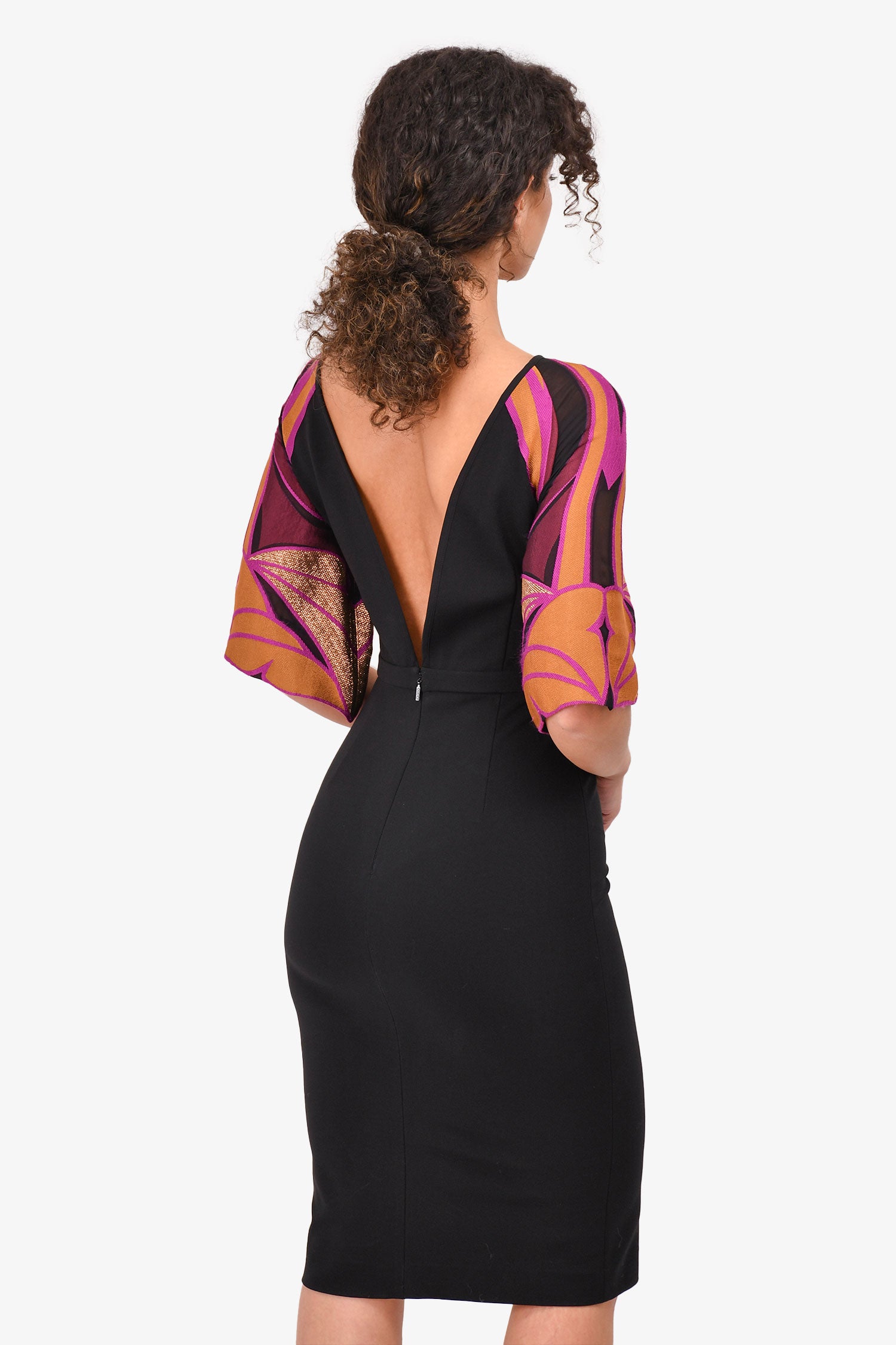 Refresh availabilityGucci Black/Purple Pattern Sleeve Low Back Midi Dress. Concealed back zipper and hook and eye closure. Low-back deep V. Round neck. Tonal stitching.