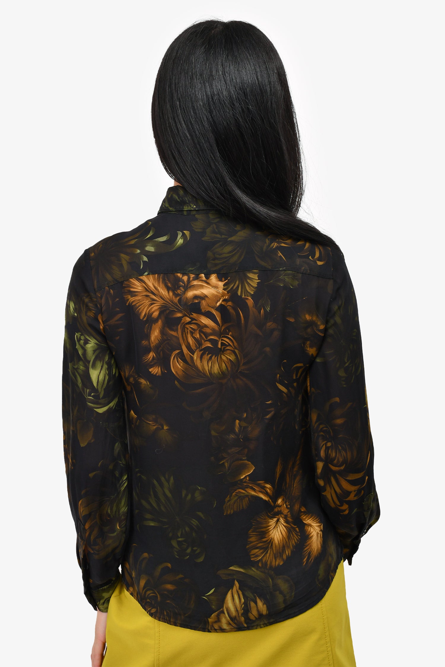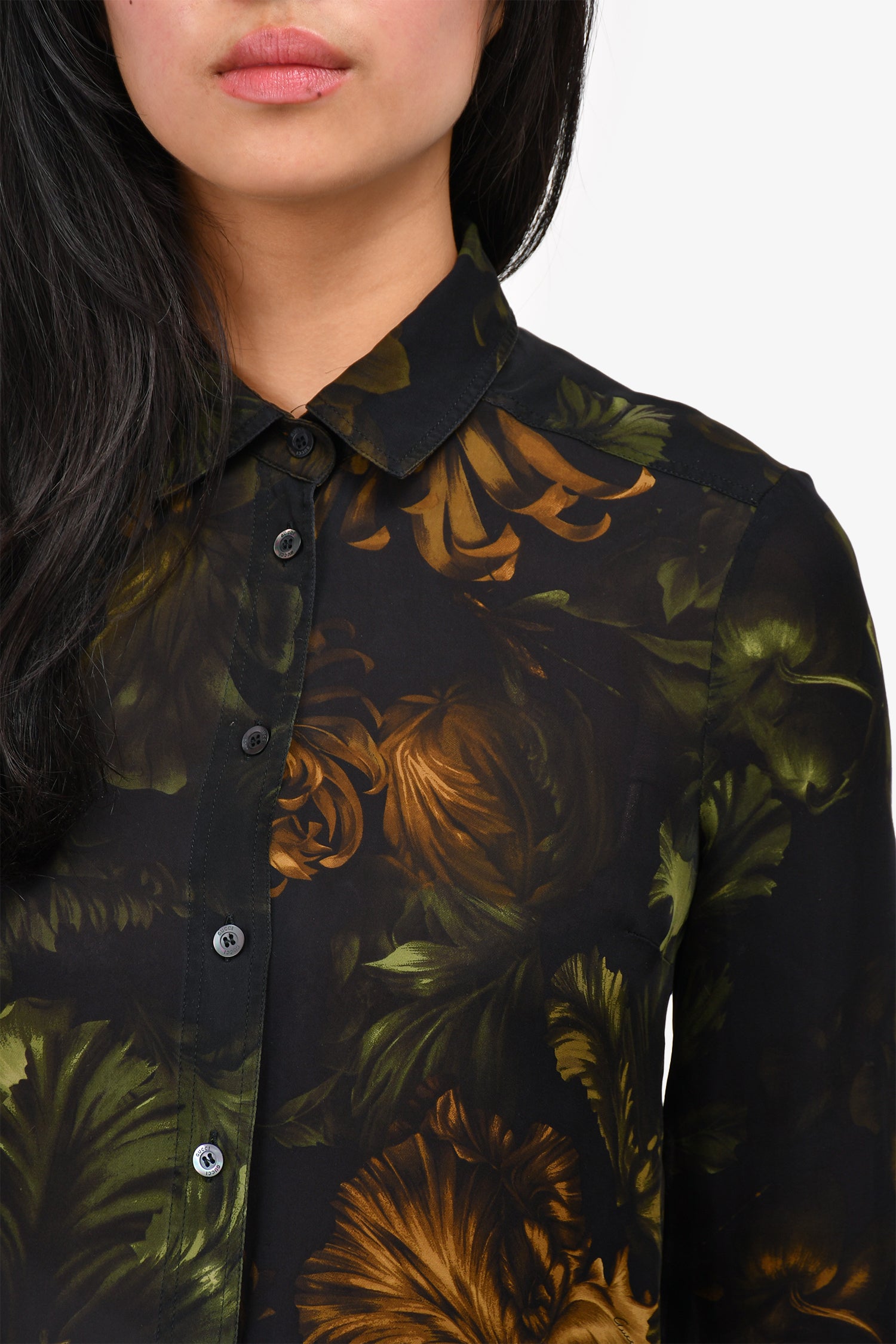Refresh availabilityGucci Black Sheer Leaf Print Silk Button Down Top. Front button-up closure. Button closures on the cuffs.