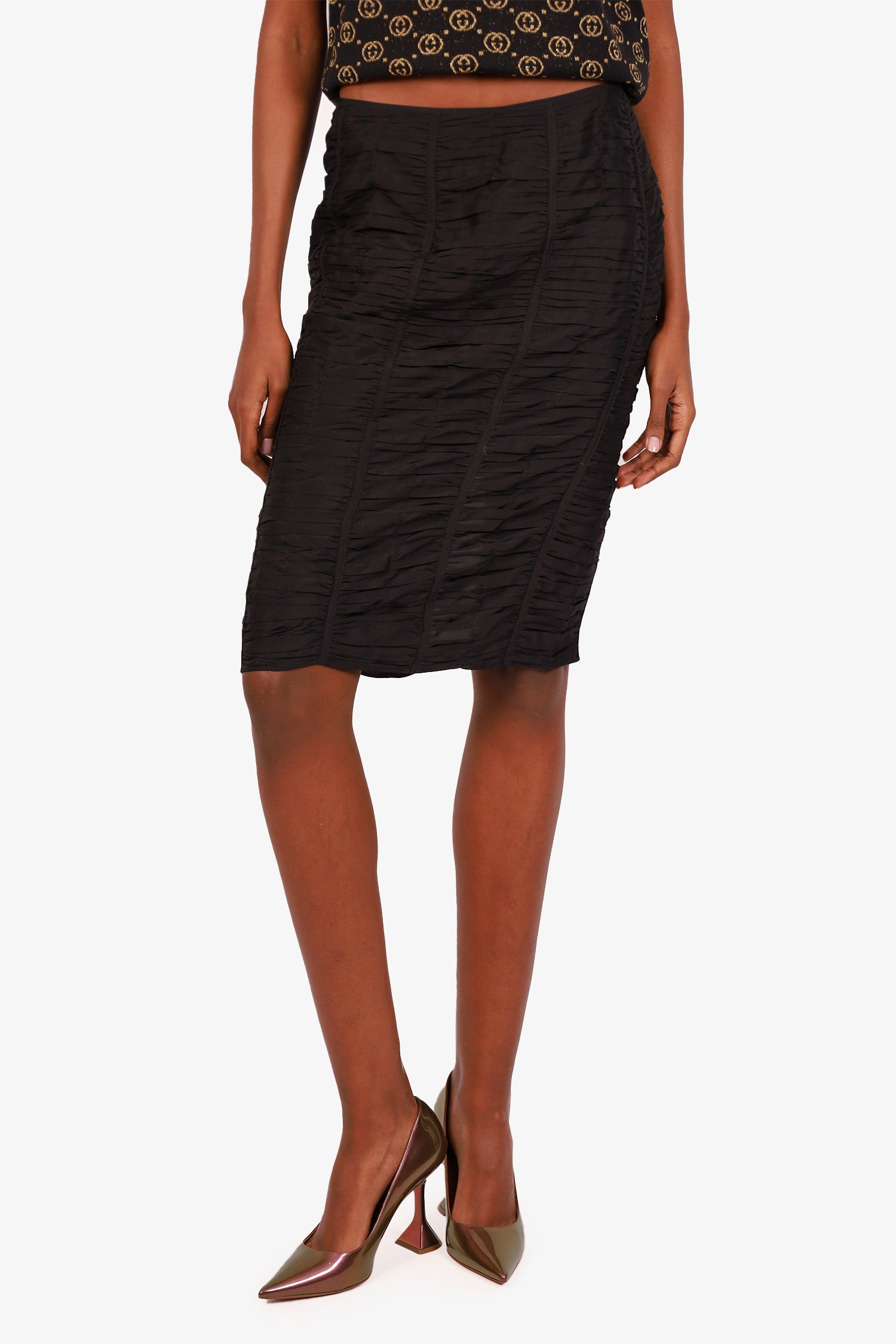Refresh availabilityGucci Black Silk Ruched Knee Length Skirt. Rear zip closure. Pull-on. Tonal stitching.