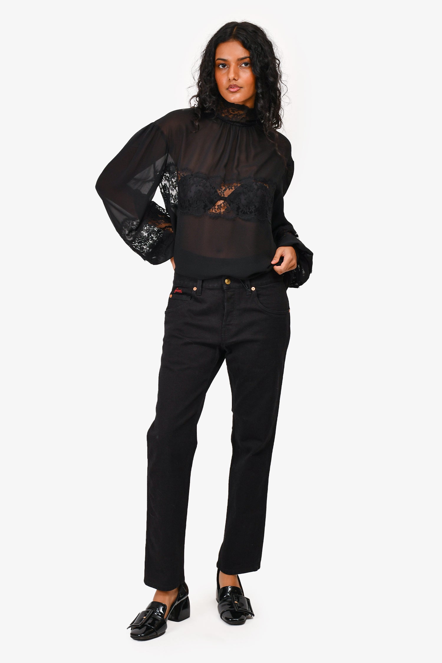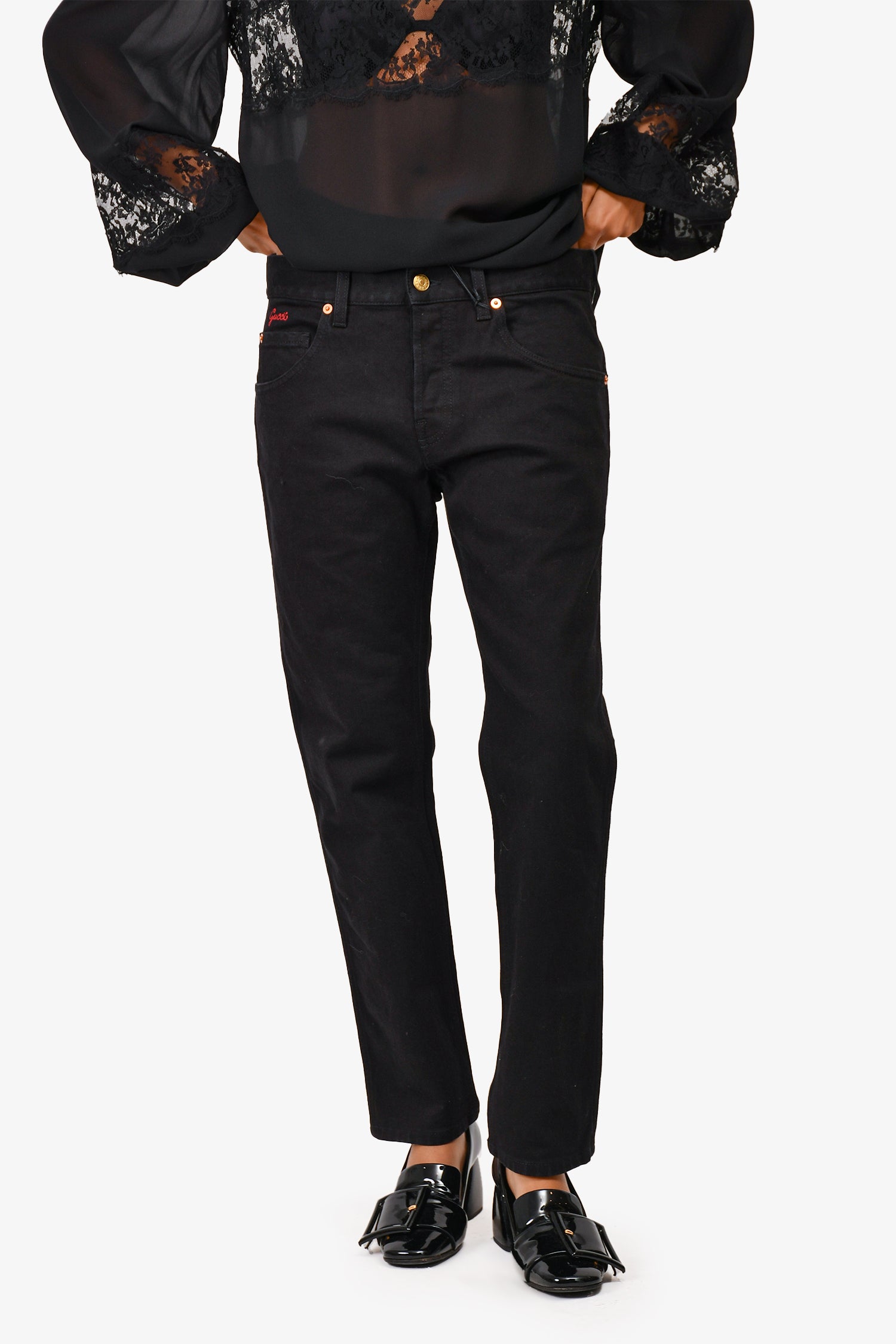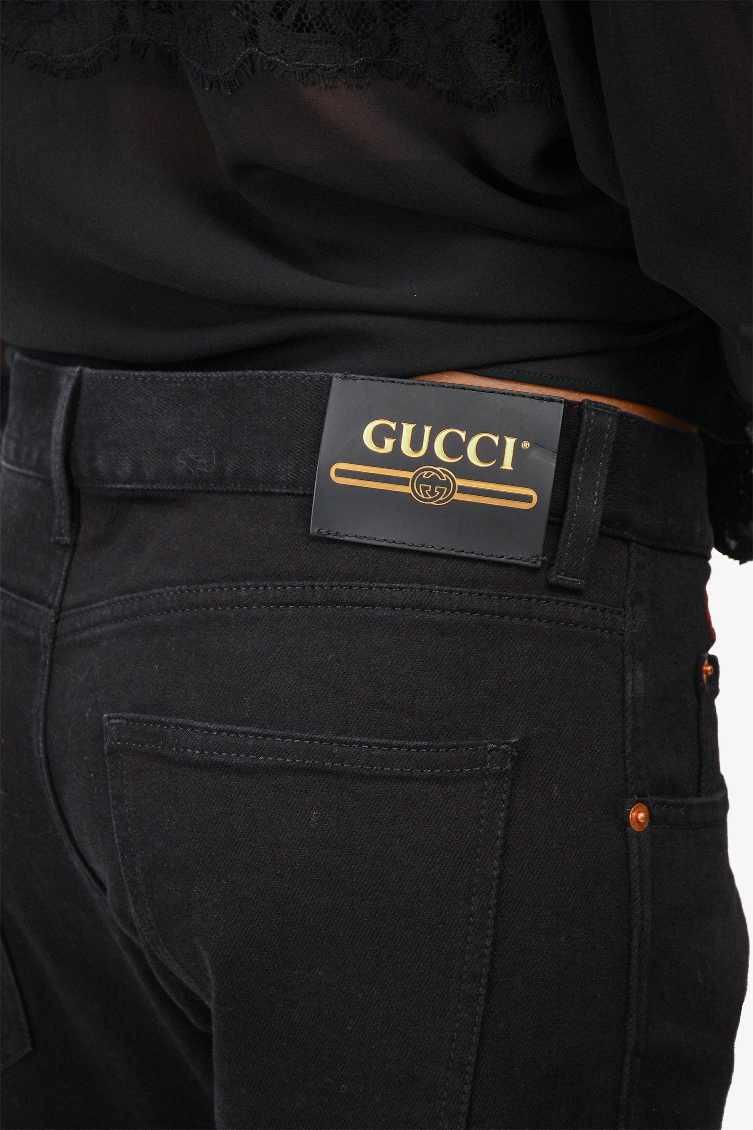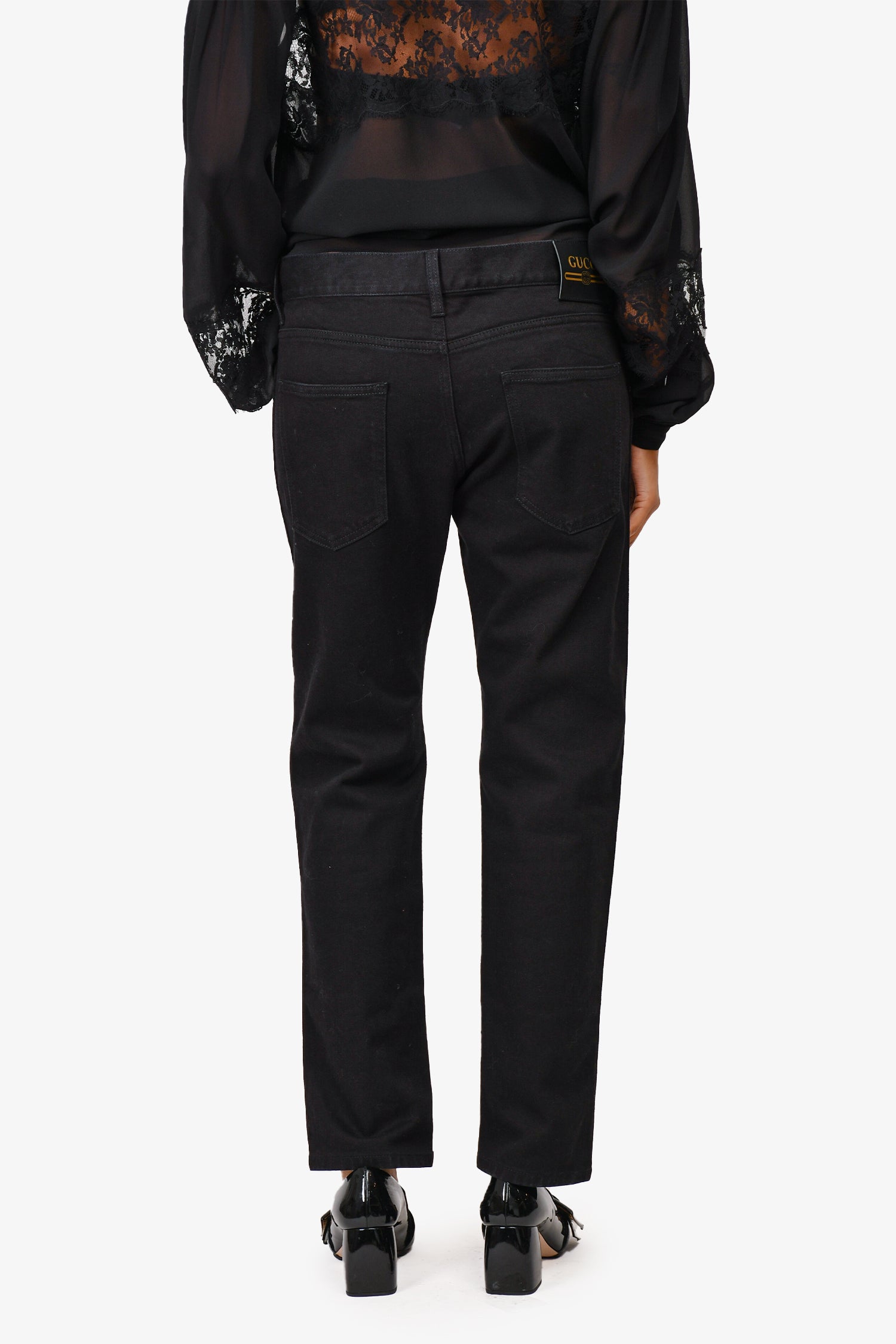 Refresh availabilityGucci Black Straight Leg Denim Jeans. Multi-button front fastening. Brass-tone hardware. 5 slip pockets. Stitched 'Gucci' logo. Tonal stitching.