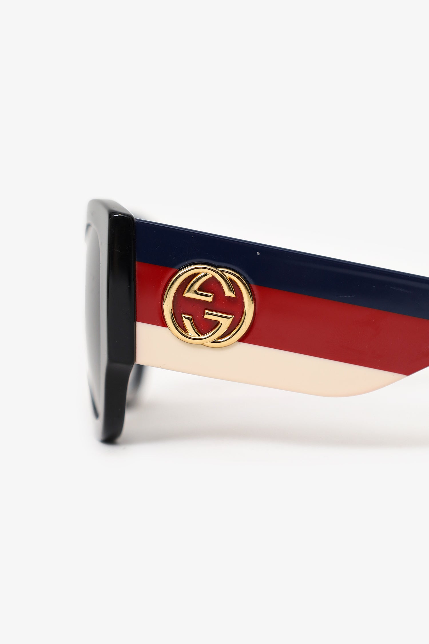 Refresh availabilityGucci Black Stripe Side 'GG' Sunglasses. Built-in nose pads. Gold-tone hardware.