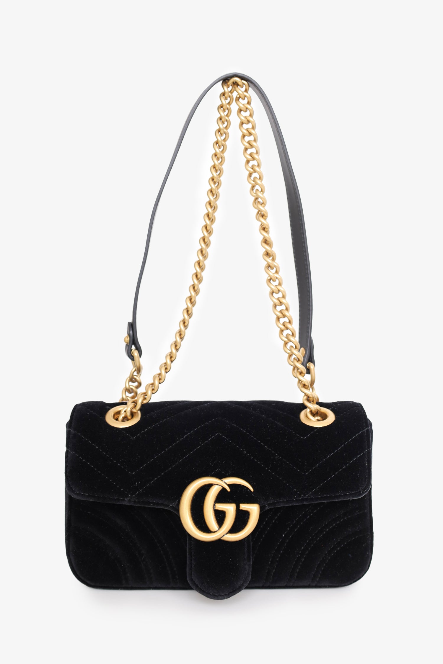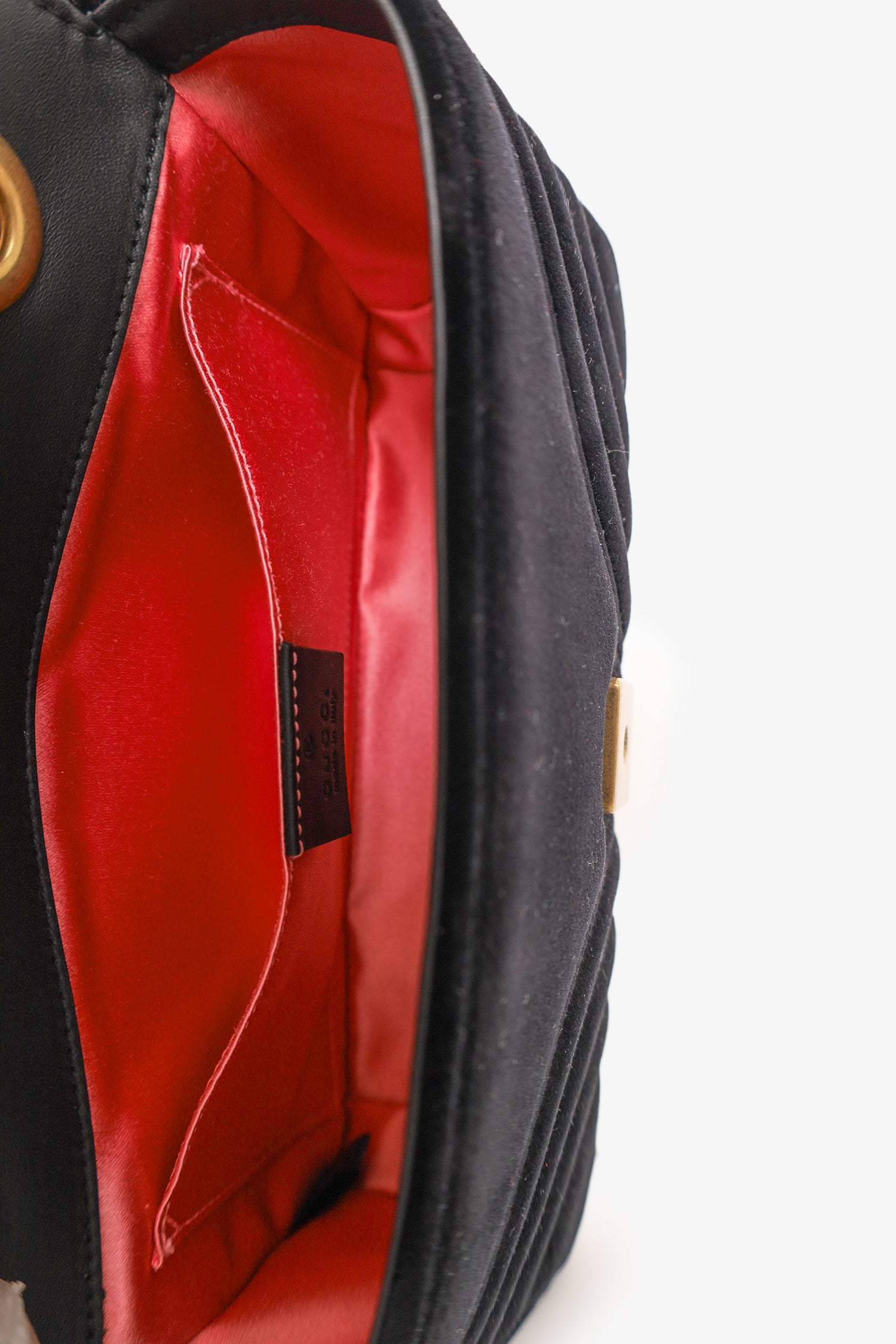 Refresh availabilityGucci Black Velvet Mini GG Marmont Shoulder Bag. Contrasting pink satin interior. Front push-lock closure. Single interior slip pocket. Gold-tone hardware. Tonal stitching.