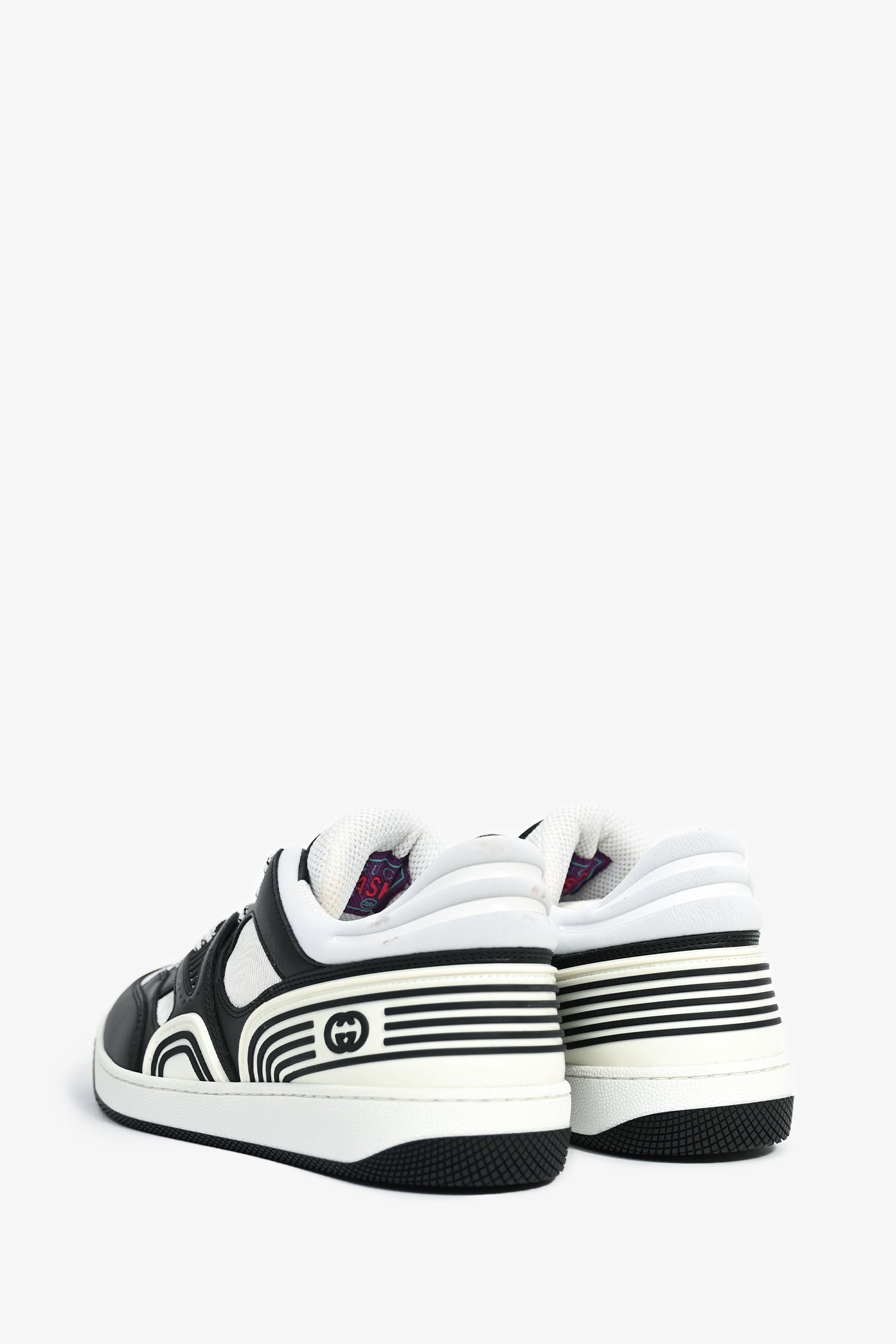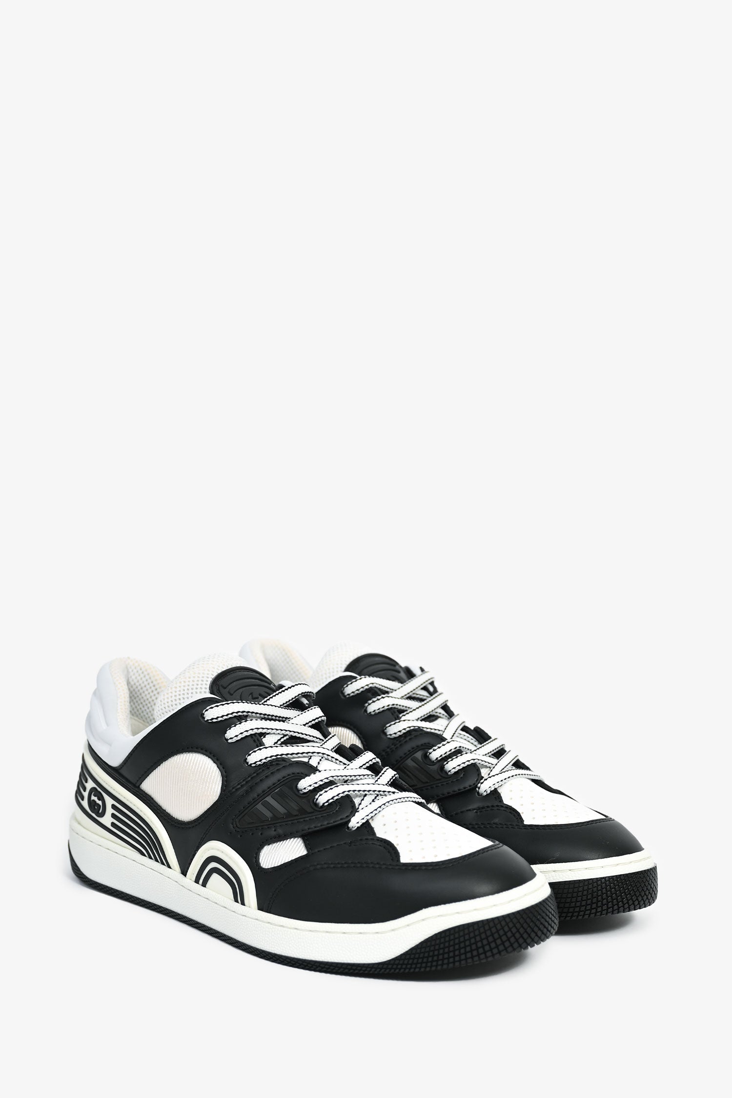 Refresh availabilityGucci Black/White Leather/Rubber 'Basket Low' Sneaker. Leather and rubber trimming. Cushioned interior. Rubber soles. Tonal stitching.