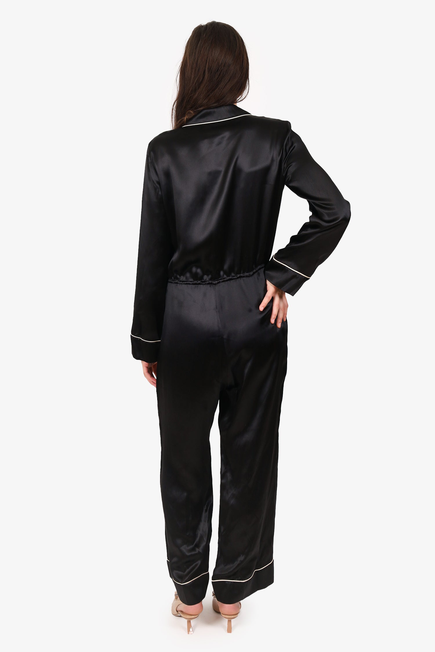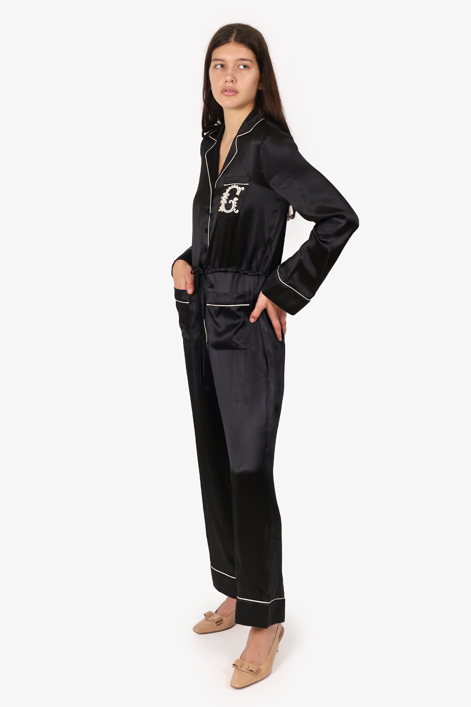 Refresh availabilityGucci Black/White Silk 'G' Monogrammed Jumpsuit. Slip on. V-neckline. Front button-up and waist-tie closure. 3 exterior slip pockets: 1 chest, and 2 waist. Contrast and tonal stitching.
