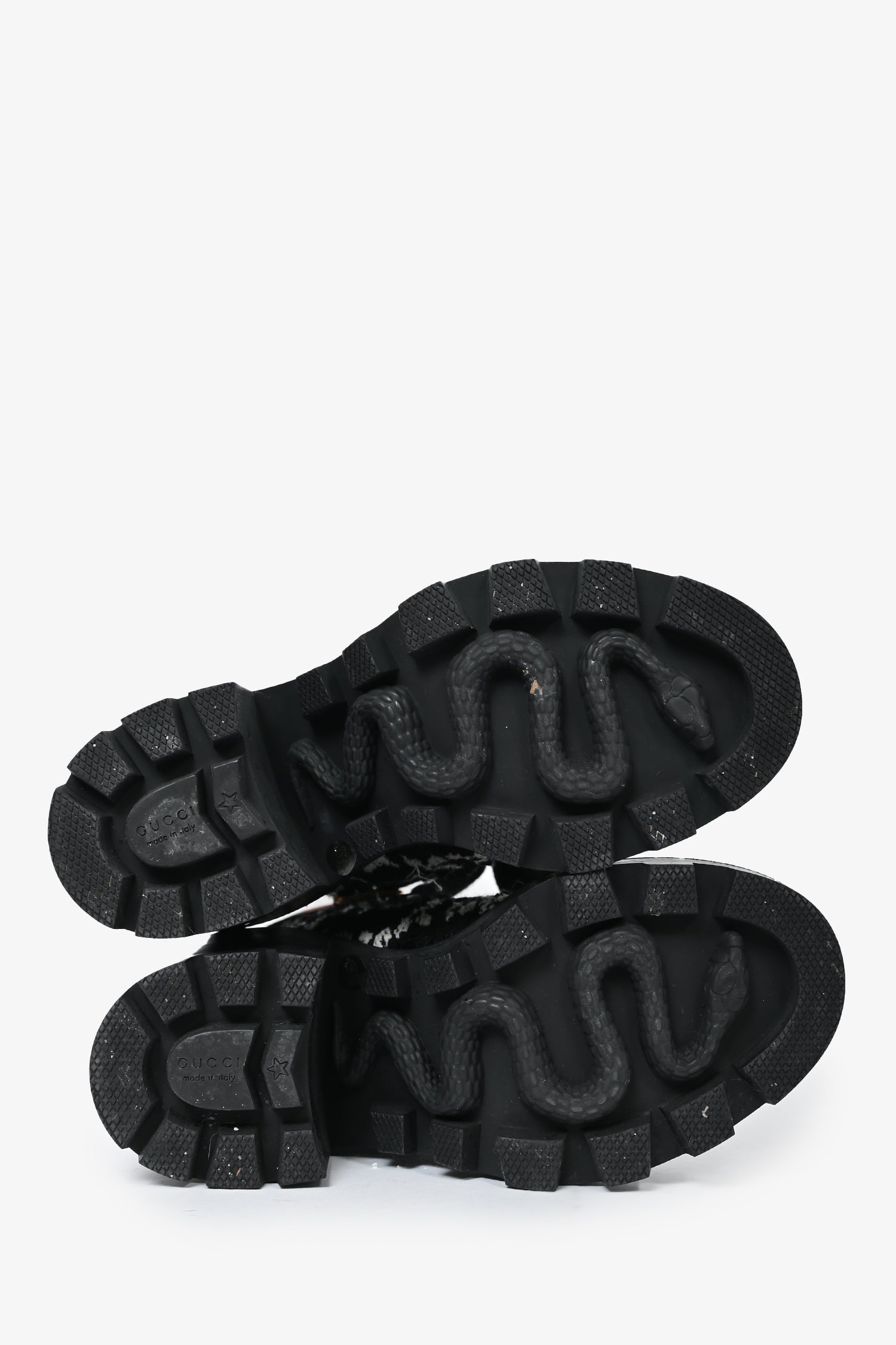 Refresh availabilityGucci Black/White Tweed Heeled Combat Boots. Lace-up front with gold-tone eyelets. Chunky block heel.