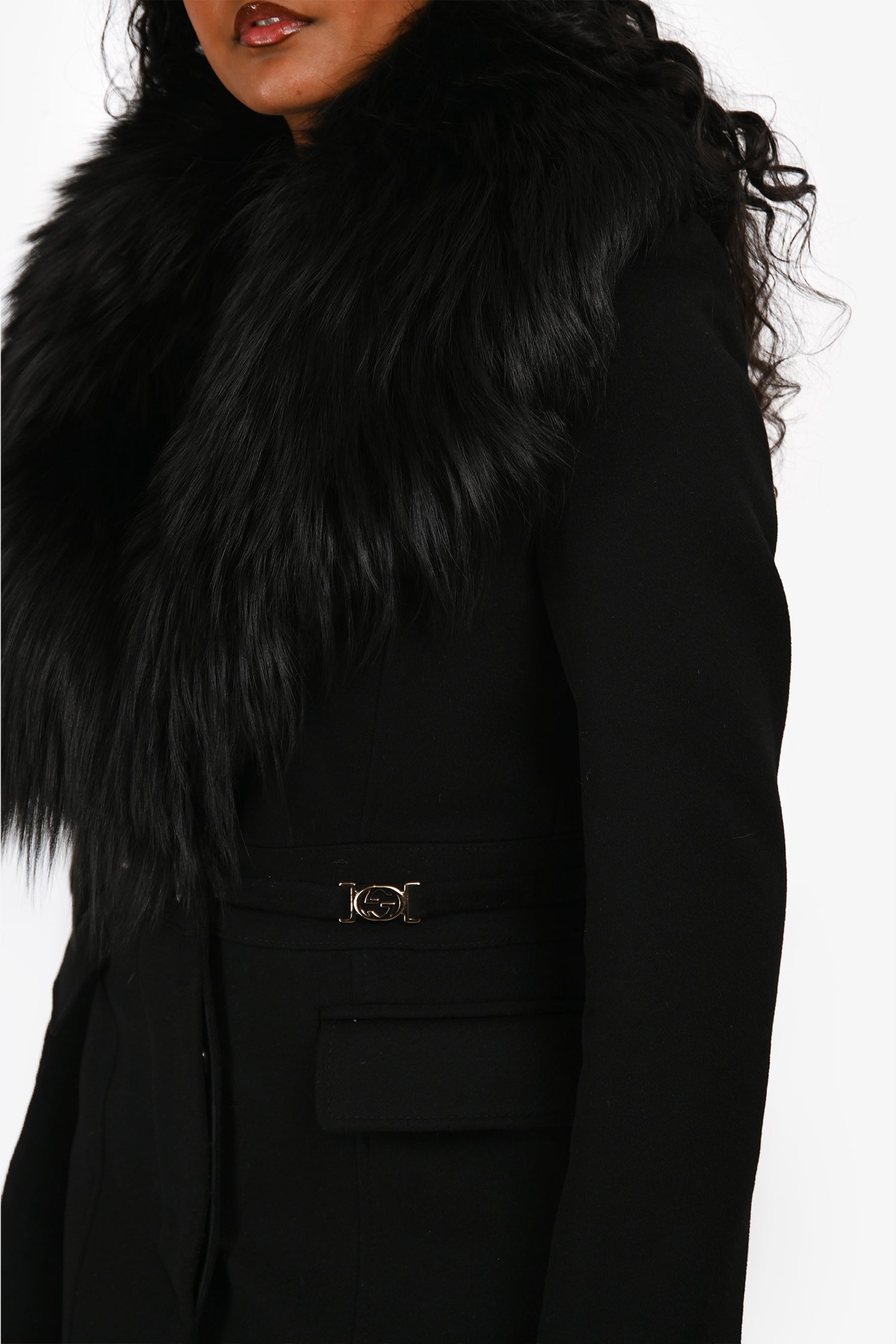 Refresh availabilityGucci Black Wool Midi Coat with Detachable Faux Fur Collar. Pull-on. Front button-up closure. Structured shoulders. 2 exterior flap pockets. Waistband belt detail. Lined interior. Gold-tone hardware. Tonal stitching.