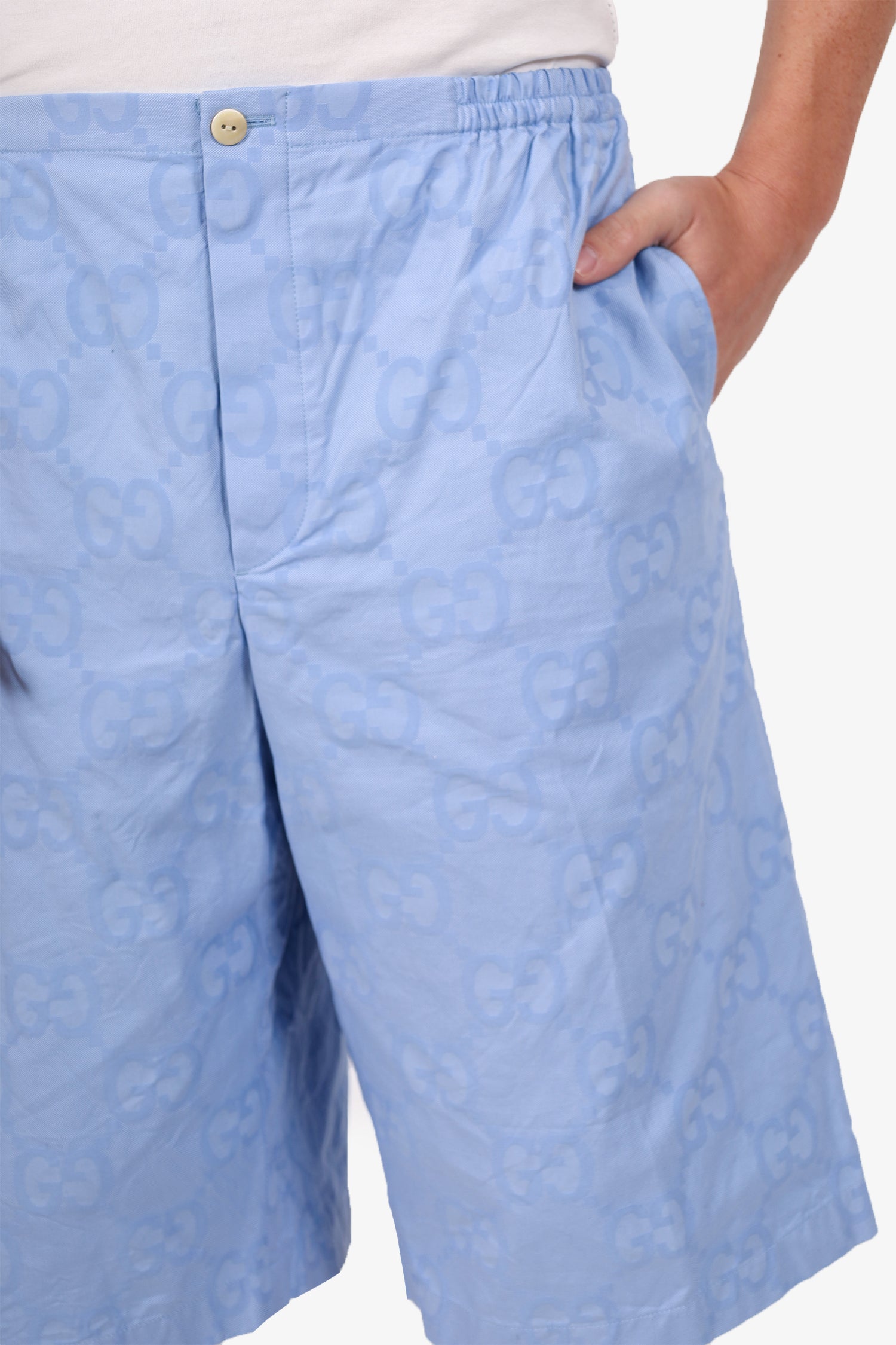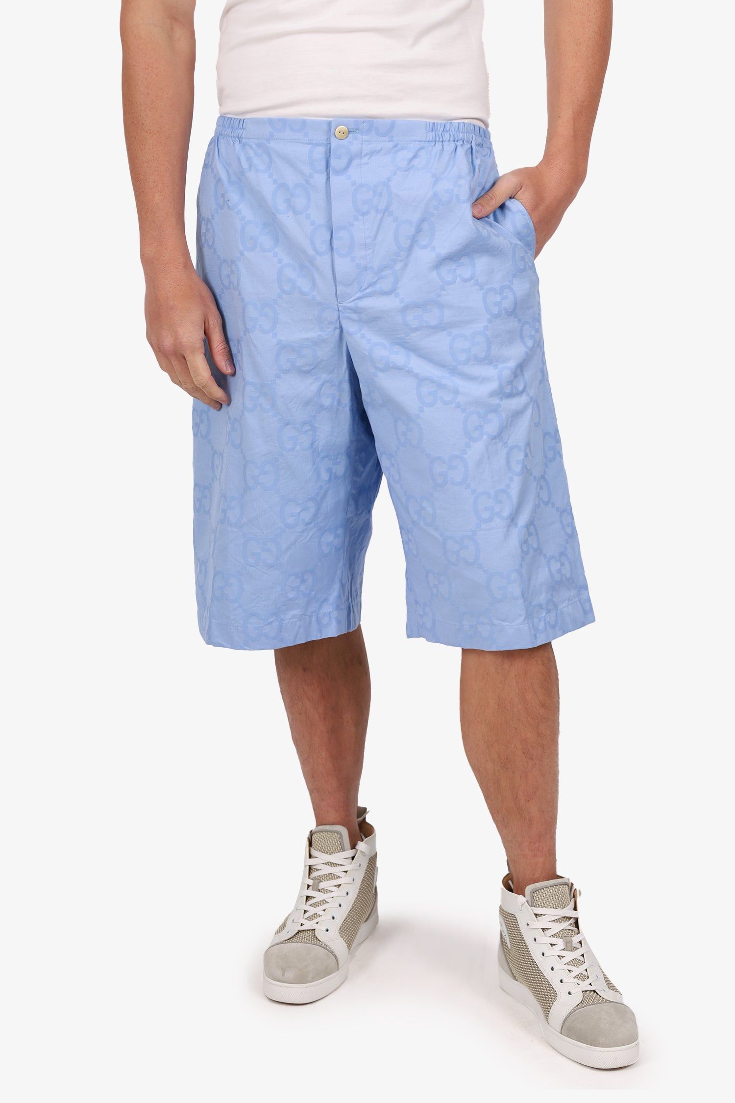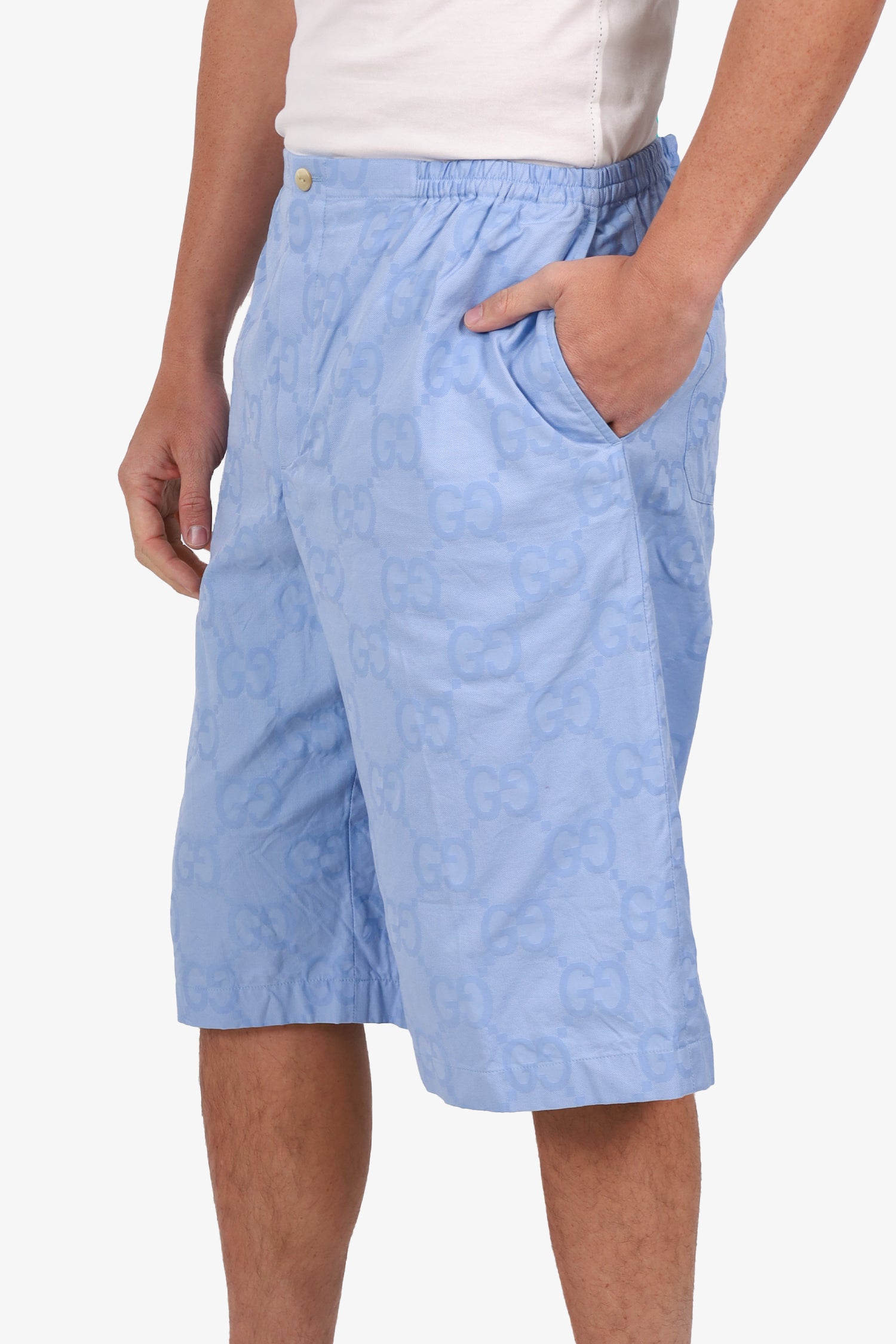 Refresh availabilityGucci Blue Cotton GG Monogram Shorts. Slip-on. Front button-up closure. Elasticated waistband. 3 exterior slip pockets; 2 side slip and 1 rear slip. Tonal stitching.