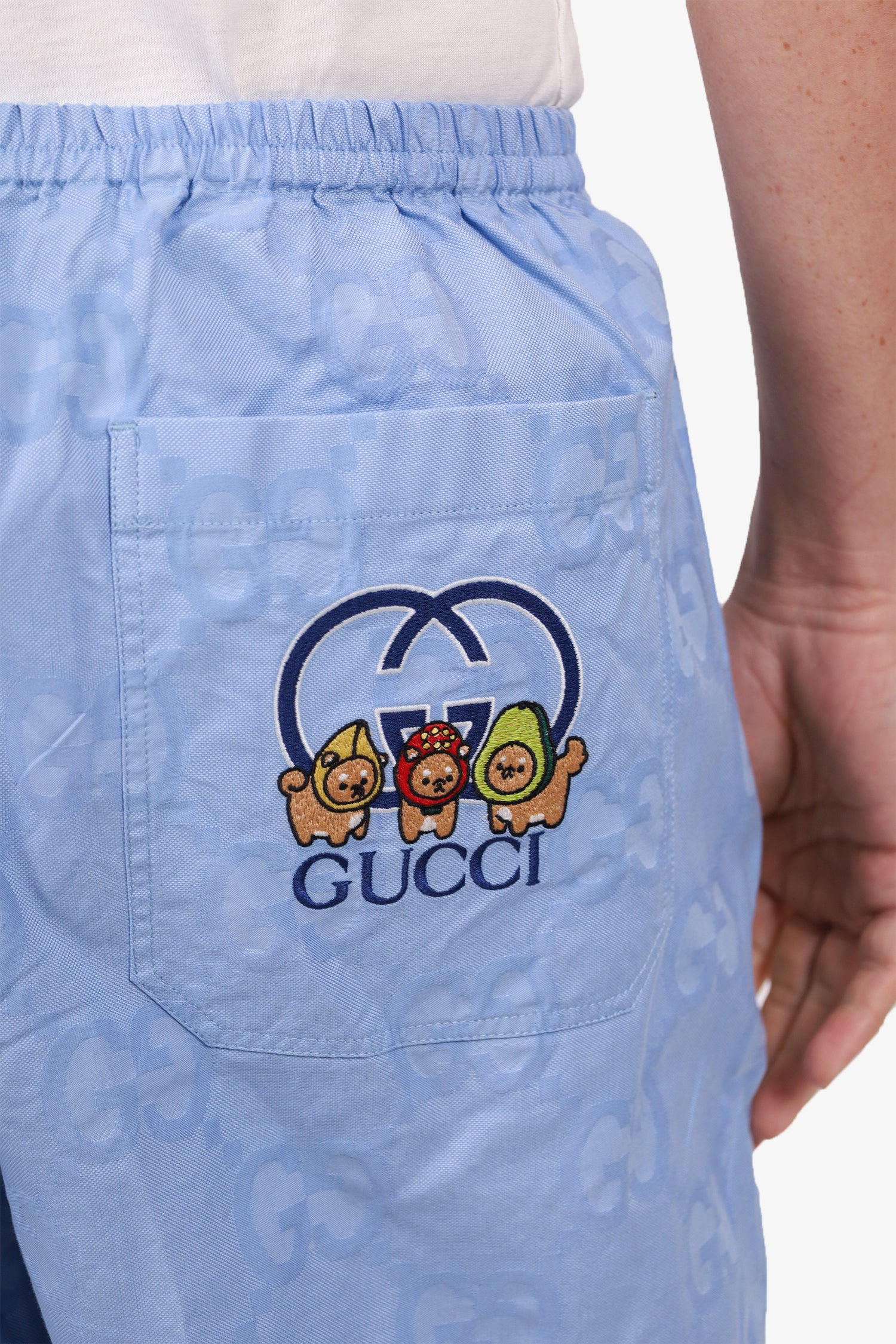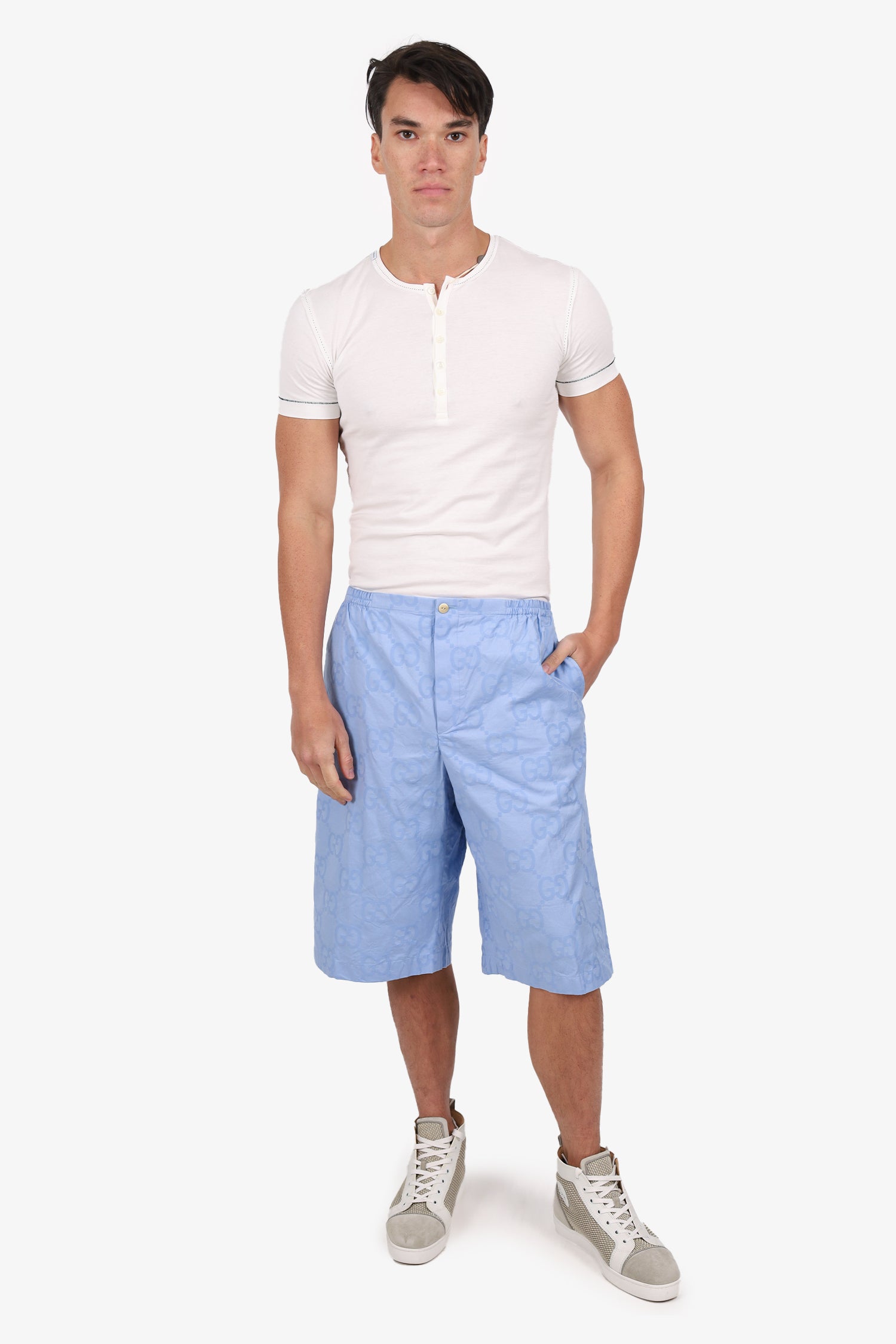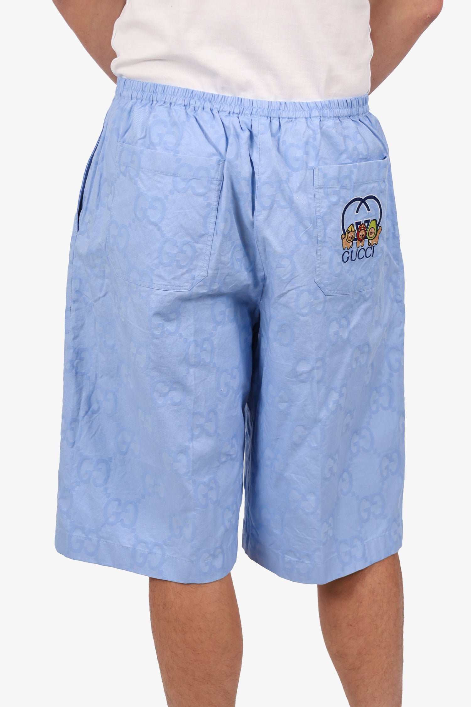 Refresh availabilityGucci Blue Cotton GG Monogram Shorts. Slip-on. Front button-up closure. Elasticated waistband. 3 exterior slip pockets; 2 side slip and 1 rear slip. Tonal stitching.