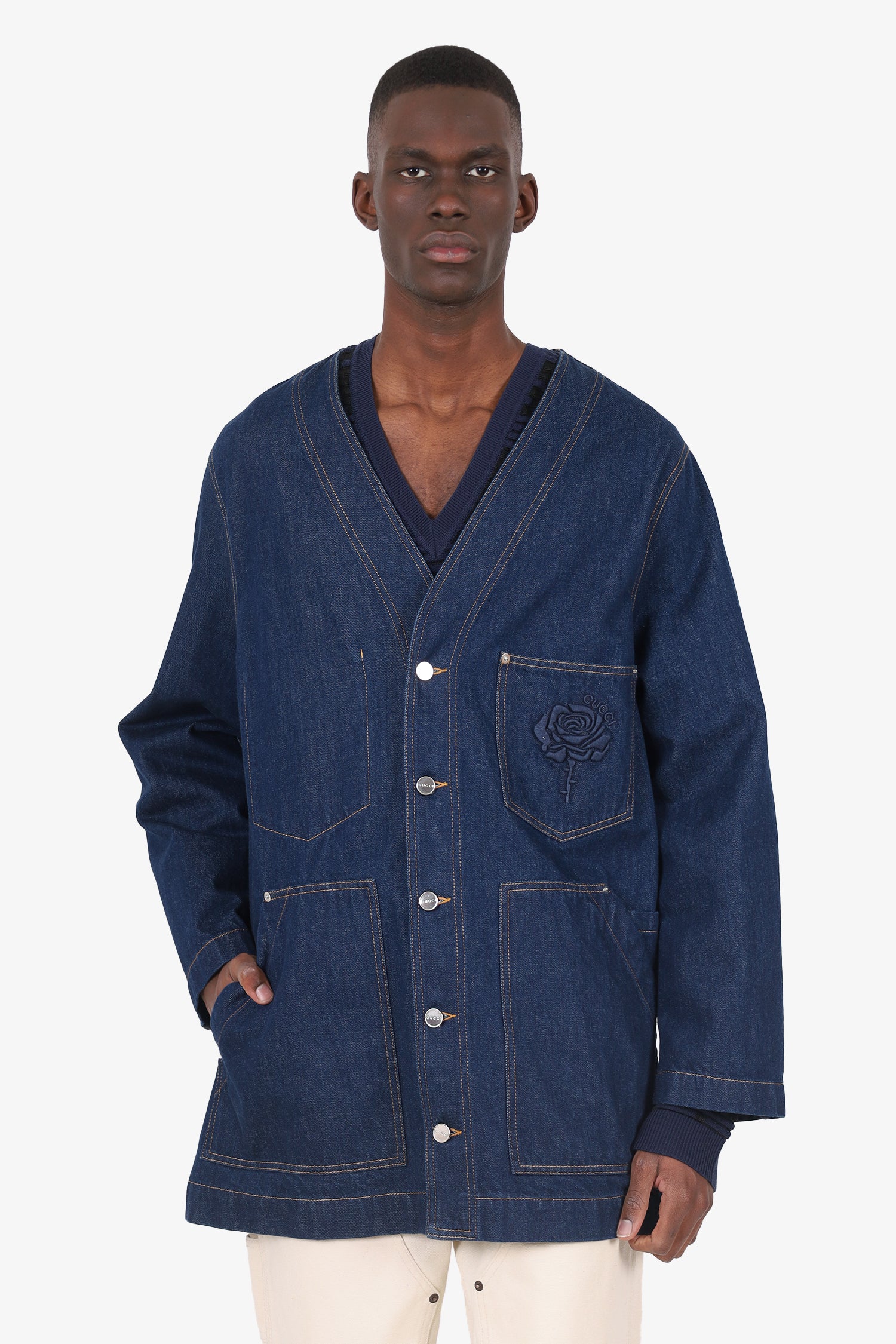 Refresh availabilityGucci Blue Denim Rose Embroidery Kimono Jacket. Pull-on. V-neckline. Front button-up closure. 4 exterior slip pockets; 1 chest, and 3 front. Single interior slip pocket. Silver-tone hardware. Contrast stitching.