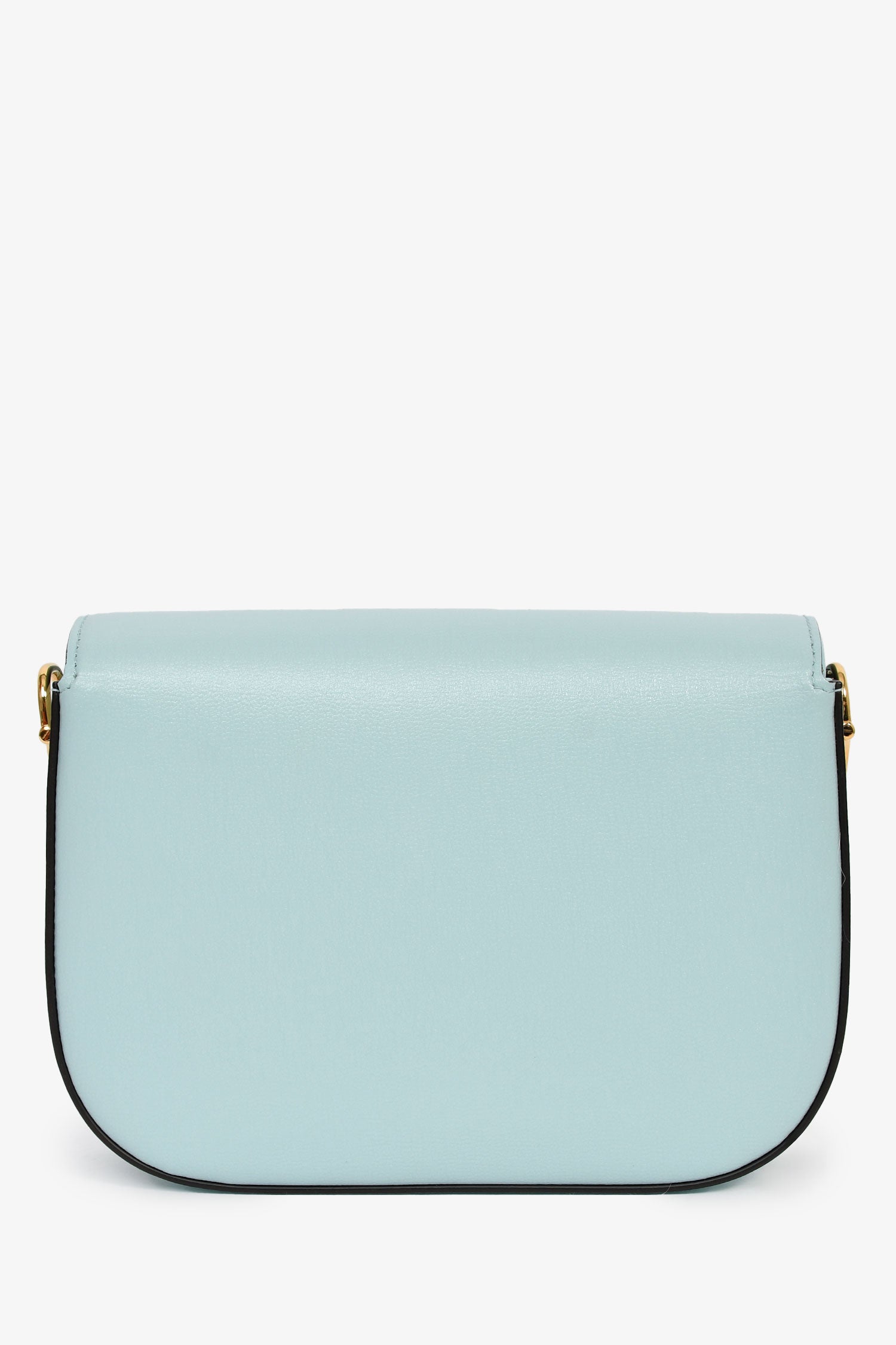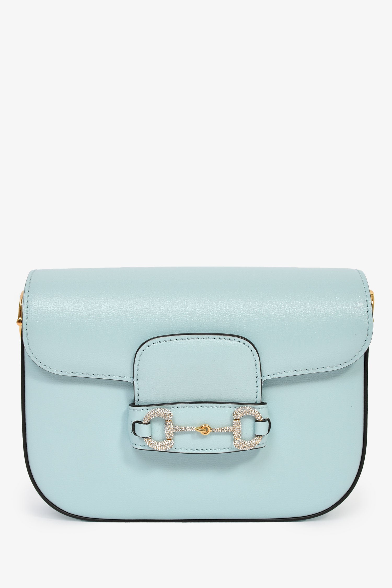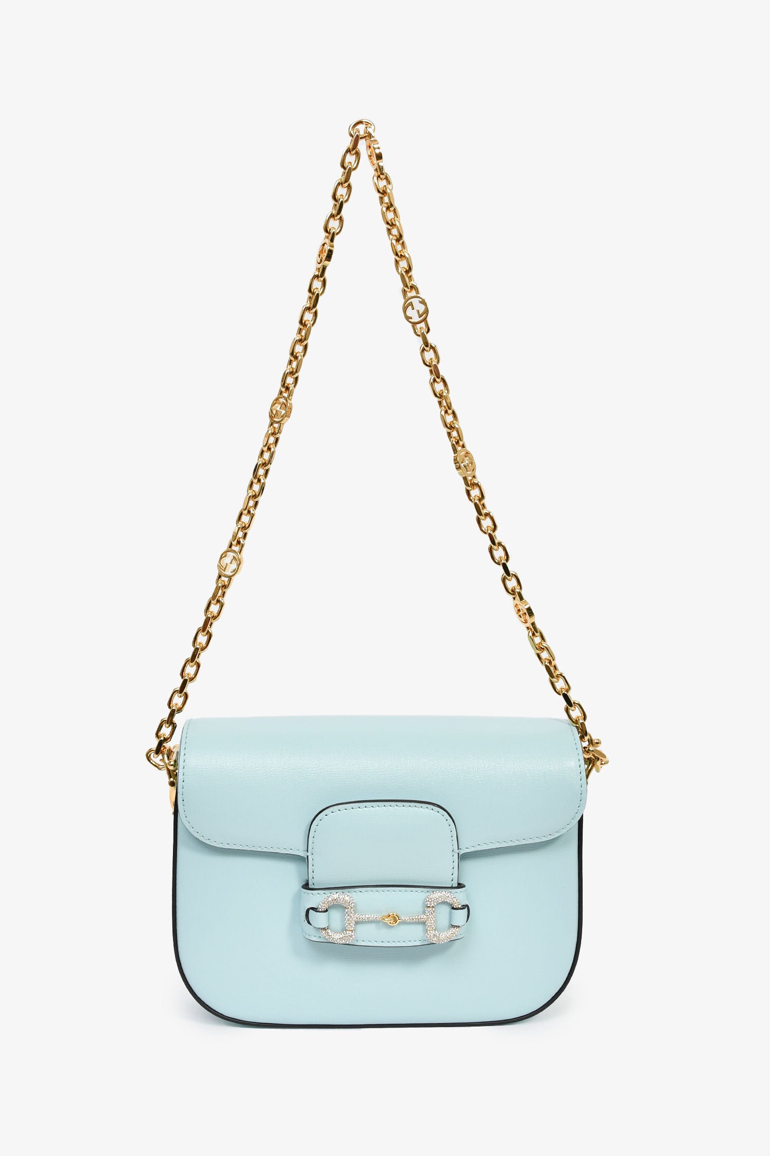 Refresh availabilityGucci Blue Leather Crystal Horsebit 1955 Mini Shoulder Bag. Front fold-over flap with a slip-compartment. Chain-link shoulder strap. Lined canvas interior. Gold-tone hardware. Tonal stitching.