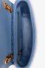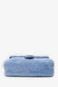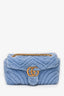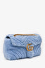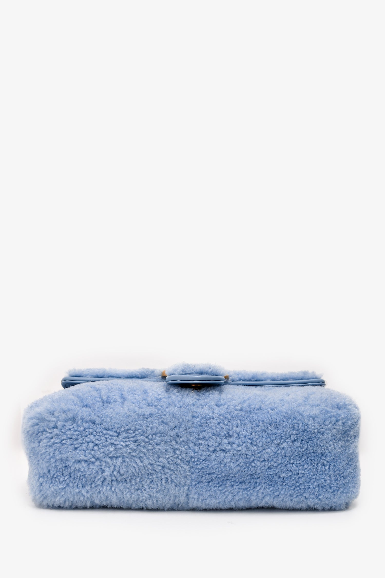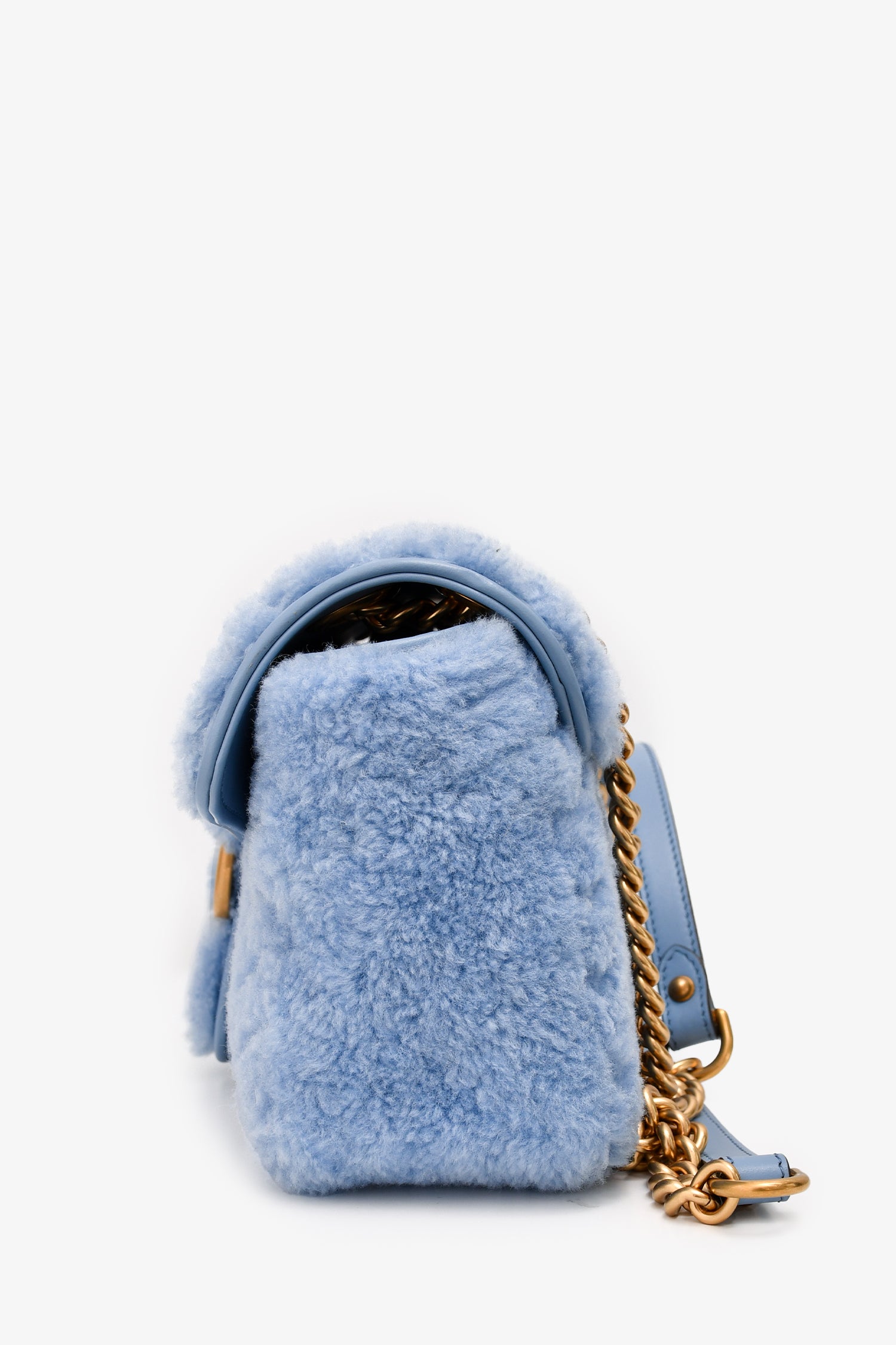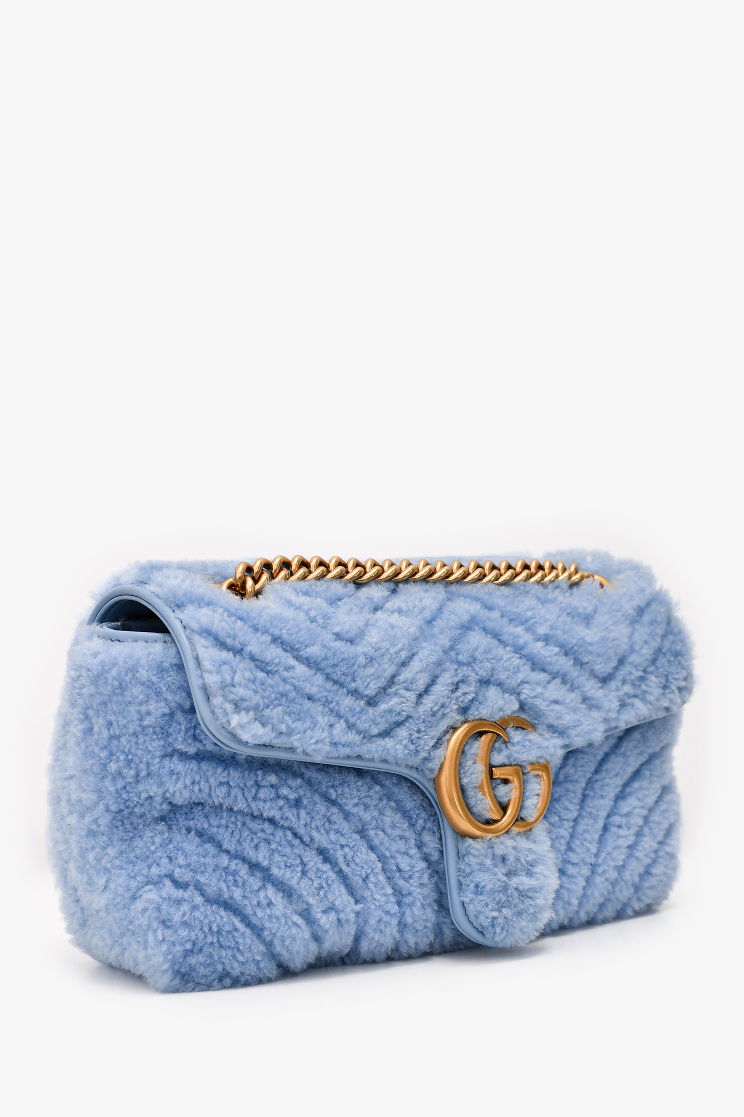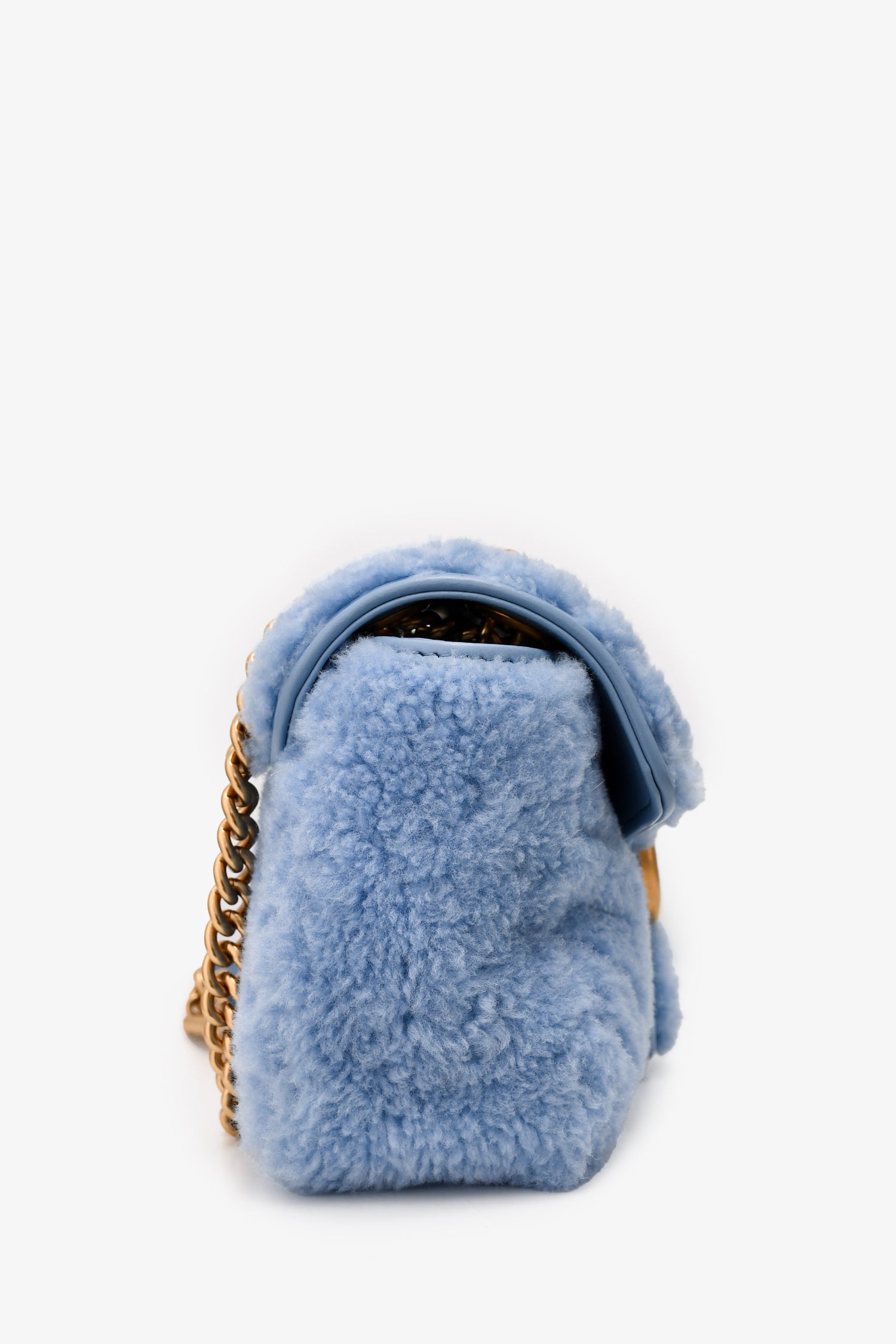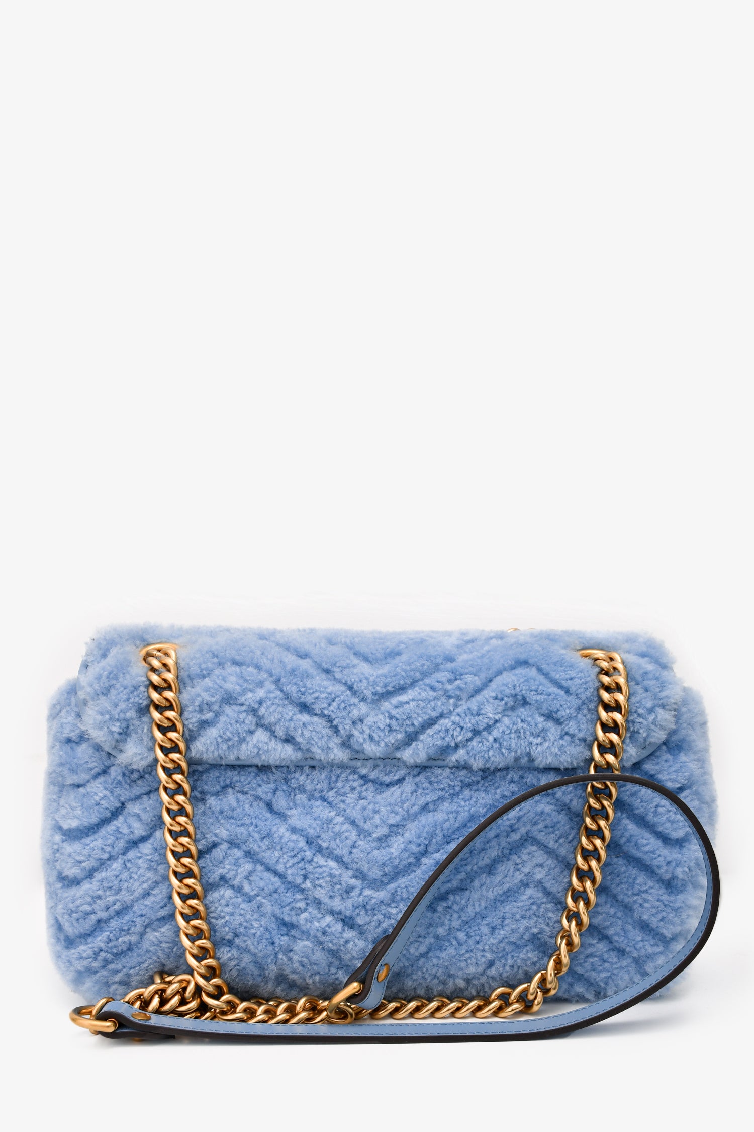 Refresh availabilityGucci Blue Shearling Marmont Shoulder Bag. Antiqued gold-tone hardware. Leather trimming. Fold-over flap with push open closure. Chain-link shoulder strap with leather accents. Lined interior. Zipped compartment.