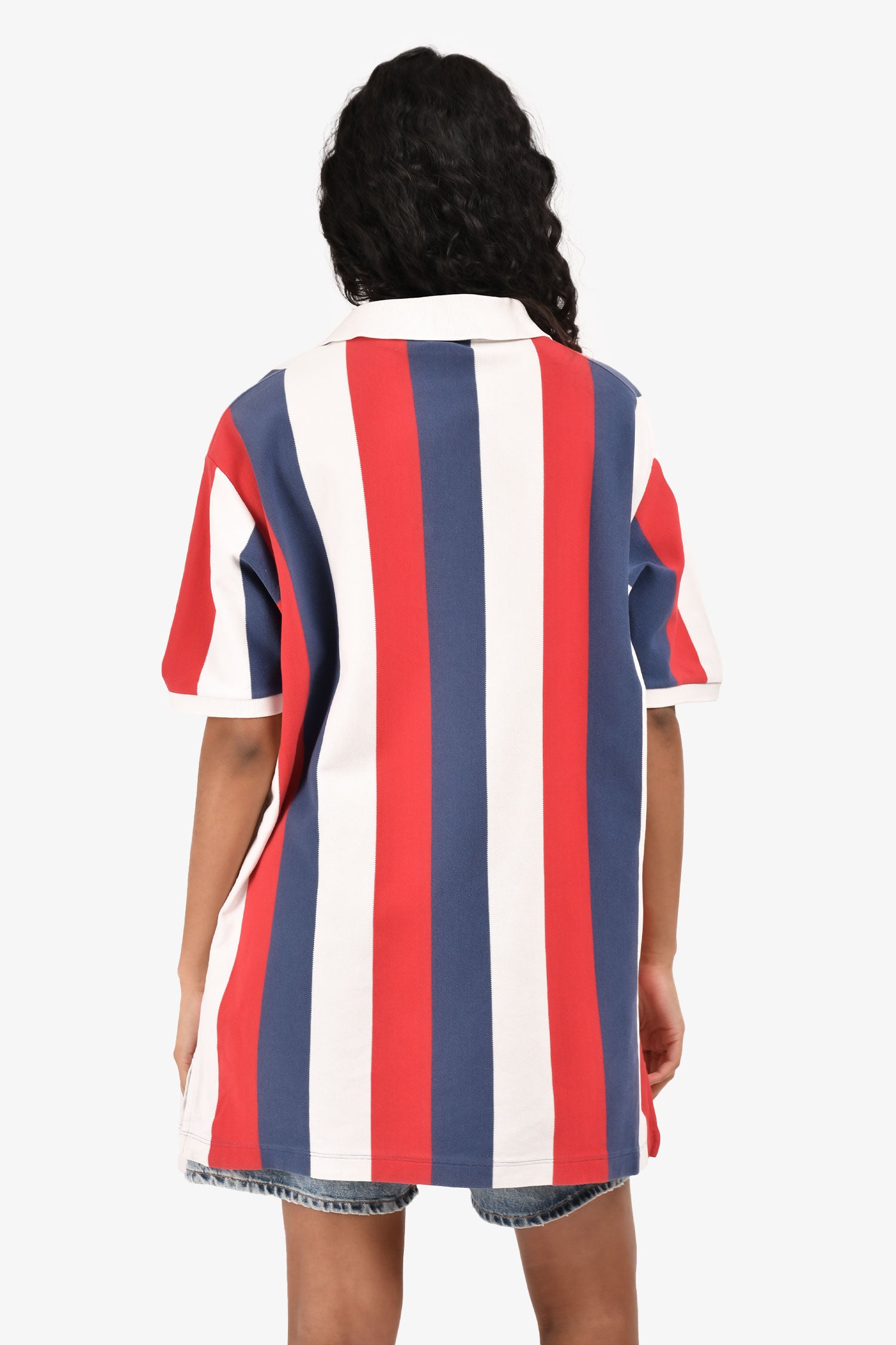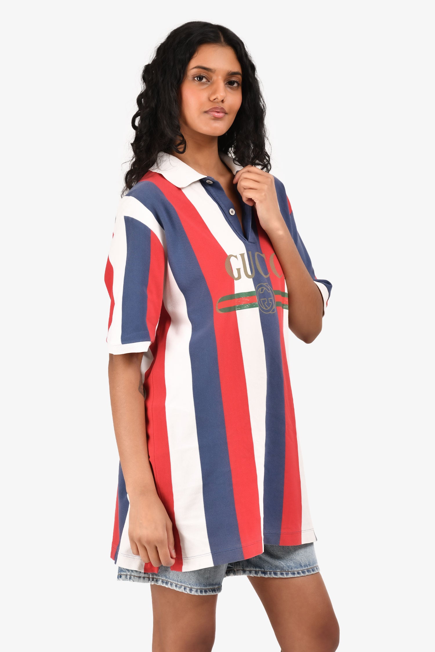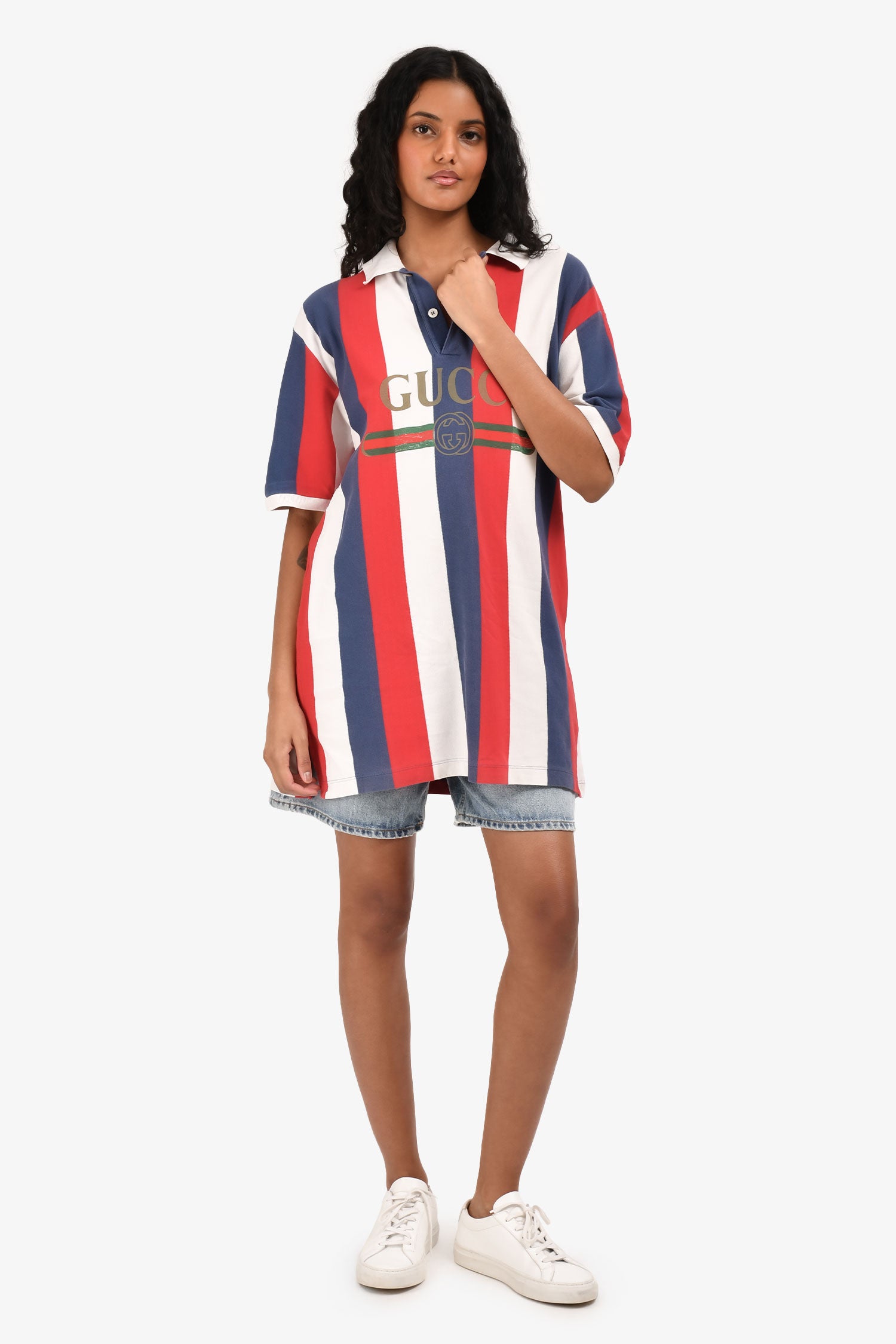 Refresh availabilityGucci Blue/White/Red Striped Logo Polo Shirt. Top button-up. Ribbed collar and cuffs. Tonal stitching.