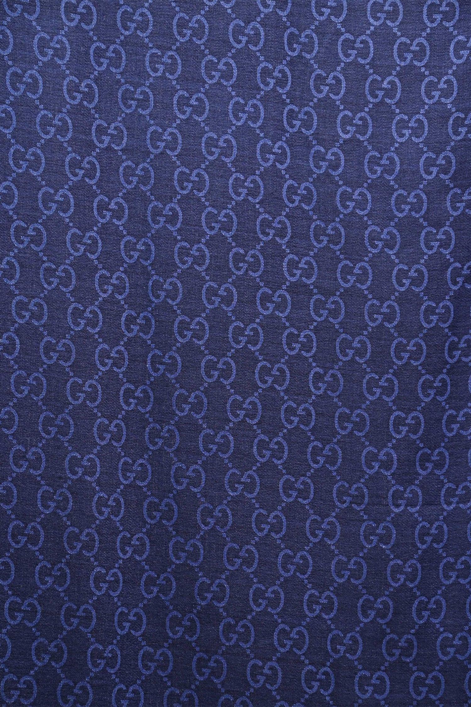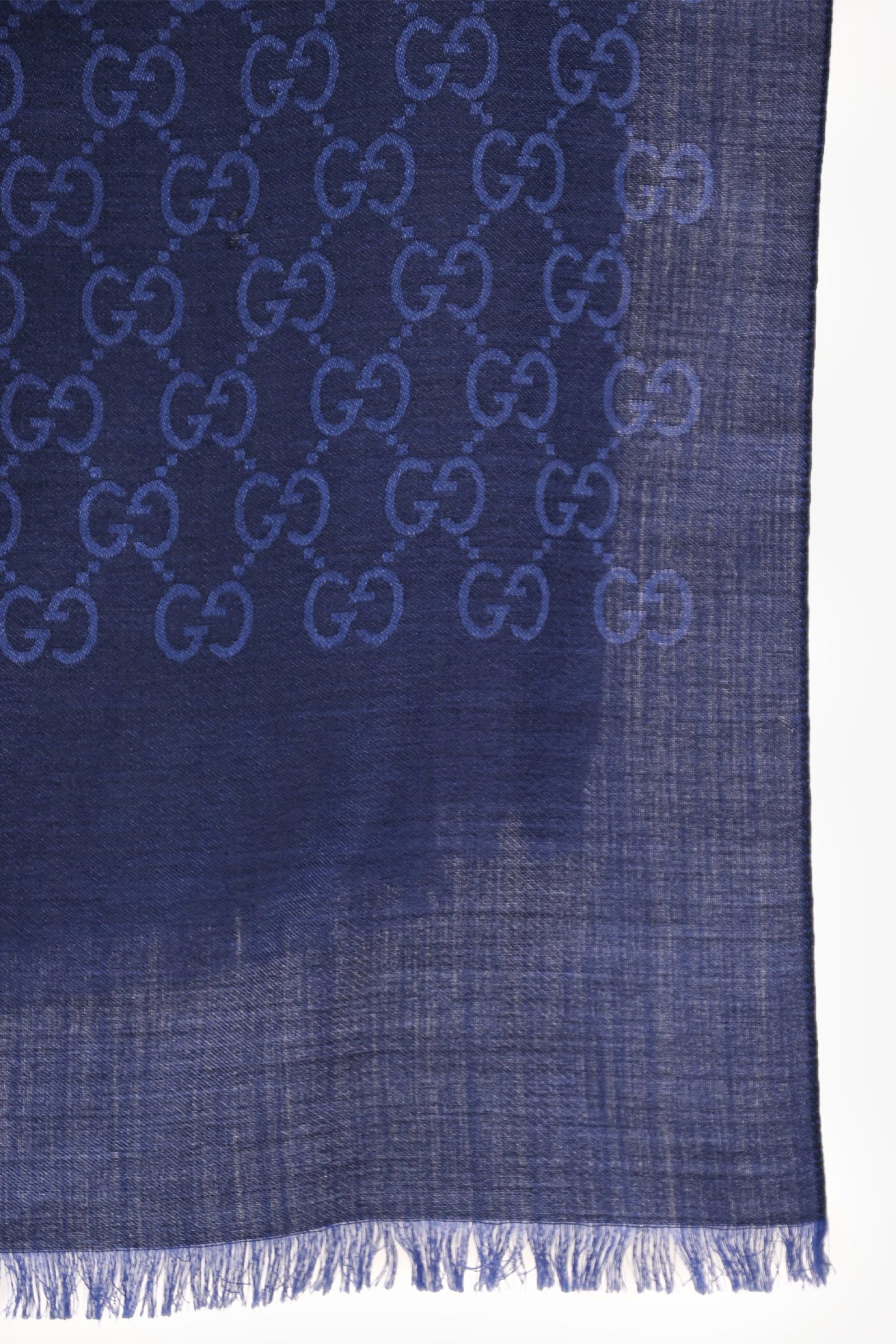 Refresh availabilityGucci Blue Wool Silk Blend Monogram Shawl. Fringed edges. Soft, lightweight fabric. Tonal stitching.