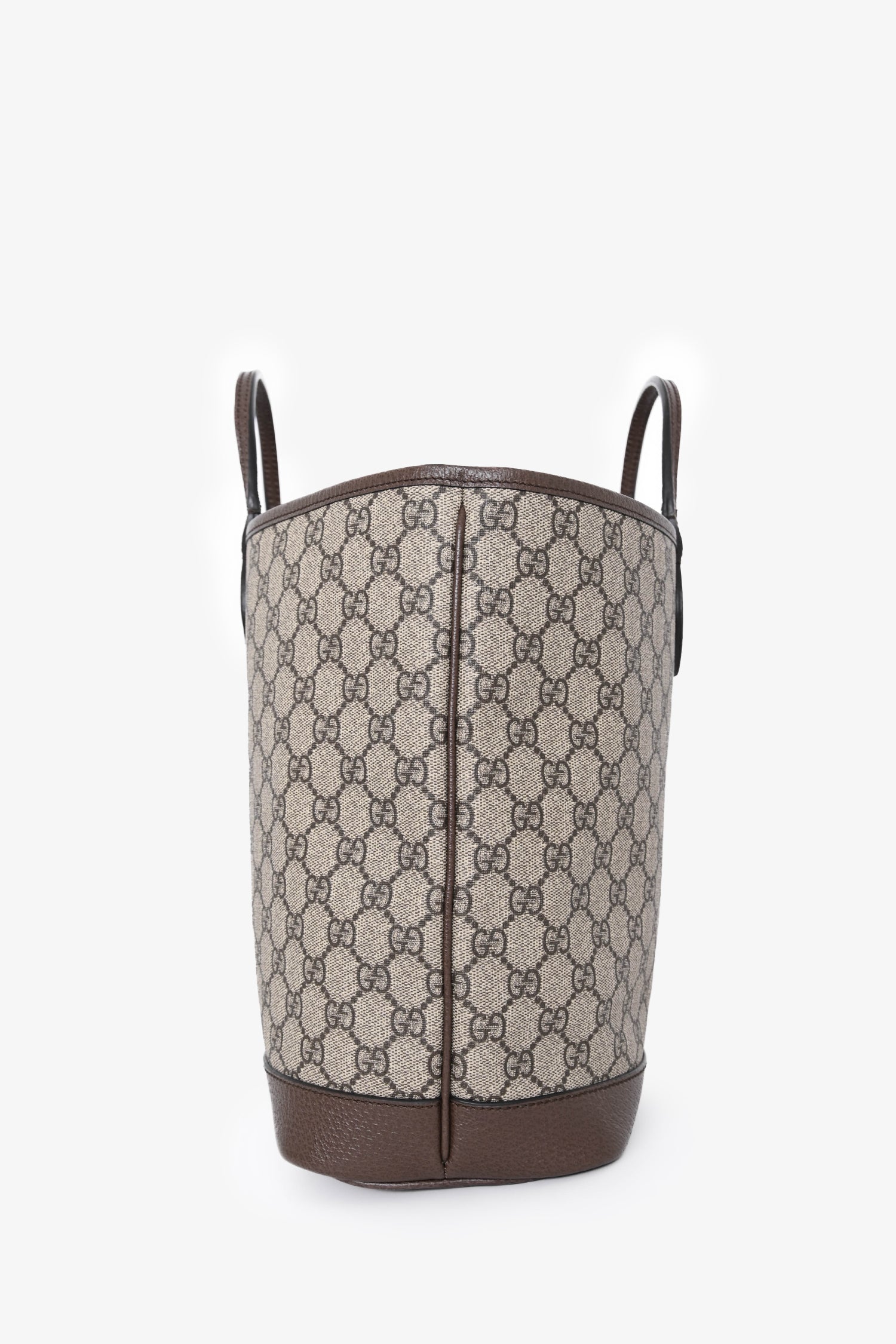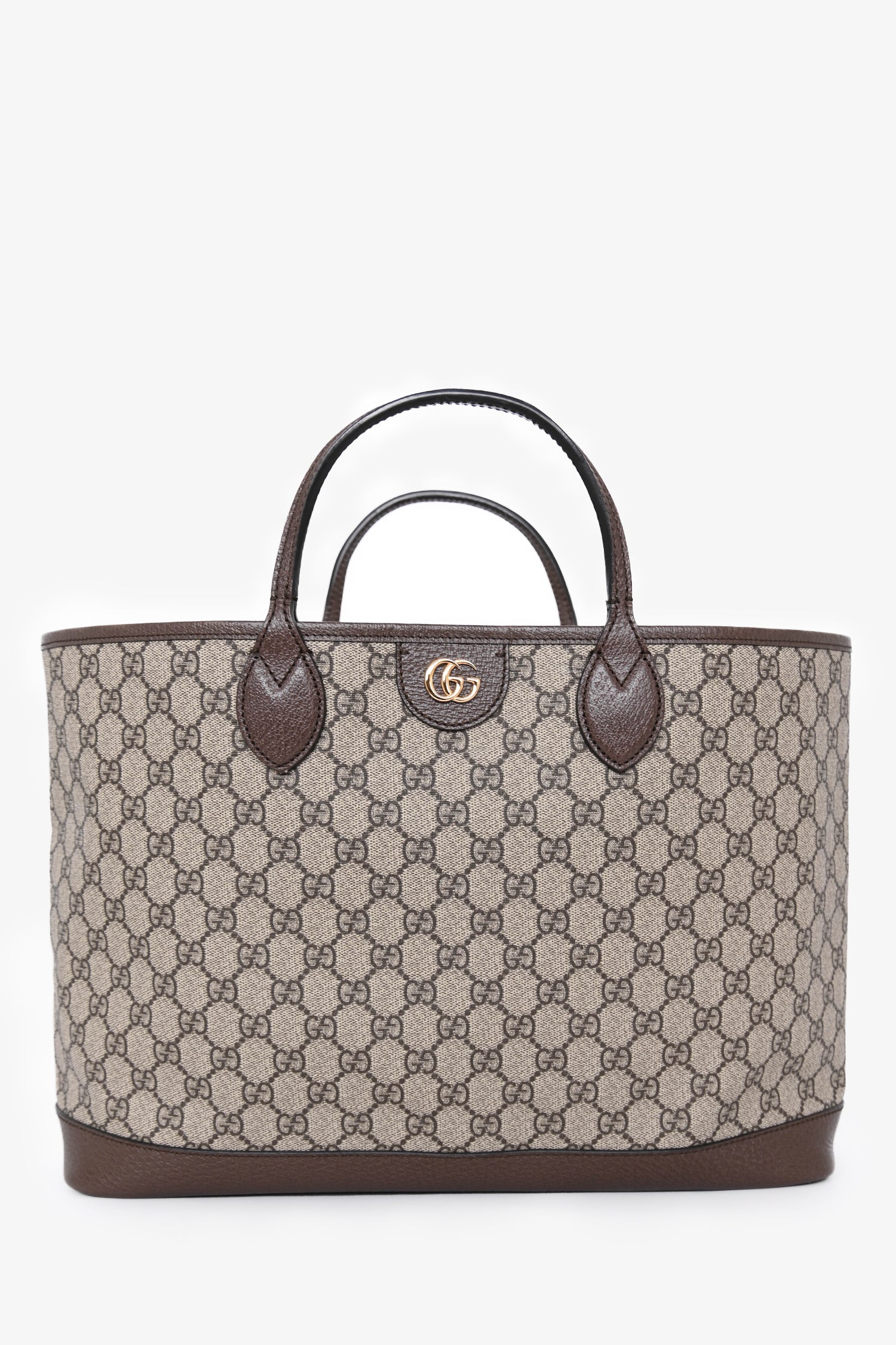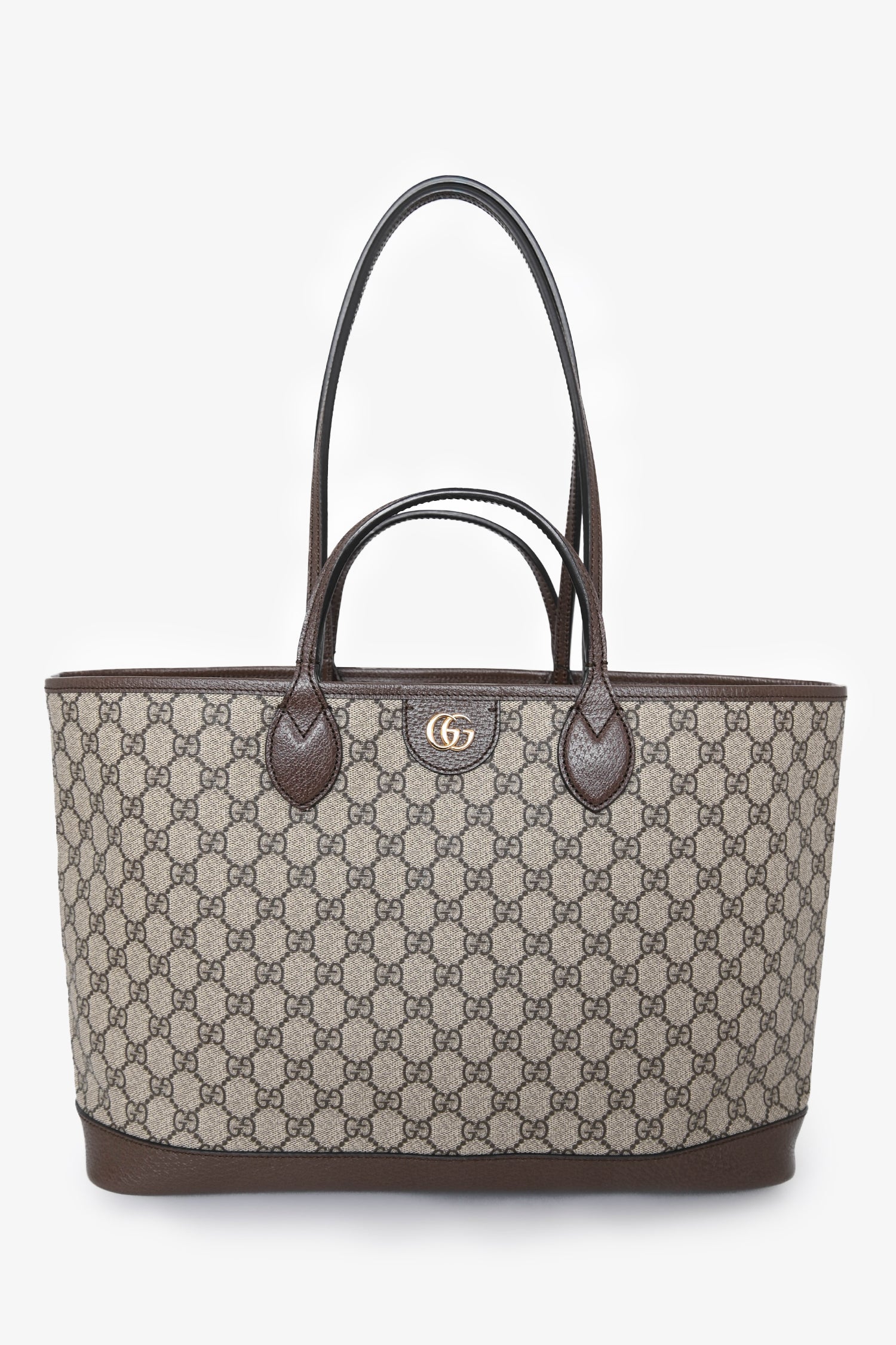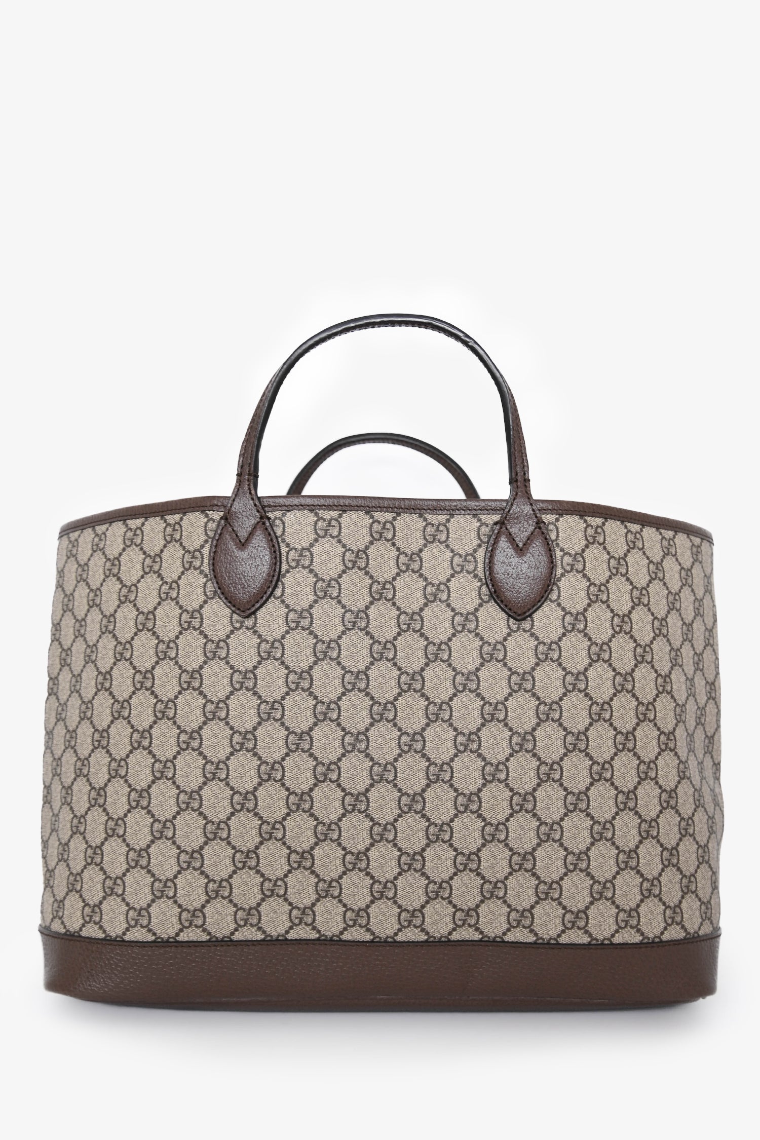 Refresh availabilityGucci Brown Canvas GG Supreme Tote Bag with Double Handles. Open top. Twin shoulder straps. Twin top handles. Single interior compartment. Gold-tone hardware. Tonal stitching.