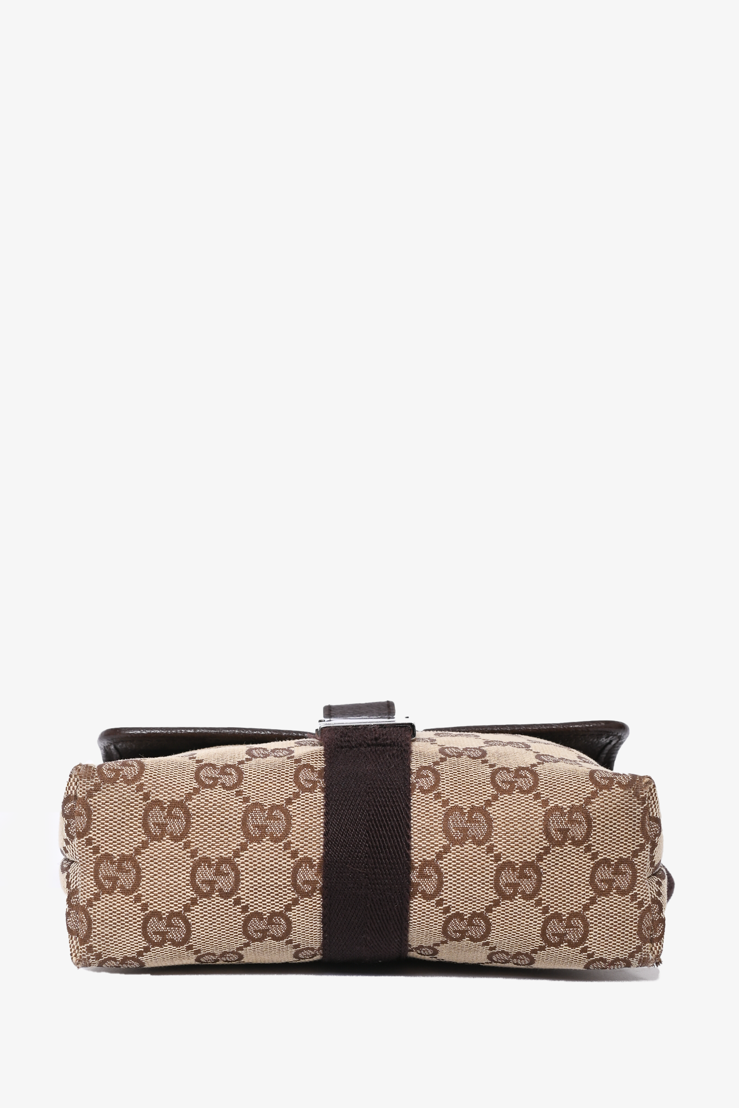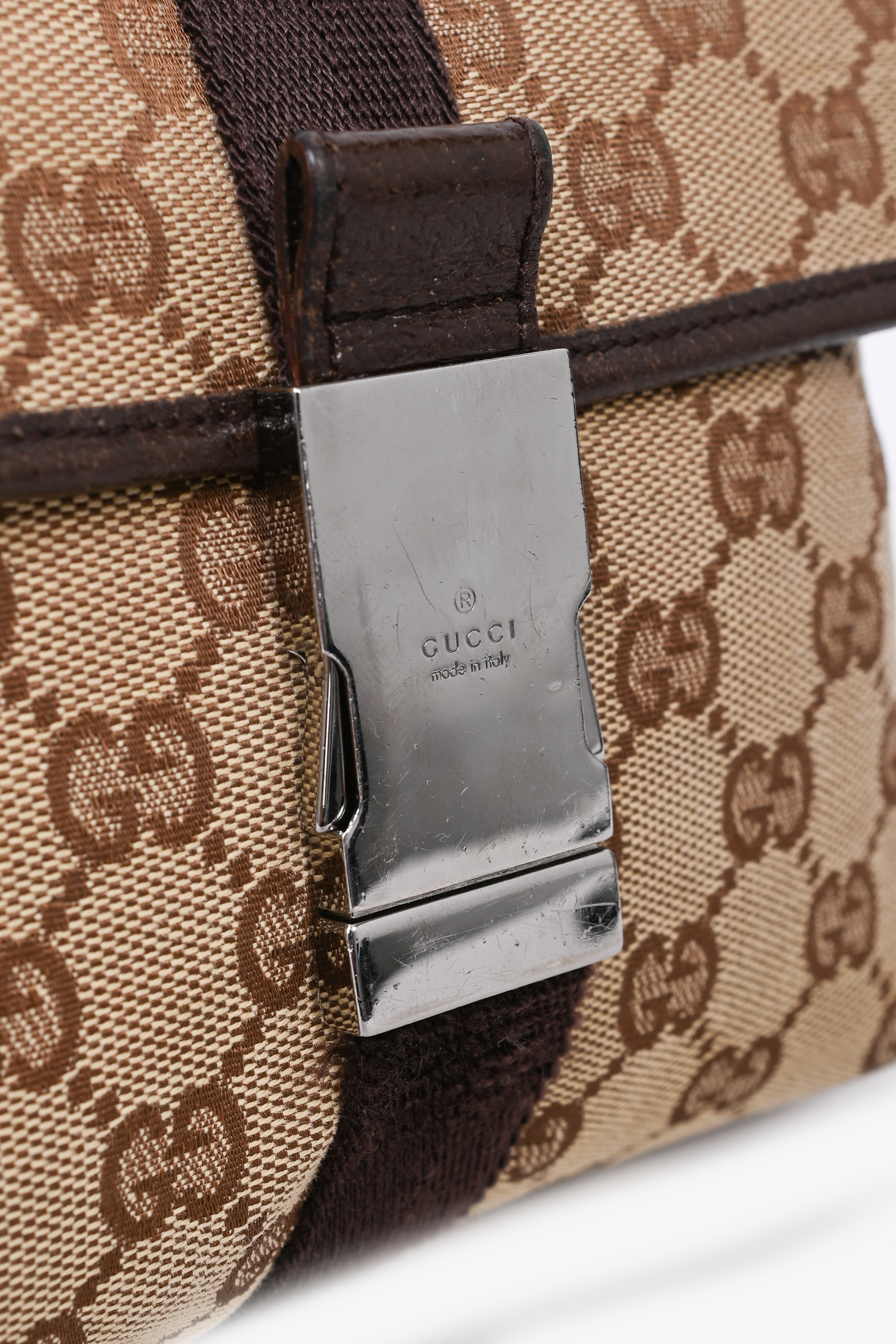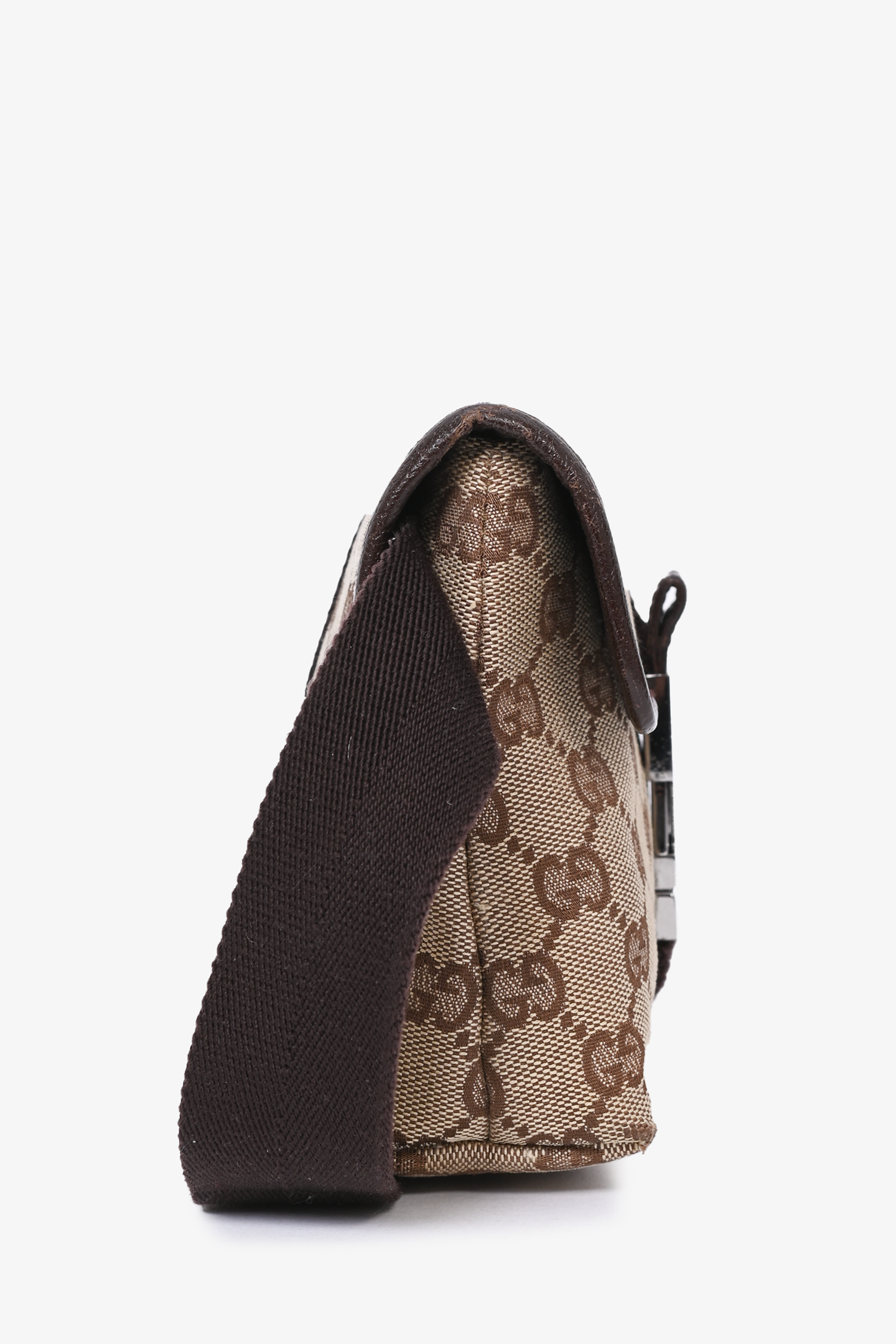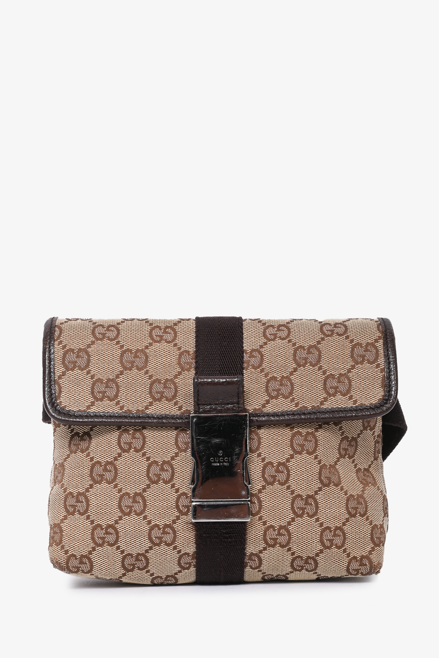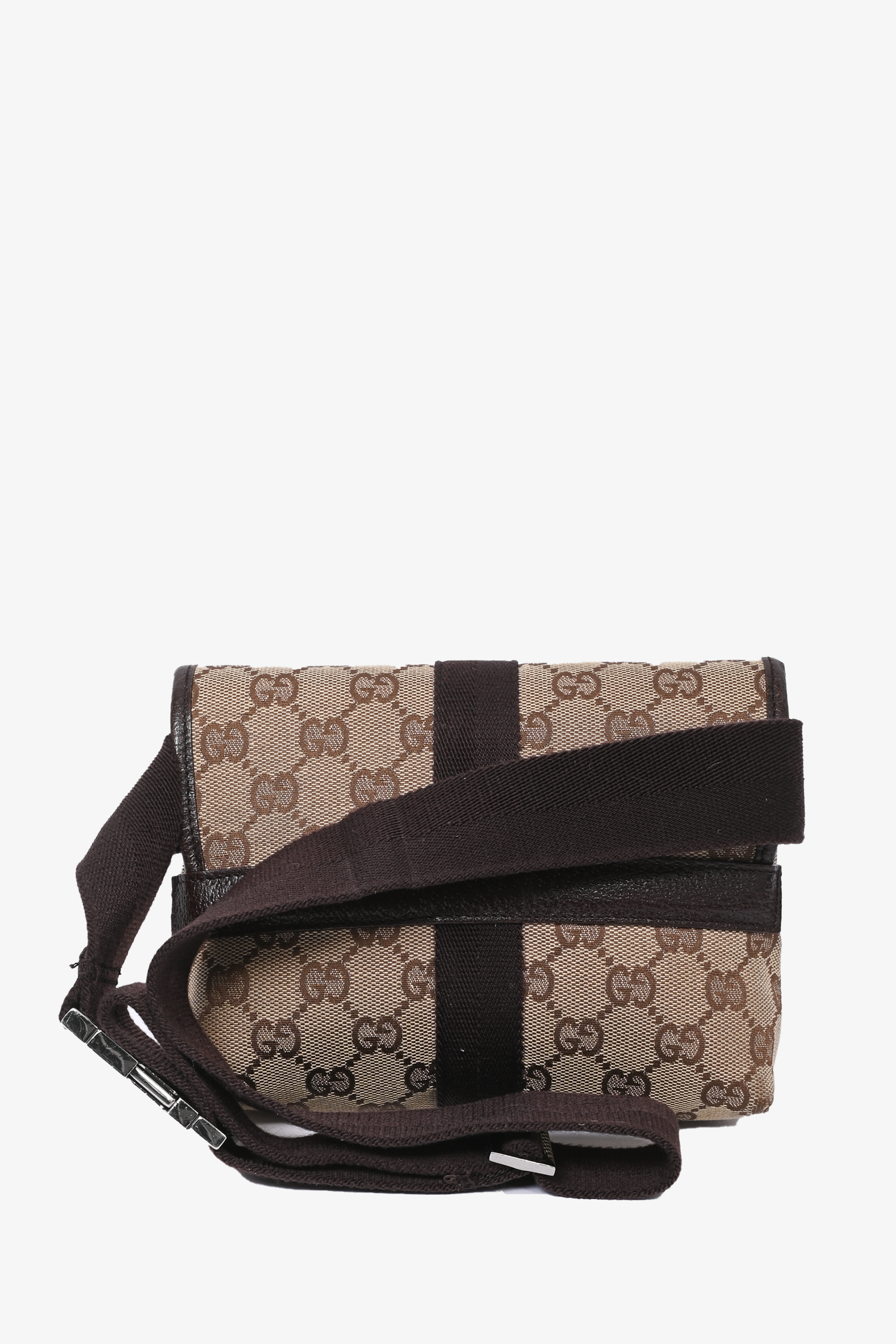 Refresh availabilityGucci Brown Guccisima Canvas Belt Bag. Fold over flap with buckle closure. Silver-tone hardware. Tonal stitching.